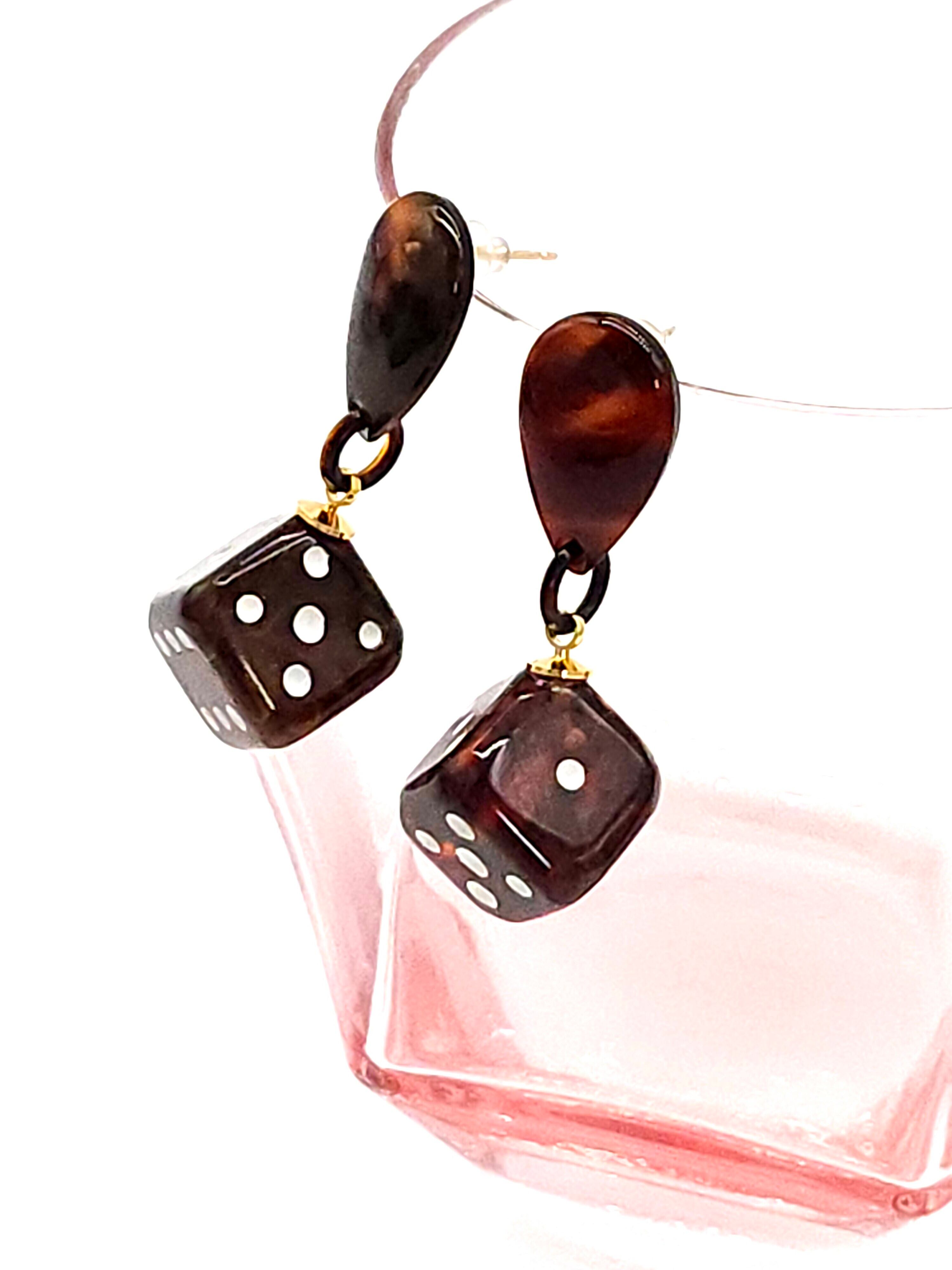 サイコロ型の琥珀 を大きめしずく型のべっ甲パーツに下げたとても可愛くユニークなピアス。琥珀 の全面に穴をあけカシュー漆でサイコロの目を入れました。遊び心のあるオーガニックなアイテムをお楽しみください。直結ブラ下がりタイプですので耳元でユラユラと輝きのあるアイテムです。金メッキされていますがチタン製のニッケルフリーのためアレルギーの方にも安心してご使用頂けます。商品はこちらの梱包にて大切に発送致します。天然素材の為、色目やサイズ感は多少異なる場合がございます。※べっ甲及び琥珀 等の天然素材はすべて本物です。通常希望価格¥22,000