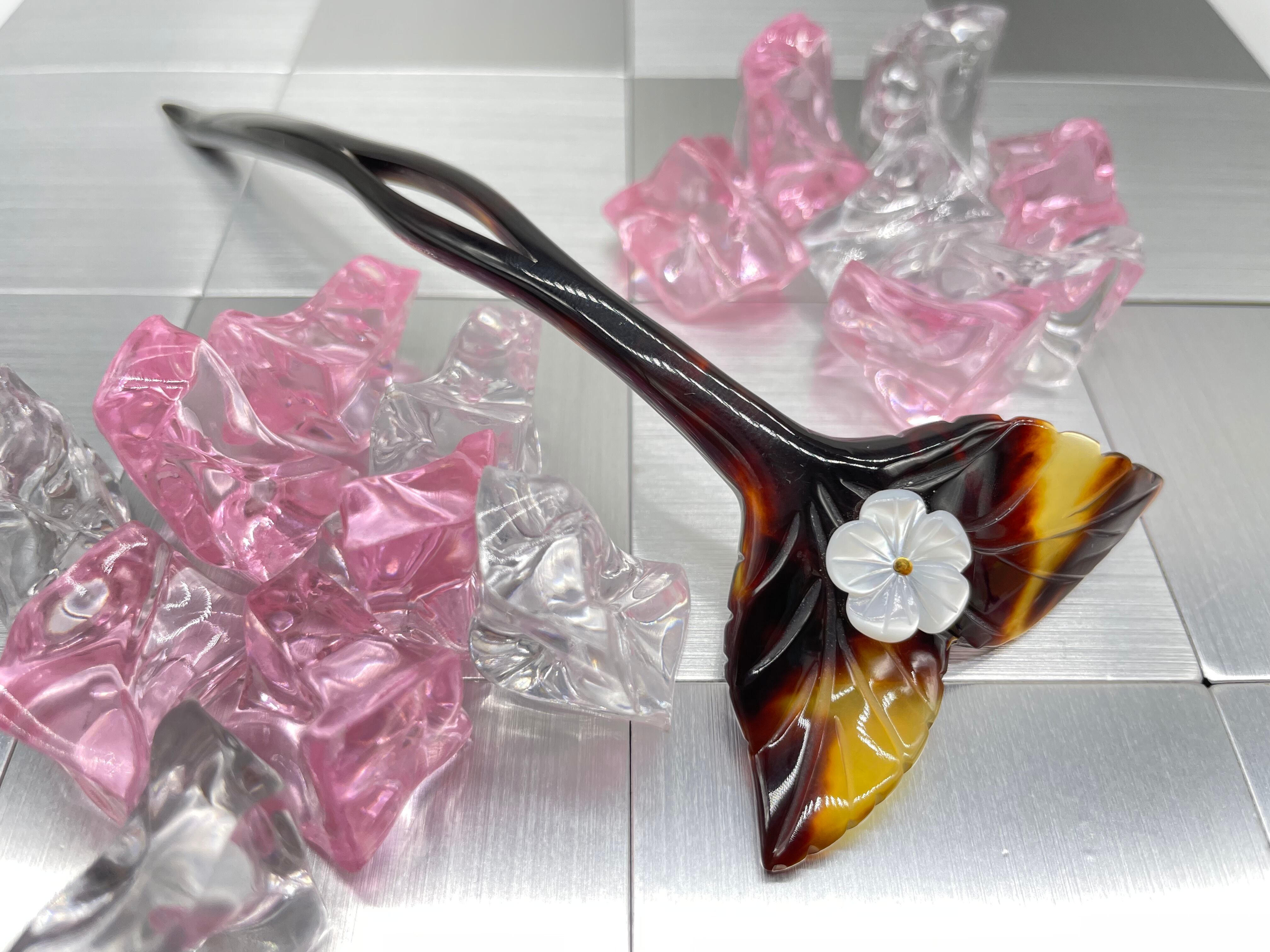 花の形をした白蝶貝を本べっ甲簪に取り付けた商品です。こちらはべっ甲簪を葉っぱ型のデザインにして、お洒落なデザインに仕上げました。べっ甲の簪としてはお値段もお手頃で大人気!浴衣やお着物にもピッタリの為、お祭りやお着物でのお稽古事にもおススメ。着物だけの固定観念を捨てて、お洋服に合わせて頂いても良いアクセントとなります。伝統工芸品、オーガニック素材の良さを味わって頂きたい一品です!商品はこちらの梱包にて大切に発送致します。天然素材の為、色目やサイズ感は多少異なる場合がございます。※べっ甲及び琥珀等の天然素材はすべて本物です。通常希望小売価格¥22,000