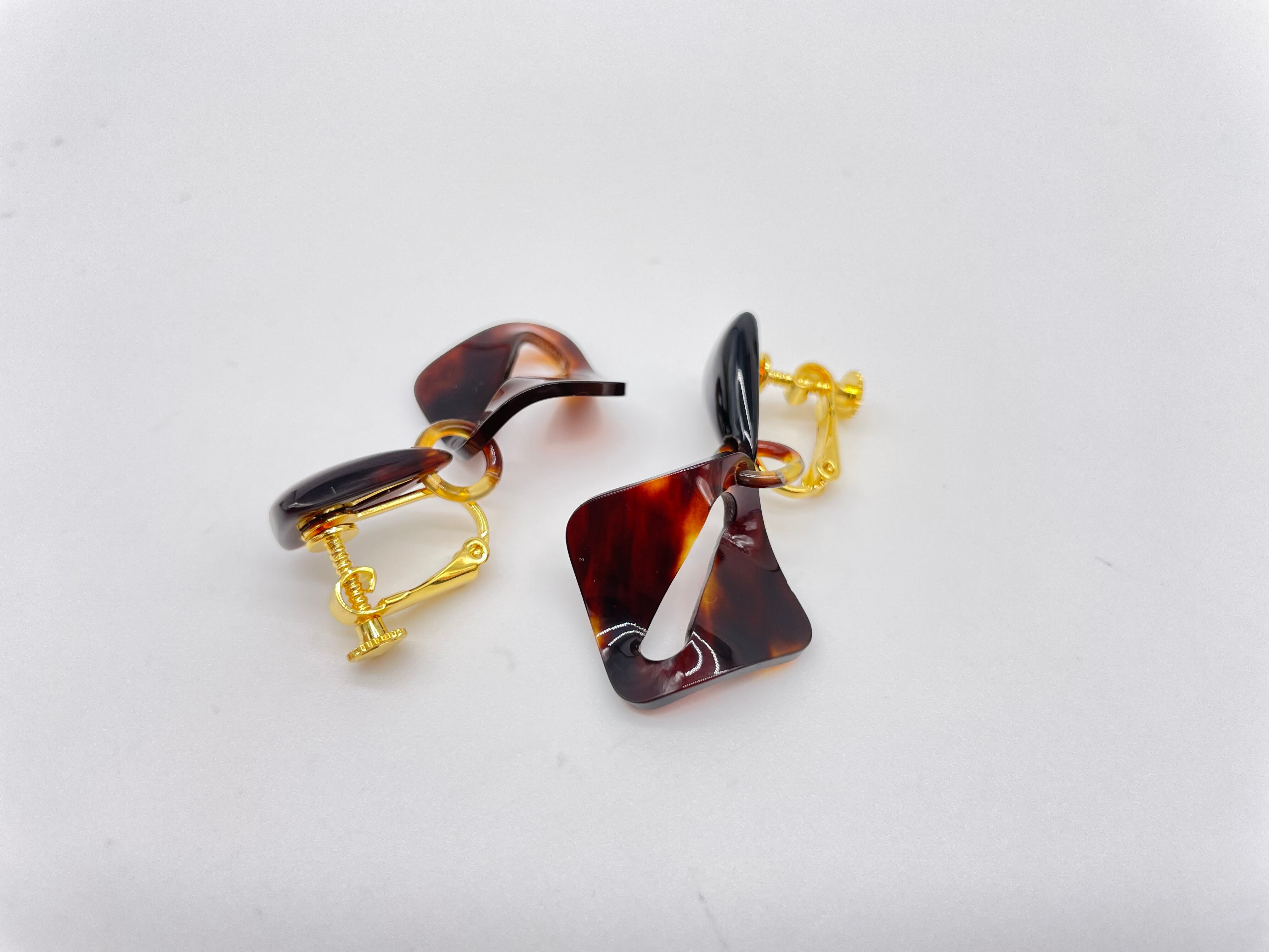ねじれの入ったひし形タイプの菱喜平パーツを取り付けたイヤリングです。ユニークなひし形がユラユラ揺れるデザインなので、お顔回りを可愛らしく演出してくれること間違いなし!中に空間のあるスクエアにねじれが入ることで、見る角度によって見え方が変わり、飽きの来ない商品となっております。そこに、しずく型が組み合わさることで、上品さをプラスします!カジュアル、フォーマルどちらにも合わせて頂けるので、母の日や、誕生日プレゼントにも最適です。ピアスへの加工も無償でさせて頂きますのでメール、メッセージでお伝えください(但し金具はチタンの直結タイプとなります)。商品はこちらの梱包にて大切に発送致します。天然素材の為、色目やサイズ感は多少異なる場合がございます。※べっ甲及び琥珀等の天然素材はすべて本物です。通常希望小売価格¥12,000