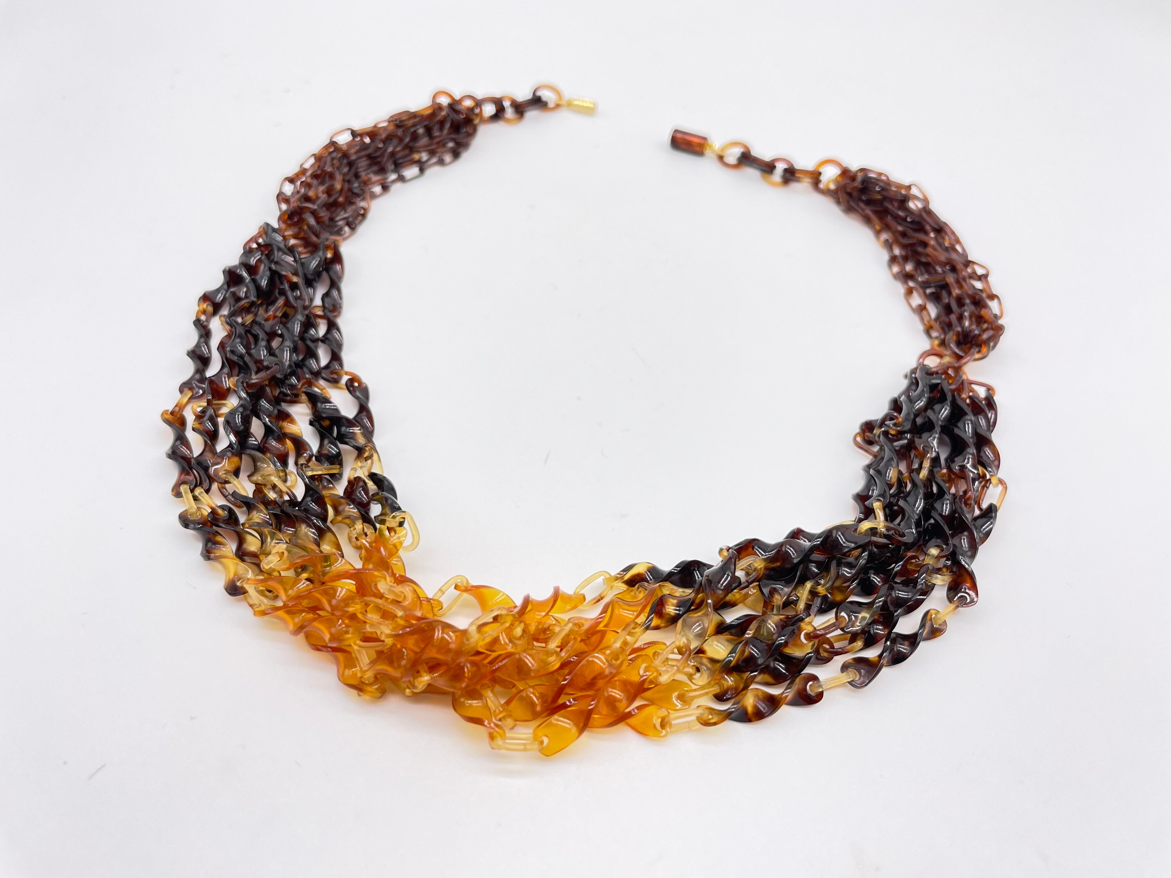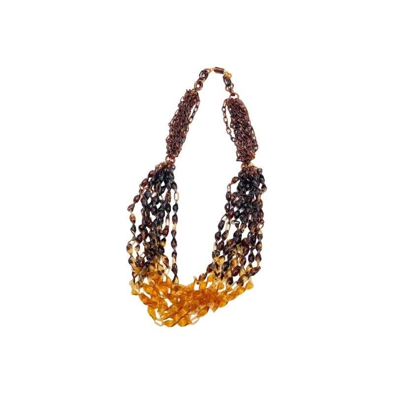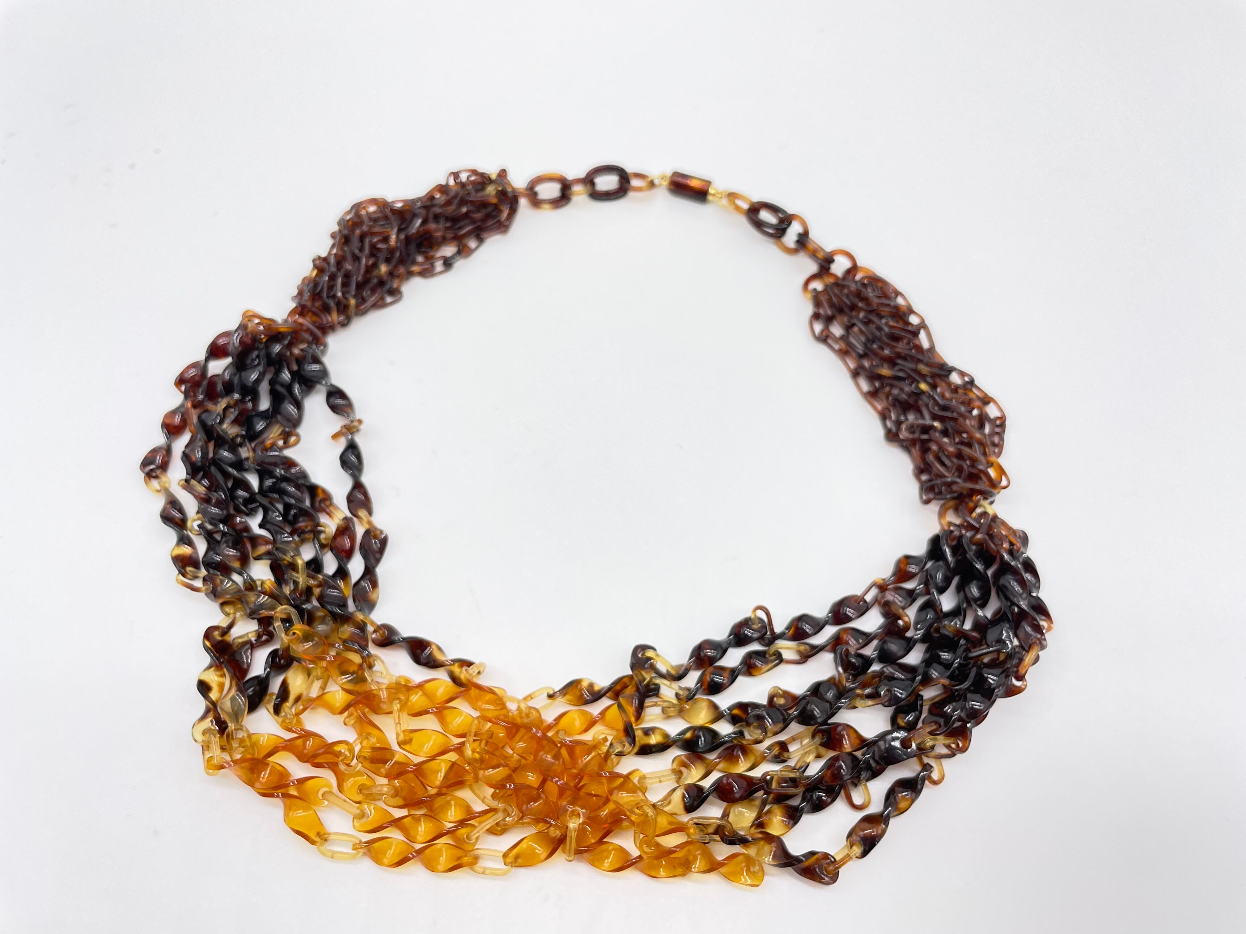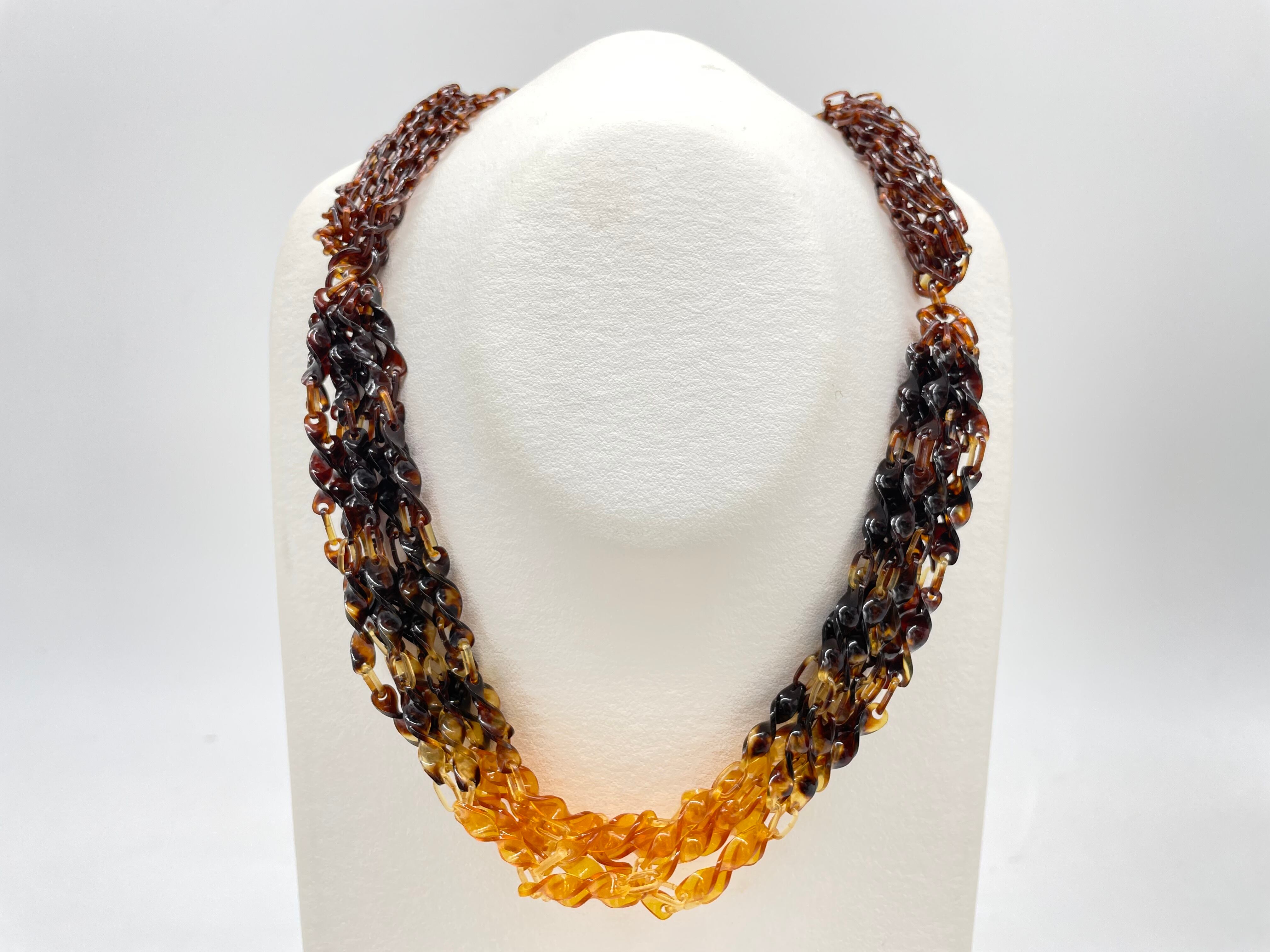 ひねりのパーツを繋いでセンターを9連にしたボリュームのあるショートタイプのネックレスです。センターに希少な白甲を使った贅沢な商品ですのでお顔を明るく演出してくれます。ちょっとしたお出かけはもちろん、結婚式などのあらゆるパーティーシーンにも活躍すること間違いなし!幅広い年齢層にも使い頂ける商品ですので親子でシェアも可能です。大切な方へのプレゼントにも最適ですし自分へのご褒美にもいかがでしょうか。一点ものの為、お早めにご購入ください。商品はこちらの梱包にて大切に発送致します。天然素材の為、色目やサイズ感は多少異なる場合がございます。※べっ甲及び琥珀等の天然素材はすべて本物です。通常希望価格¥160,000