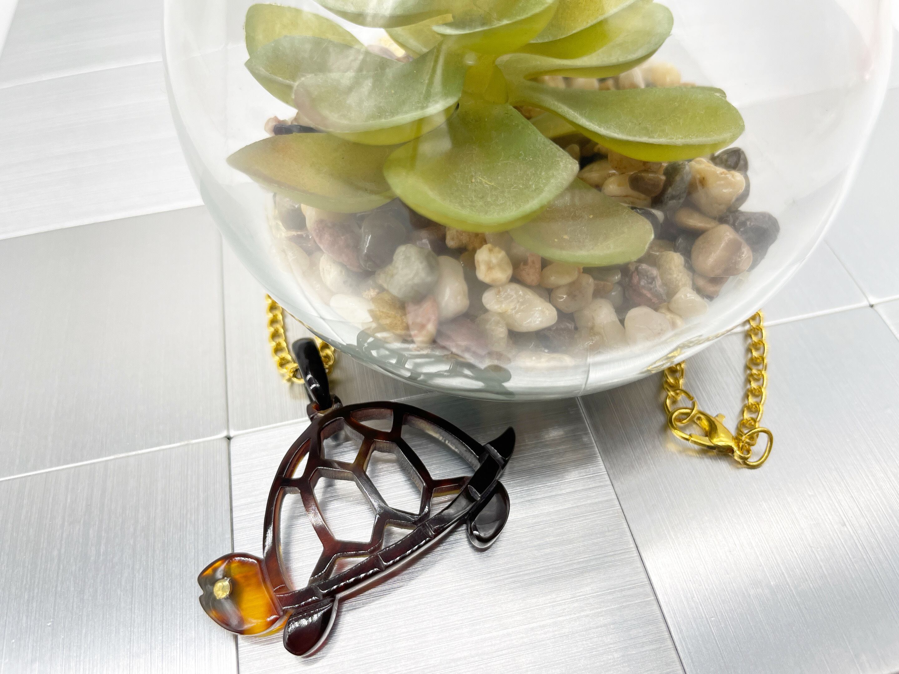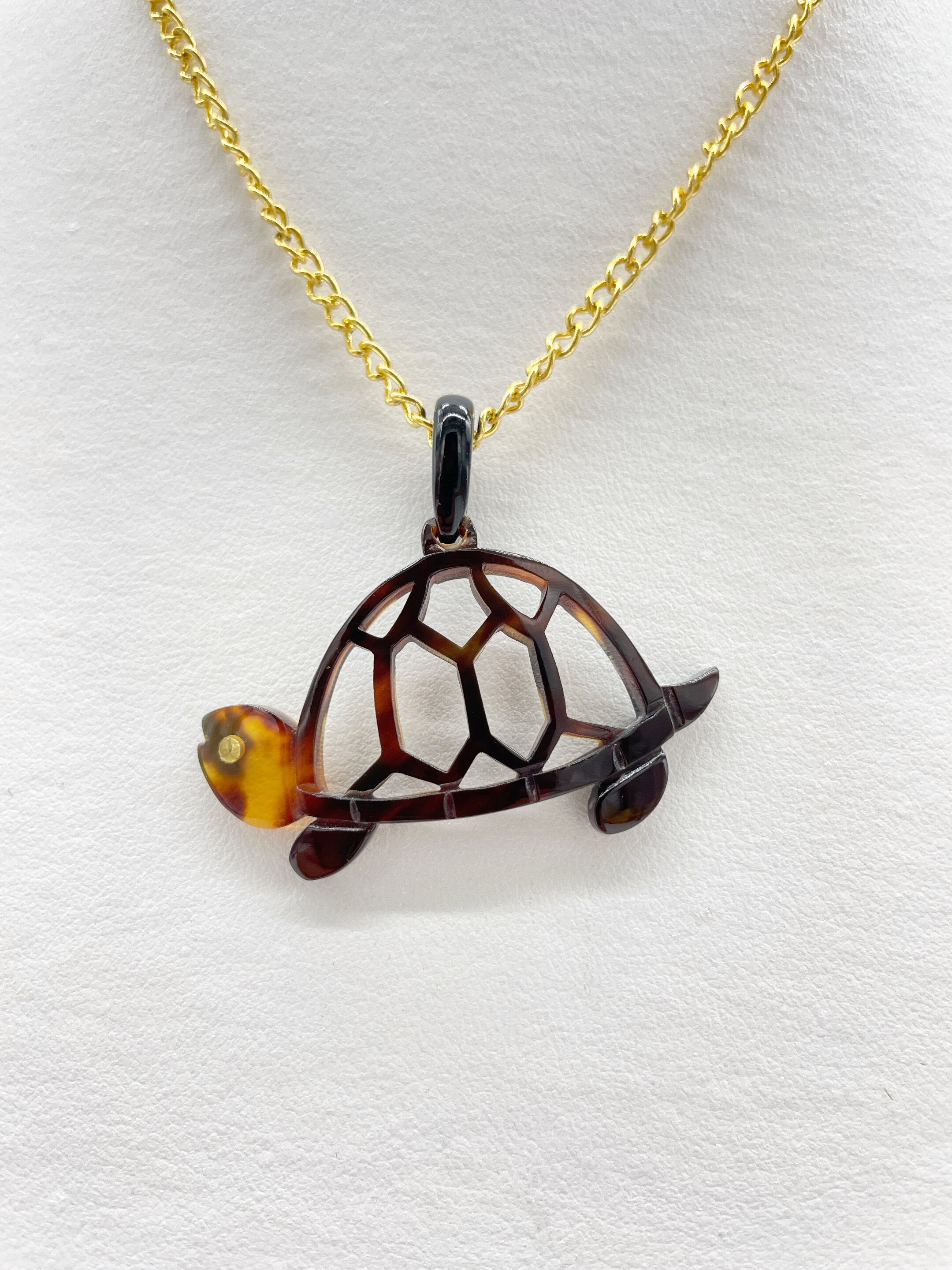 本べっ甲で演出した亀のシルエットに透かしを施したペンダントです。可愛らしい亀に透かしを加えることで可愛さマックスな商品に仕上がりました!カジュアルなスタイルにお似合いなのはもちろん、キレイめファッションに着けて頂いても良いアクセントとなっております。べっ甲はとても軽いため重さを感じず疲れにくいです。こちらの金メッキの付属チェーンはサービスでお付けしておりますが、お手持ちのチェーンなどに通してもお使い頂ける商品です。画像にあるスピネルチェーン(別売り)と合わせて頂くと、より豪華な仕上がりになります。この機会に本物のべっ甲の良さを是非お試しください。こちらは、亀をモチーフにしておりますので、カメちゃん好き、動物好きの方は見逃せない商品です!商品はこちらの梱包にて大切に発送致します。天然素材の為、色目やサイズ感は多少異なる場合がございます。※べっ甲及び琥珀等の天然素材はすべて本物です。通常希望小売価格¥16,000