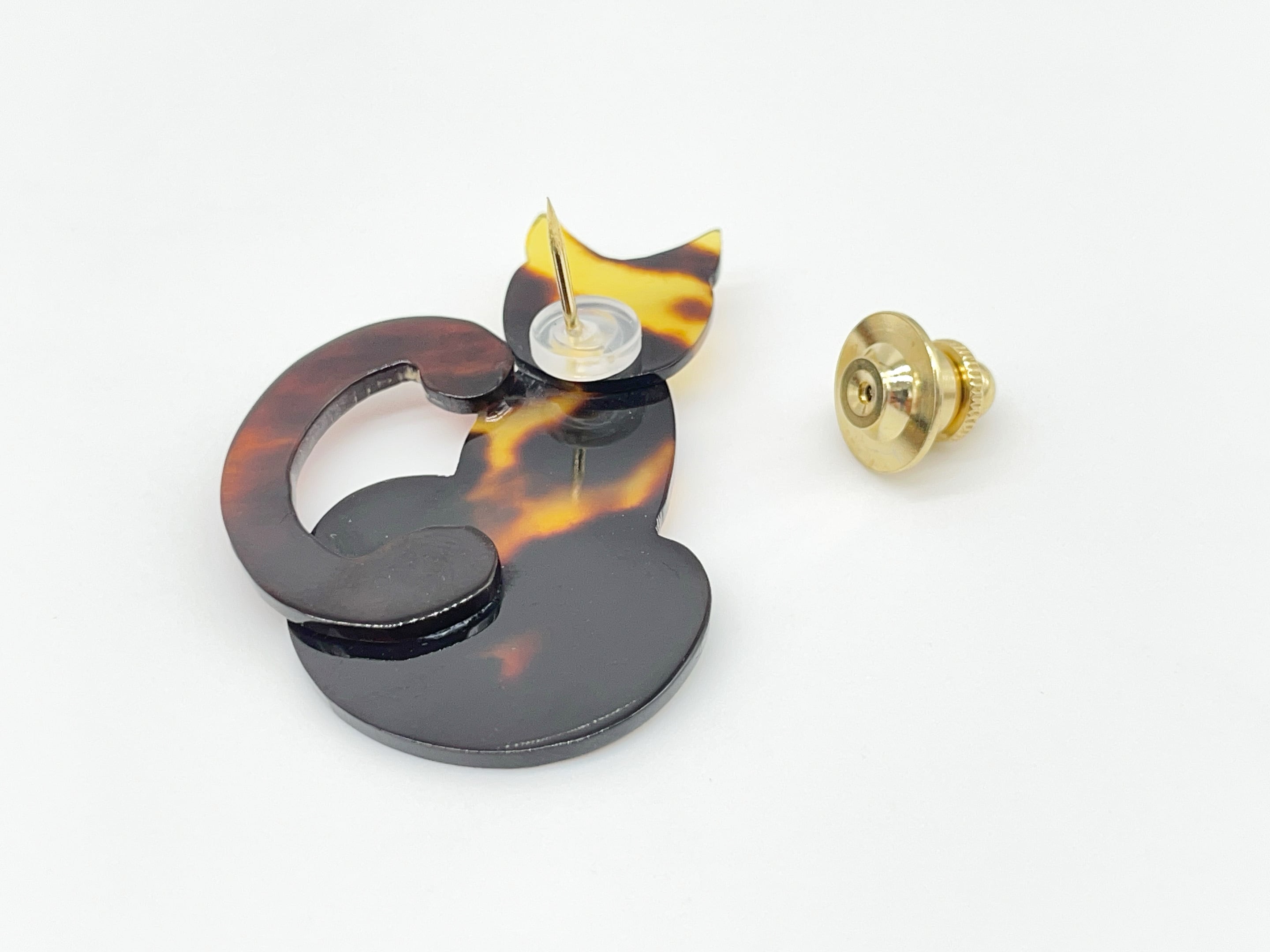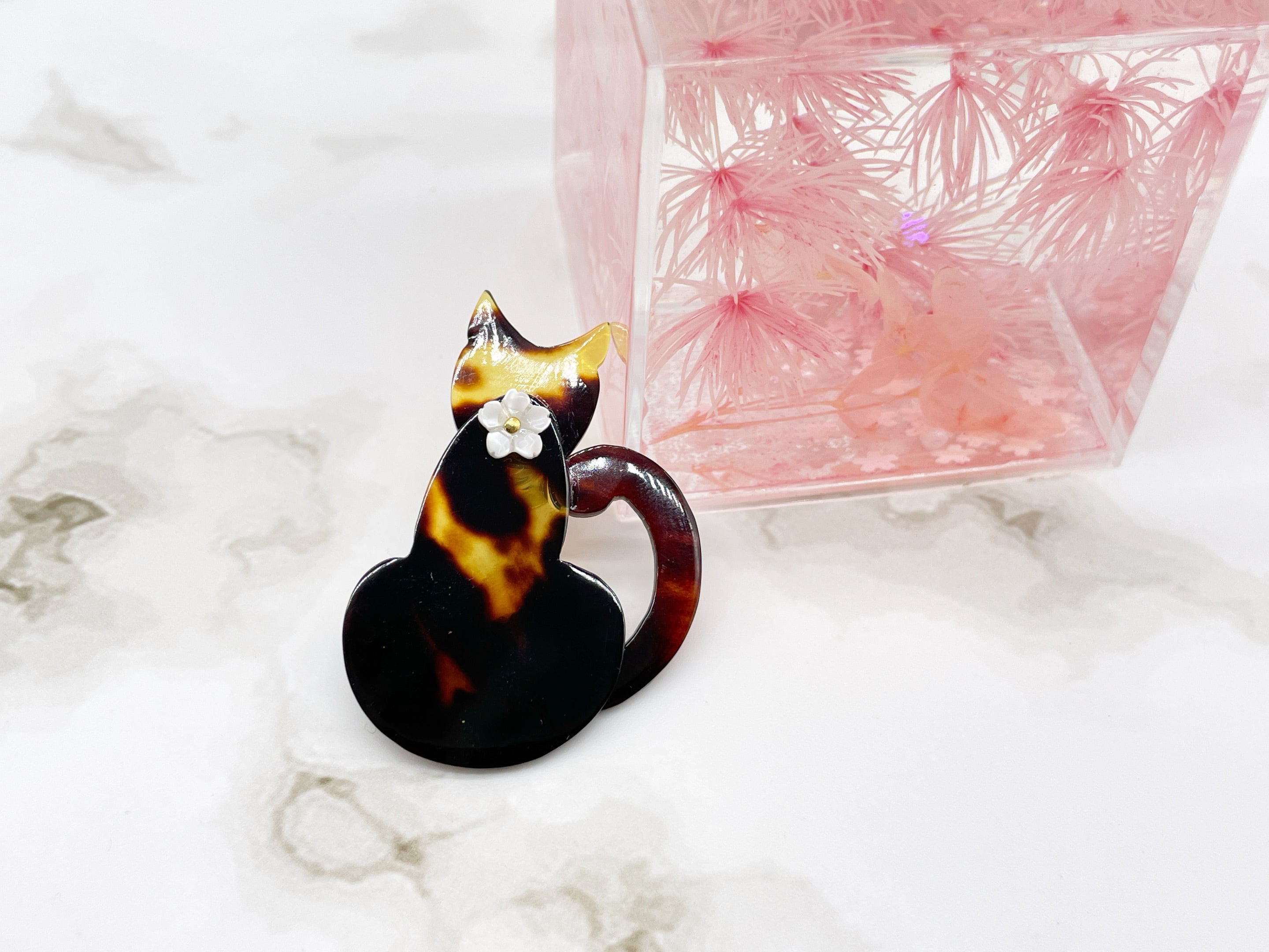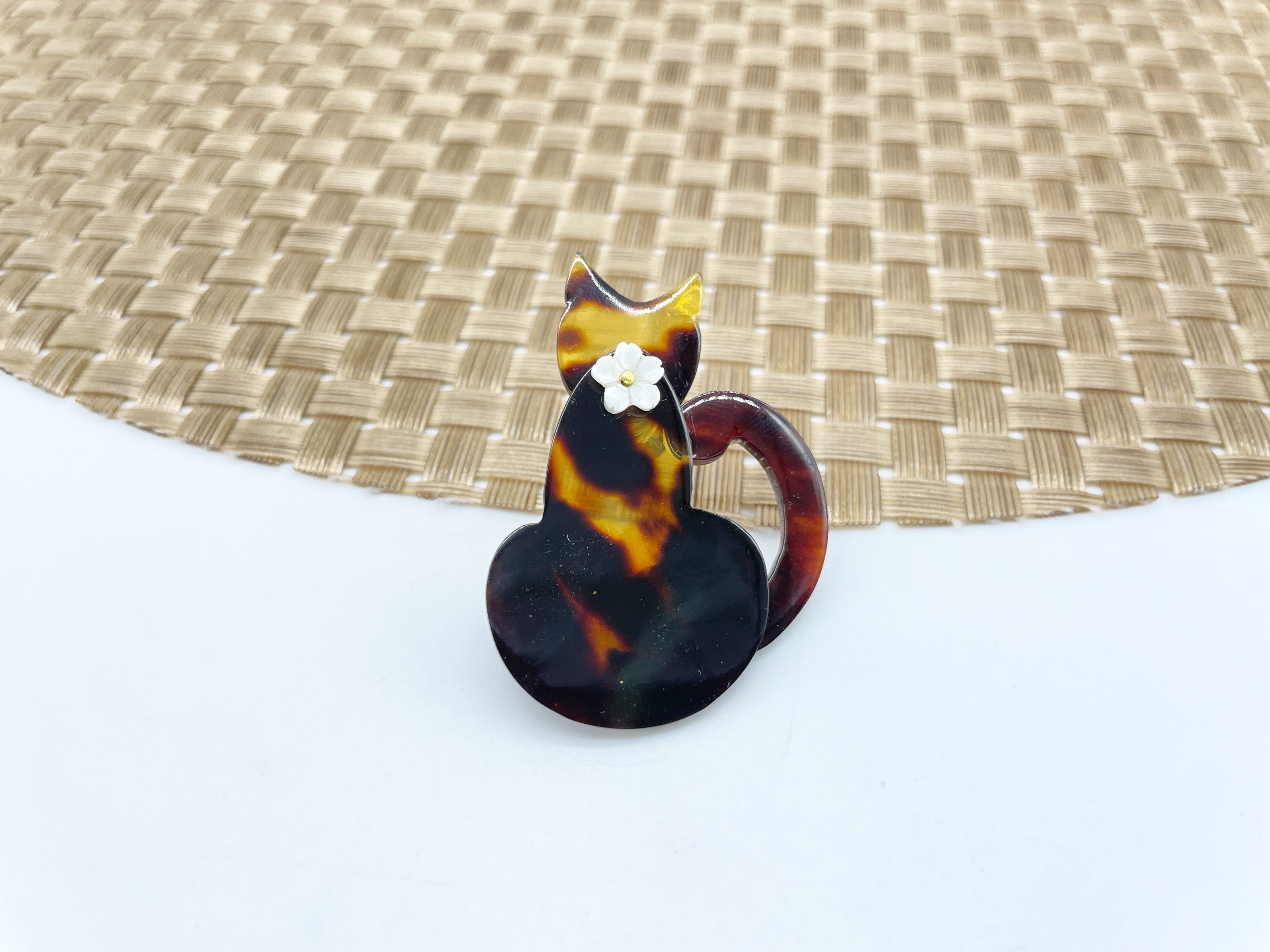美しい模様が特徴の本べっ甲を用いた、愛らしい猫ちゃん型のピンブローチです。猫の背中には、白蝶貝で丁寧に作られた小さな花を取り付け、光沢のある素材が上品な輝きを放ちます。伝統素材のべっ甲と、繊細な白蝶貝の組み合わせが、可愛らしさの中にも高級感を演出。カジュアル、フォーマルなどの洋装問わず、日常使いから特別なシーンまで幅広く活躍する一品です。猫好きの方へのギフトにもおすすめの可愛い逸品です。この機会に本物のべっ甲の良さを是非お試しください。小さな猫が、あなたの装いに優雅な彩りを添えます。商品はこちらの梱包にて大切に発送致します。天然素材の為、色目やサイズ感は多少異なる場合がございます。※べっ甲及び琥珀 等の天然素材はすべて本物です。通常希望小売価格¥12,000