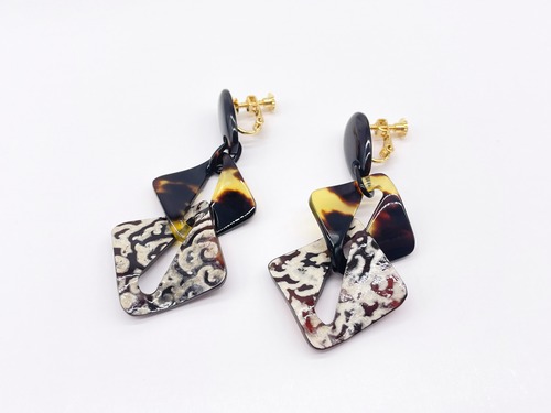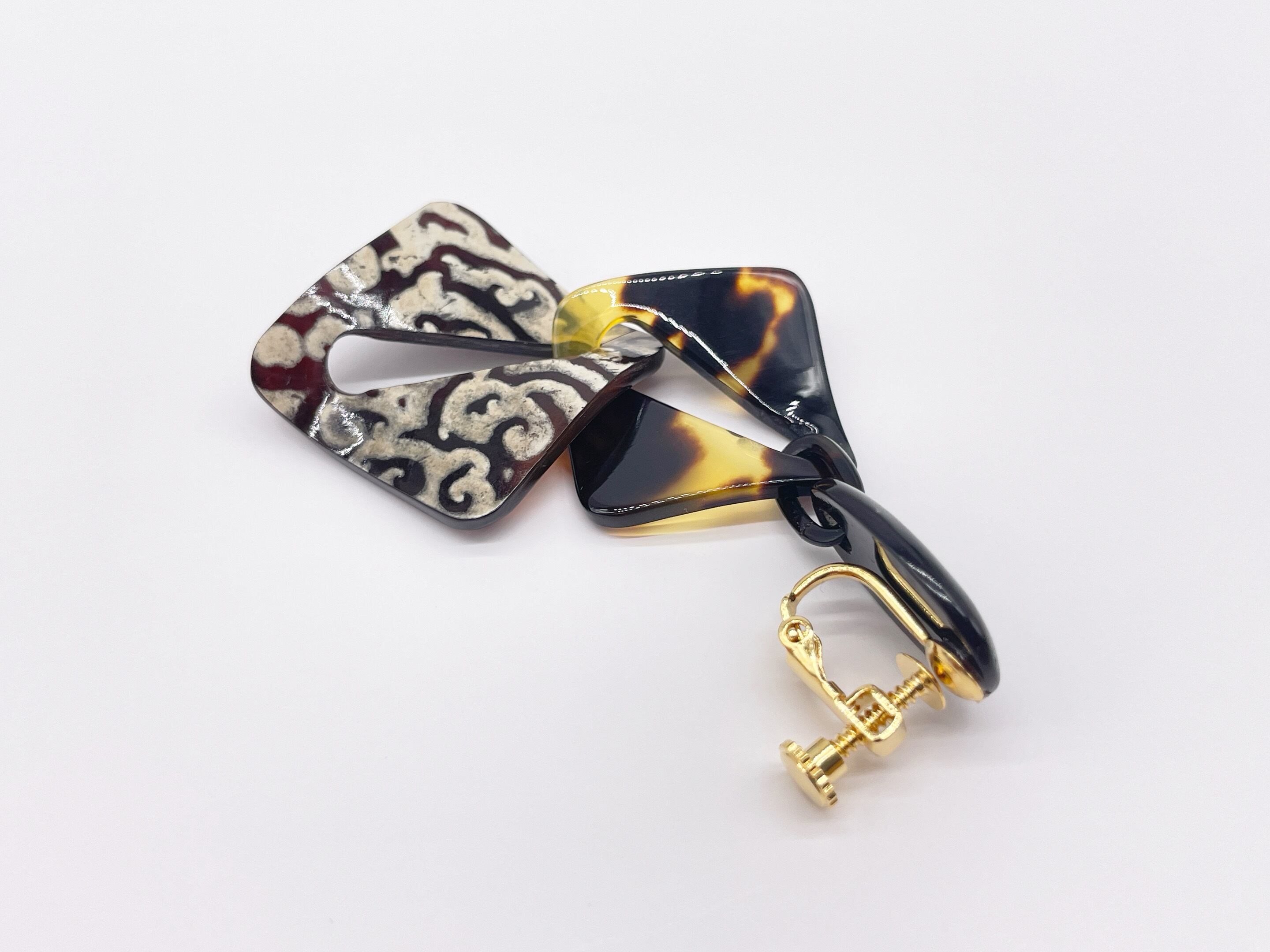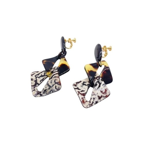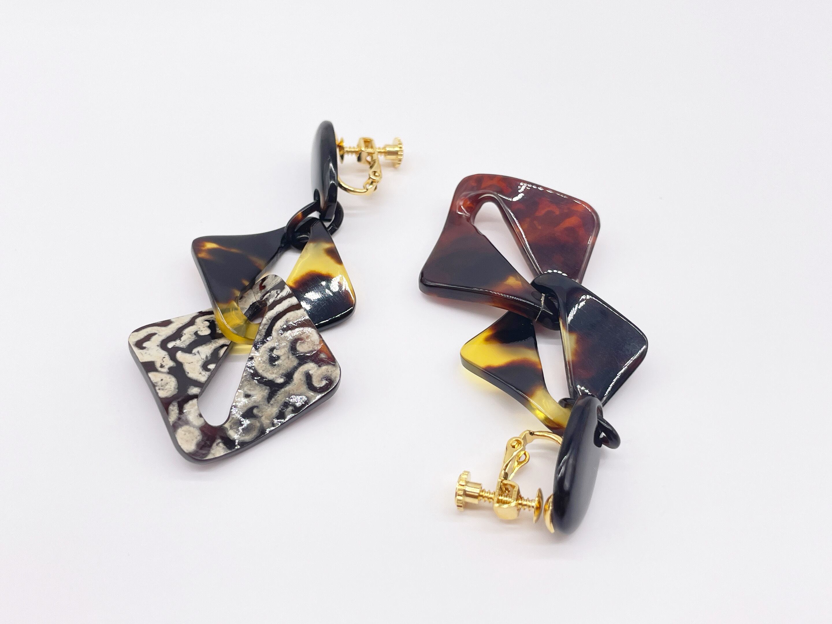 本べっ甲の艶やかな質感と、本水目の繊細な木目に個性的なエグリパーツを組み合わせた、幾何学モチーフのイヤリング。ゴールドカラーのねじ式金具を採用し、耳元にしっかりとフィット。天然素材ならではの温もりと、モダンなデザインが融合した逸品です。カジュアル、フォーマルどちらにもにも合わせやすく、日常使いから特別なシーンまで幅広く活躍します。べっ甲はとても軽いため重さを感じず疲れにくいです。ピアスへの加工も無償でさせて頂きますのでメール、メッセージでお伝えください(但し金具はニッケルフリーのアレルギー対応チタンの直結タイプとなります)。自然の質感と幾何の美が、耳元に静かに華を添えます。商品はこちらの梱包にて大切に発送致します。天然素材の為、色目やサイズ感は多少異なる場合がございます。※べっ甲及び琥珀等の天然素材はすべて本物です。通常希望小売価格¥50,000