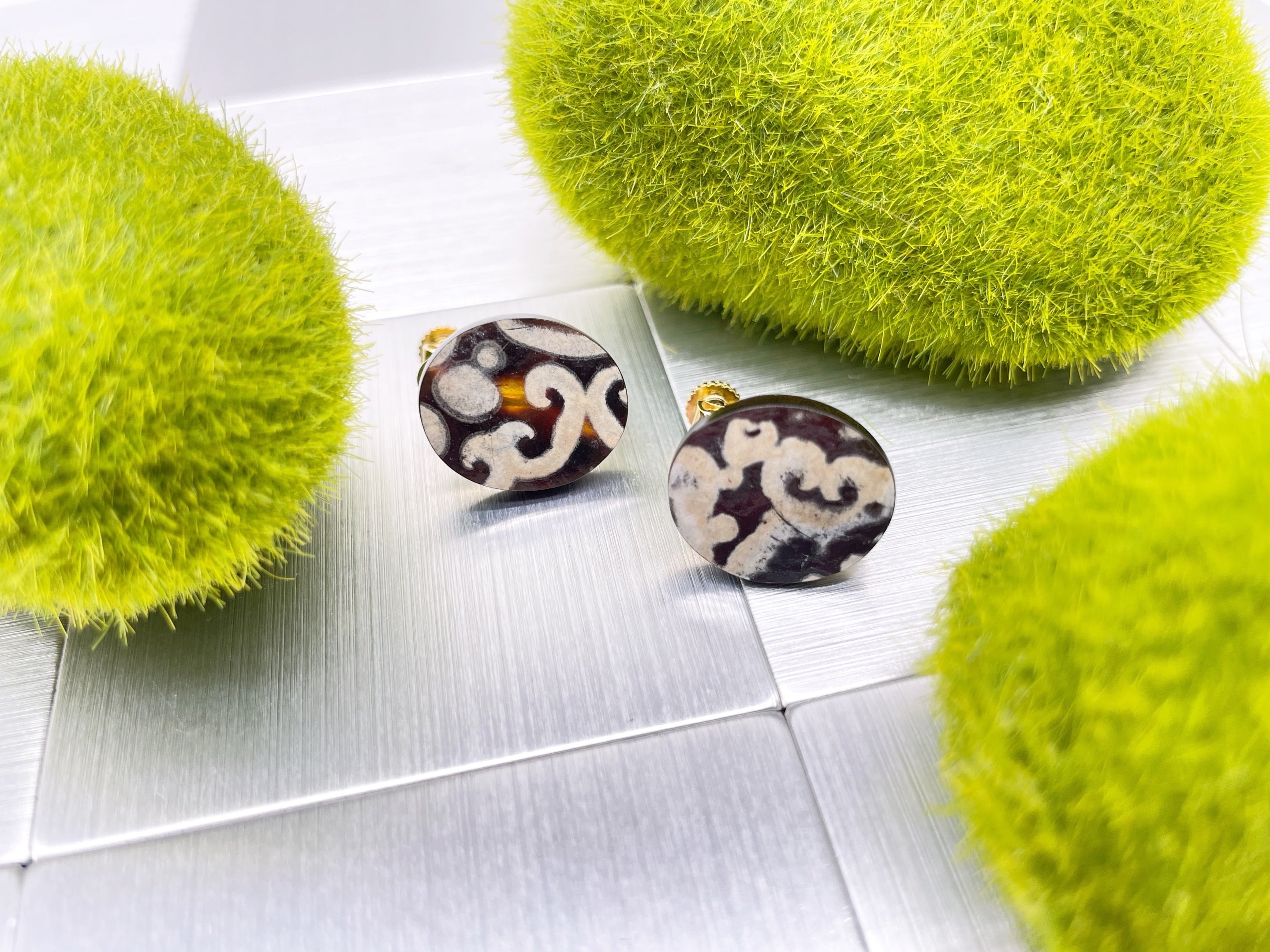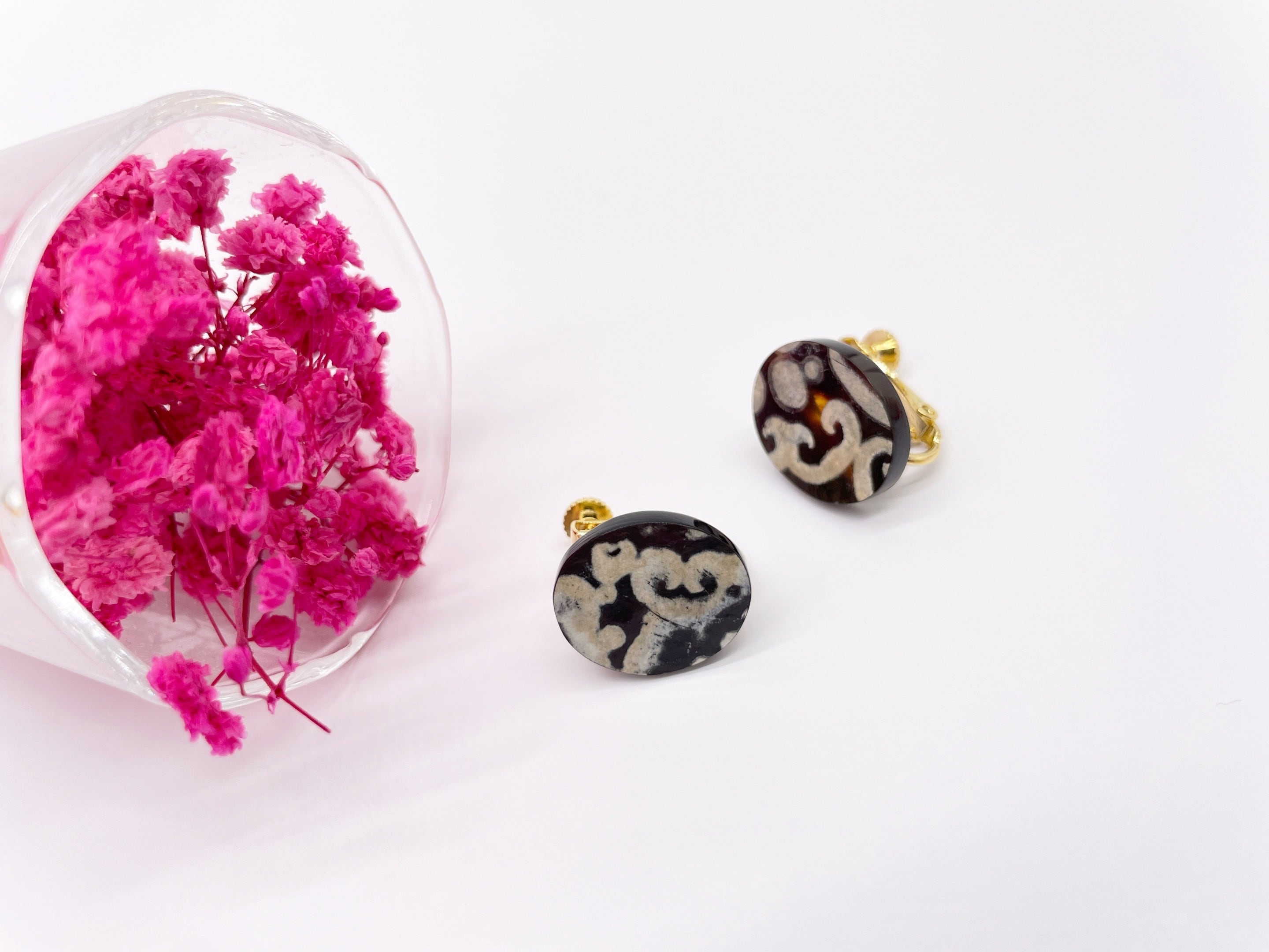 ●サイズ タテ約1.6cm×ヨコ幅約1.4cm ●説明 本べっ甲 バラフ甲(背甲)使用 本水目(背甲)使用 金具 金メッキばね式使用 本べっ甲と本水目を組み合わせた、上質で個性的なイヤリングです。べっ甲の美しい色合いに、本水目の白い唐草模様が加わり、自然が生み出す美しいコントラストを楽しめます。デザインは、耳元にしっくり馴染む楕円形のプレート型。シンプルながらも、天然素材ならではの模様が一点一点異なり、世界にひとつだけの特別感を演出します。べっ甲はとても軽いため重さを感じず疲れにくいです。ピアスへの加工も無償でさせて頂きますのでメール、メッセージでお伝えください(但し金具はニッケルフリーのアレルギー対応チタンの直結タイプとなります)。耳元に、自然が描く小さなアートを。商品はこちらの梱包にて大切に発送致します。天然素材の為、色目やサイズ感は多少異なる場合がございます。※べっ甲及び琥珀等の天然素材はすべて本物です。通常希望小売価格¥24,000