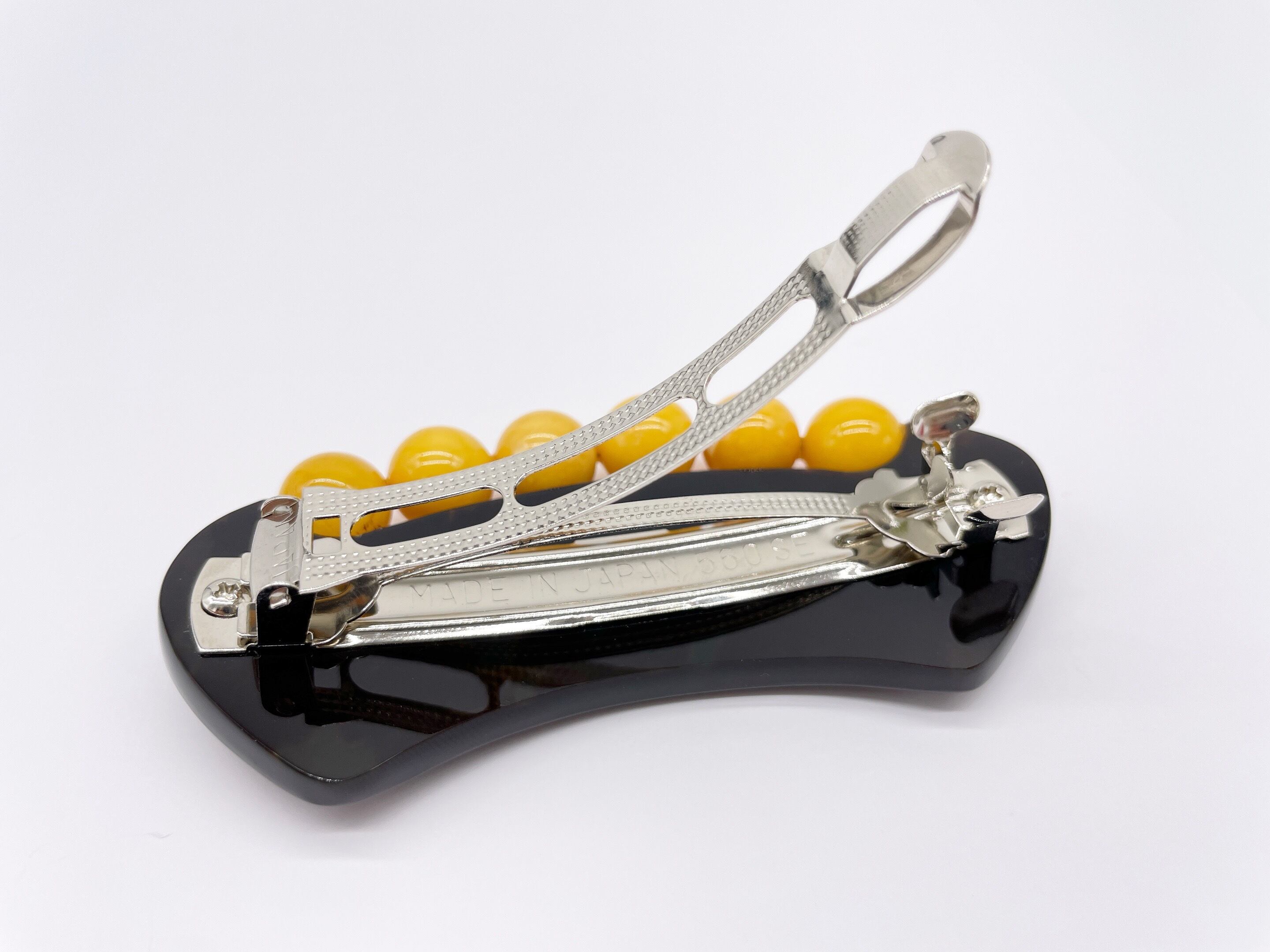 ●サイズ タテ約4.7cm×ヨコ約9.2cm ●説明 本べっ甲 バラフ(背甲)使用 本琥珀(乳白ミルキー)使用 深みのある黒べっ甲の艶やかなベースに、柔らかな乳白色の琥珀を並べたデザインにより、クラシカルでありながらモダンな印象を与える髪留め。なめらかな黒べっ甲のベースは、緩やかなカーブを描きながら両端に向かって流れるようなラインを持ち、髪に自然にフィットします。上部に並ぶ乳白色の琥珀は、丸みを帯びた球体で均一に配置され、立体感と華やかさをプラス。べっ甲の艶やかな光沢と琥珀の柔らかな輝きが、角度によって異なる表情を見せるデザイン性の高い逸品です。金具はバレッタタイプを使用していますので着けやすくなっております。べっ甲はとても軽いためズレ落ちがしにくく疲れません。曲線と球体が奏でる造形美。特別なまとめ髪に、自然の贅沢を。商品はこちらの梱包にて大切に発送致します。天然素材の為、色目やサイズ感は多少異なる場合がございます。※べっ甲及び琥珀等の天然素材はすべて本物です。通常希望小売価格¥80,000