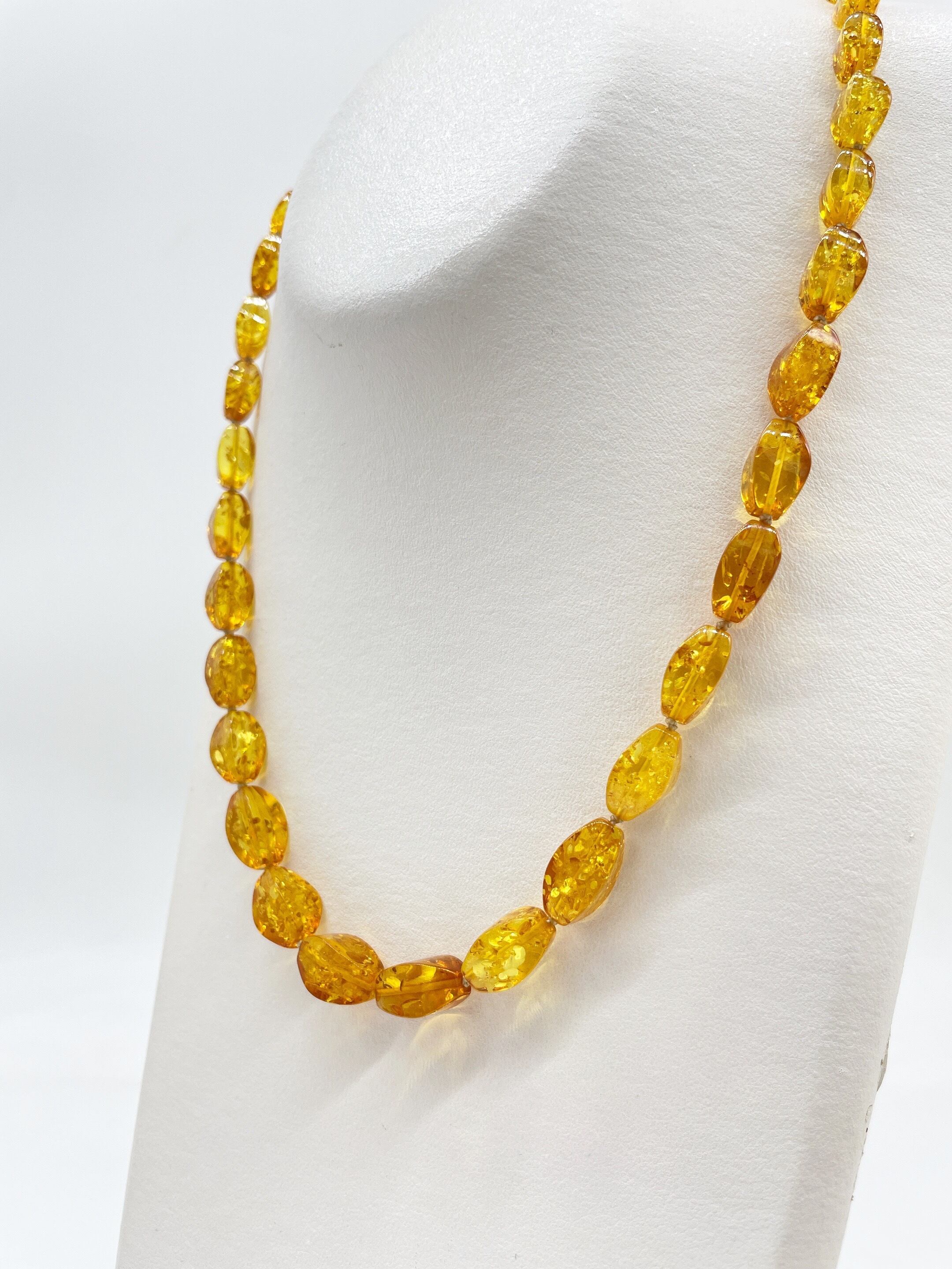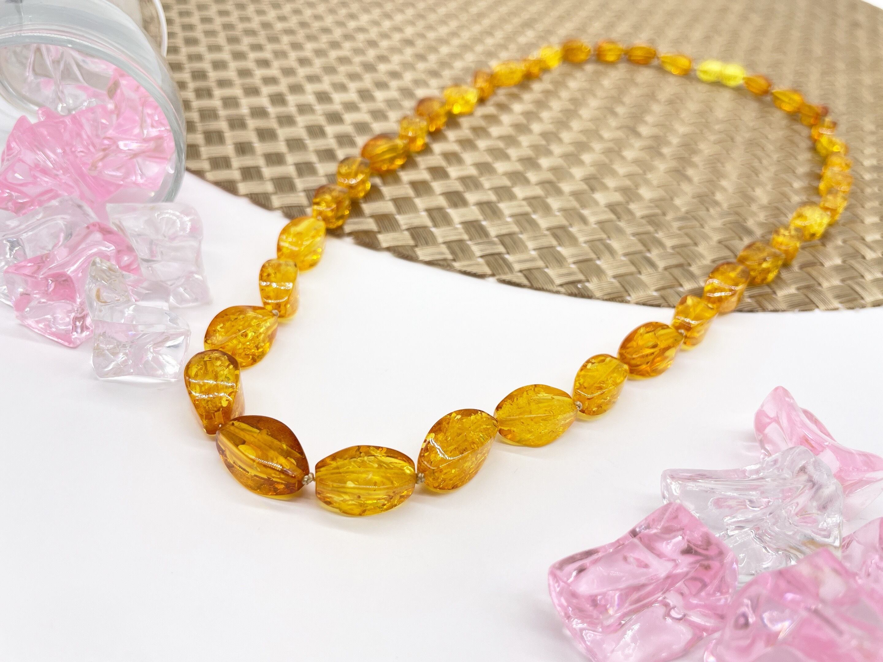 ●サイズ 全長約55.5cm ●説明 本琥珀(バルティックアンバー)使用 留め具 クラスプタイプ使用 世界的に評価される本琥珀「バルティックアンバー」を贅沢に使用したネックレスです。黄金色に輝くグリッター(内包物)のたくさん入っている本琥珀は、一粒一粒が自然の神秘を宿し、光を受けるたびに柔らかな輝きを放ちます。楕円形の琥珀を中心に、大小の琥珀を組み合わせることで、立体感と動きのあるデザインが生まれ、全体に洗練された印象をもたらします。天然琥珀ならではの軽やかな着け心地は、長時間の使用でも快適。フォーマルなシーンはもちろん、シンプルな装いに合わせるだけで、特別な存在感を演出します。商品はこちらの梱包にて大切に発送致します。悠久の輝きを、あなたのスタイルに。天然素材の為、色目やサイズ感は多少異なる場合がございます。※べっ甲及び琥珀等の天然素材はすべて本物です。通常希望価格¥42,000
