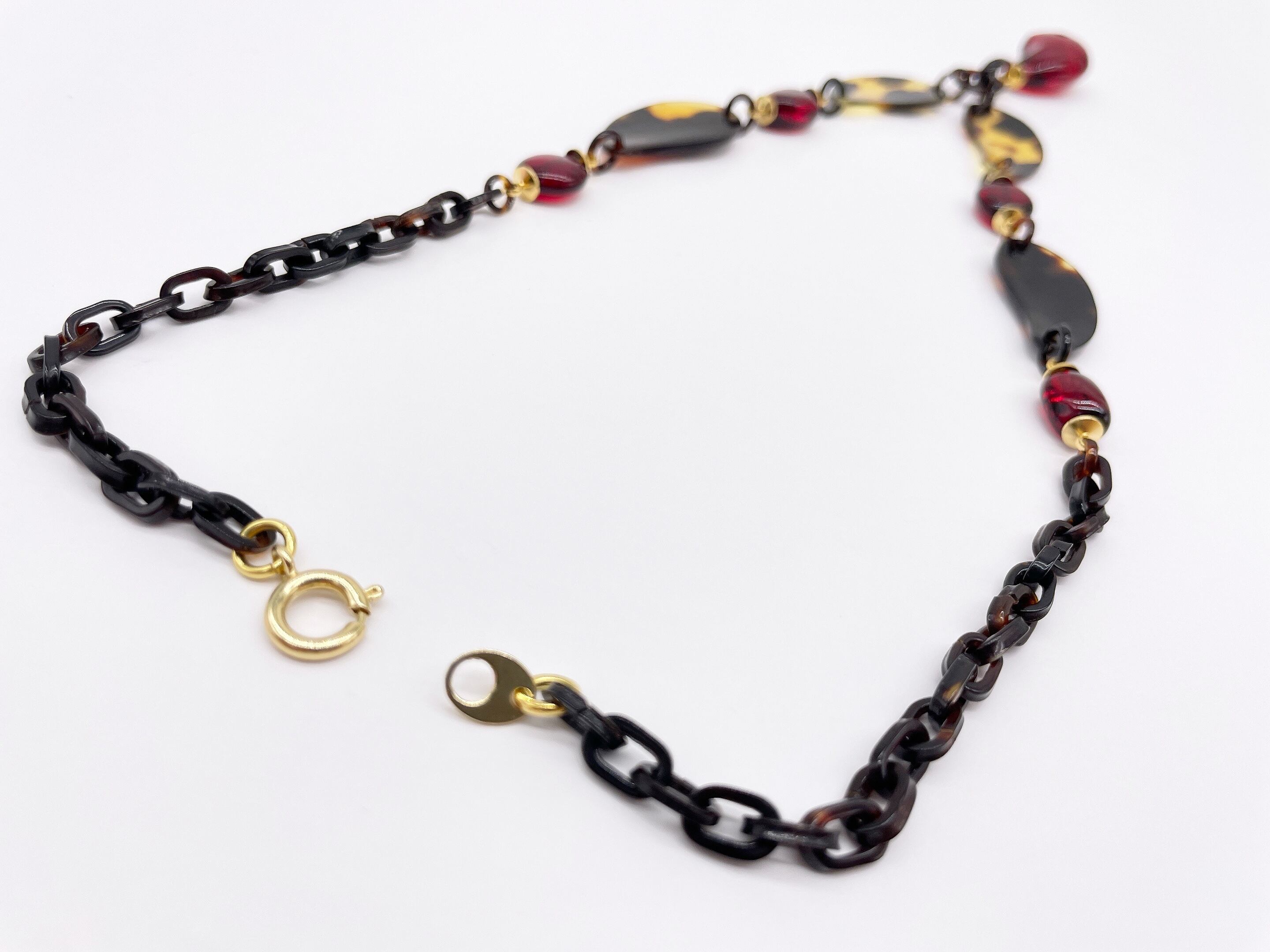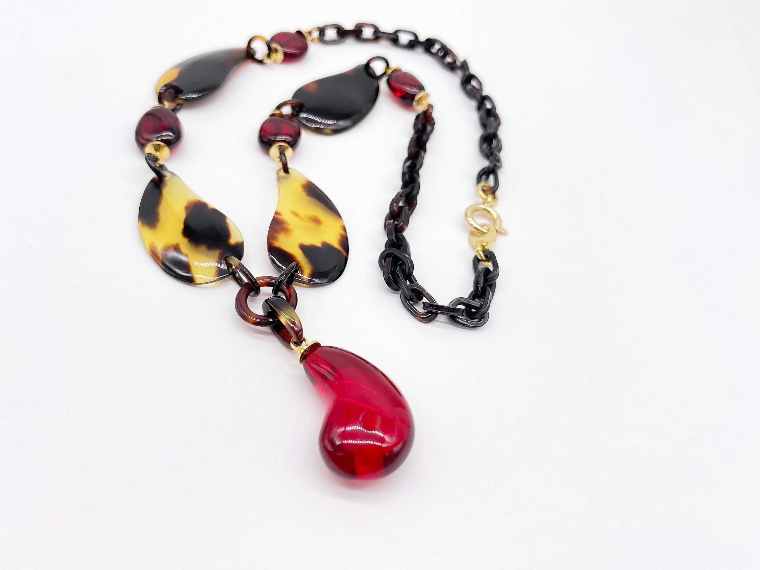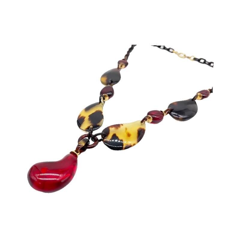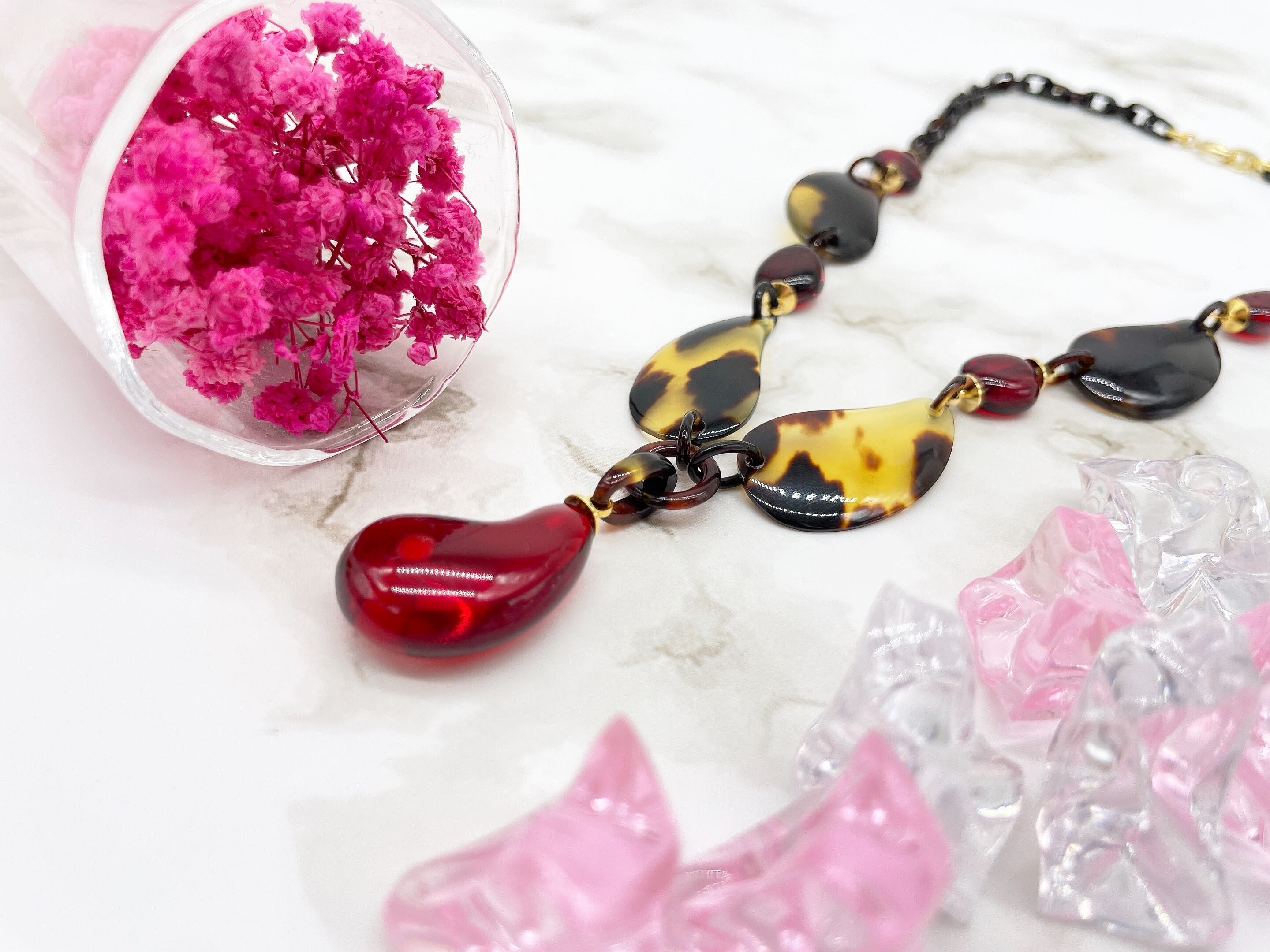 ●サイズ 全長約46cm(ペンダントトップ除く) ペンダントトップ(タテ約3.8cm×ヨコ約1.2cm) ●説明 本べっ甲(背甲)使用 本琥珀(レッドアンバー)使用 留め具 金メッキカギセット使用 自然が生み出した美しさを贅沢に融合させた、本べっ甲と本琥珀のネックレスです。ペンダントトップには、勾玉風にデザインされた美しいレッドアンバーを取り付けました。光を受けるたびに艶やかな輝きを放ち、胸元に華やかなアクセントを添えます。チェーン部分には、職人の手によって涙型に加工された、マーブルのバラフ模様が美しいべっ甲パーツとレッドアンバーの琥珀を組み合わせ、クラシカルでありながら個性的なデザインを実現しました。天然素材ならではの軽やかな着け心地は、長時間の使用でも快適。フォーマルなシーンはもちろん、シンプルな装いに合わせるだけで、特別な存在感を演出します。商品はこちらの梱包にて大切に発送致します。深紅の輝きが、あなたのスタイルを完成させる。天然素材の為、色目やサイズ感は多少異なる場合がございます。※べっ甲及び琥珀等の天然素材はすべて本物です。通常希望価格¥38,000