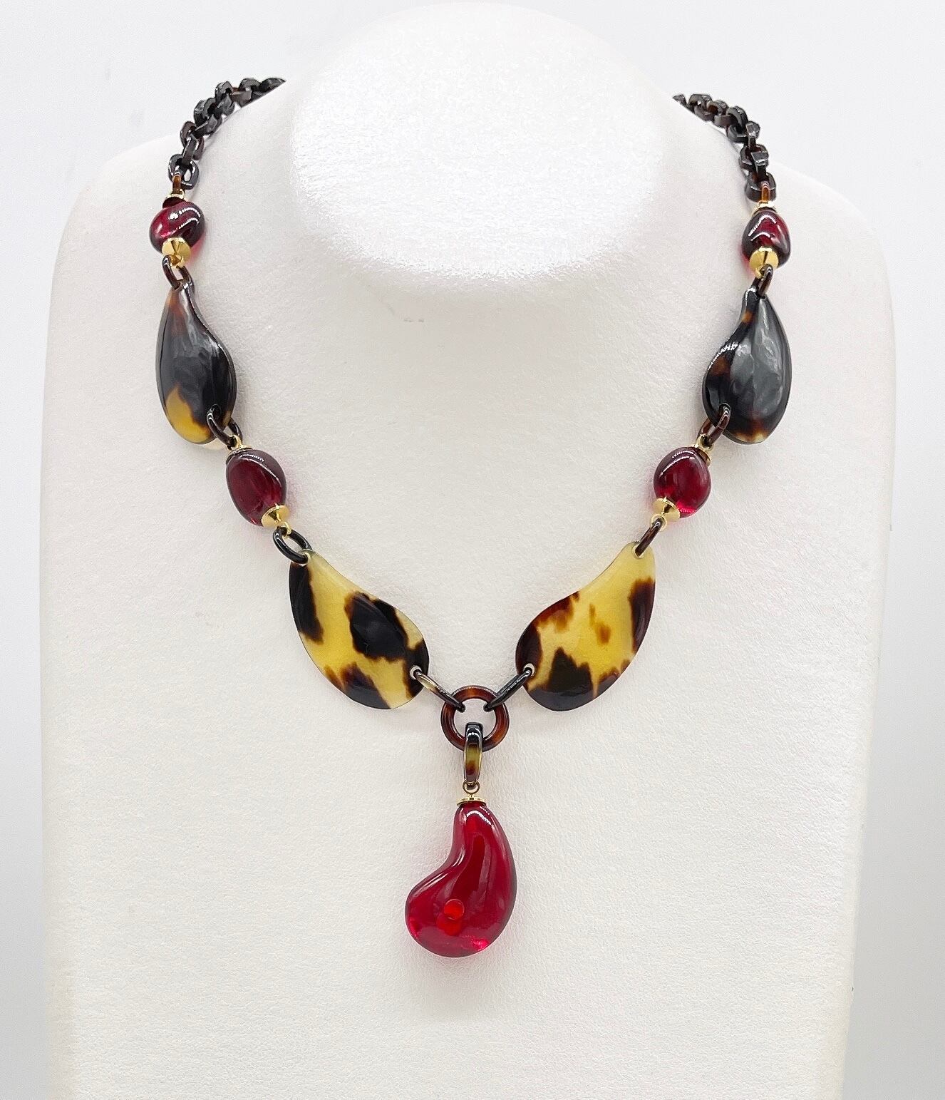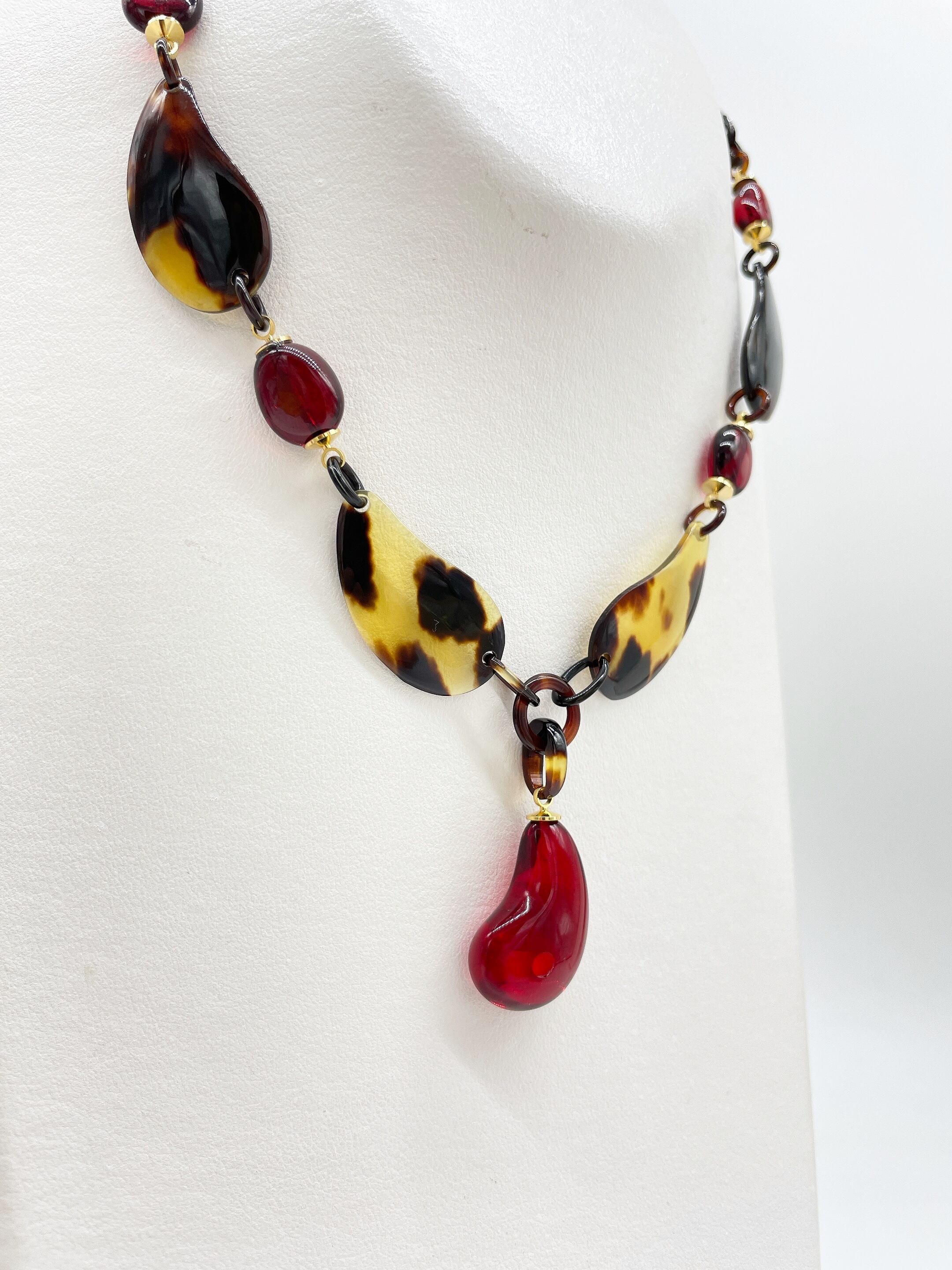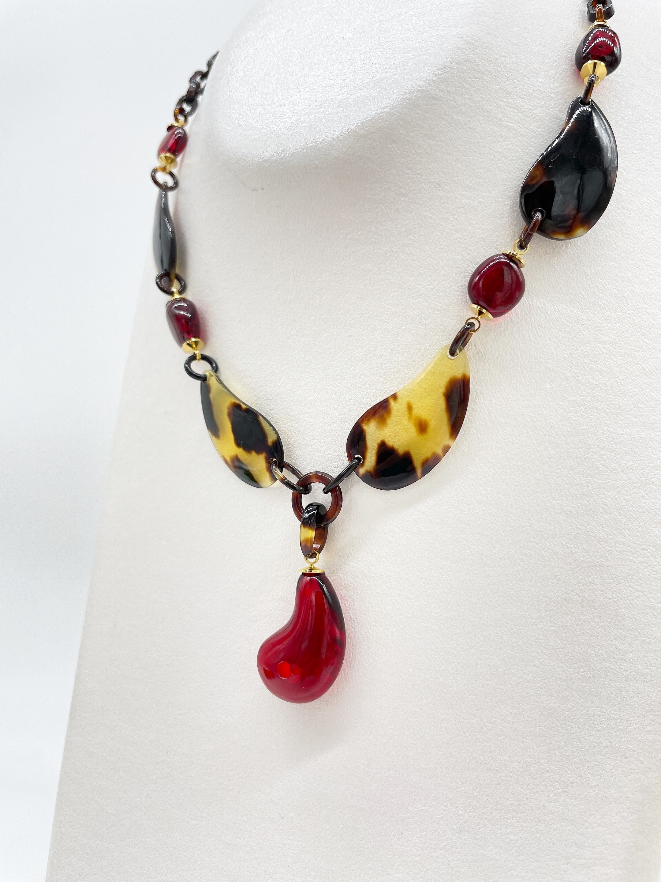 ●サイズ 全長約46cm(ペンダントトップ除く) ペンダントトップ(タテ約3.8cm×ヨコ約1.2cm) ●説明 本べっ甲(背甲)使用 本琥珀(レッドアンバー)使用 留め具 金メッキカギセット使用 自然が生み出した美しさを贅沢に融合させた、本べっ甲と本琥珀のネックレスです。ペンダントトップには、勾玉風にデザインされた美しいレッドアンバーを取り付けました。光を受けるたびに艶やかな輝きを放ち、胸元に華やかなアクセントを添えます。チェーン部分には、職人の手によって涙型に加工された、マーブルのバラフ模様が美しいべっ甲パーツとレッドアンバーの琥珀を組み合わせ、クラシカルでありながら個性的なデザインを実現しました。天然素材ならではの軽やかな着け心地は、長時間の使用でも快適。フォーマルなシーンはもちろん、シンプルな装いに合わせるだけで、特別な存在感を演出します。商品はこちらの梱包にて大切に発送致します。深紅の輝きが、あなたのスタイルを完成させる。天然素材の為、色目やサイズ感は多少異なる場合がございます。※べっ甲及び琥珀等の天然素材はすべて本物です。通常希望価格¥38,000