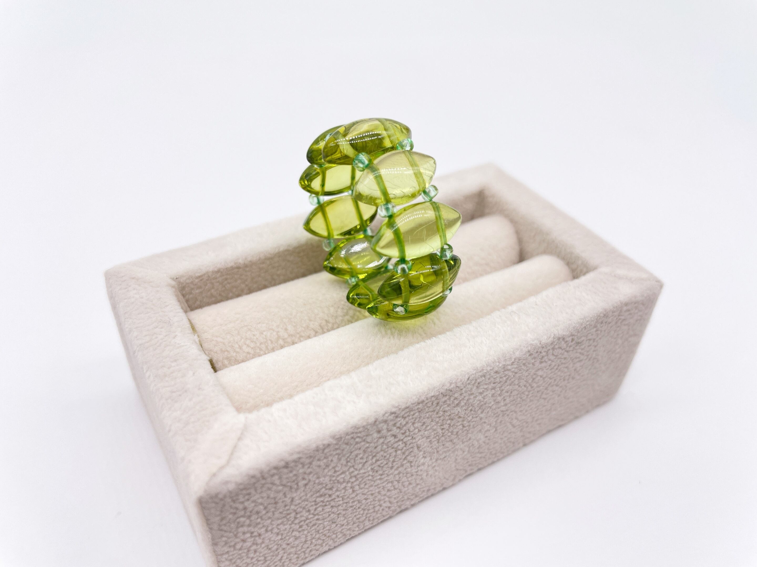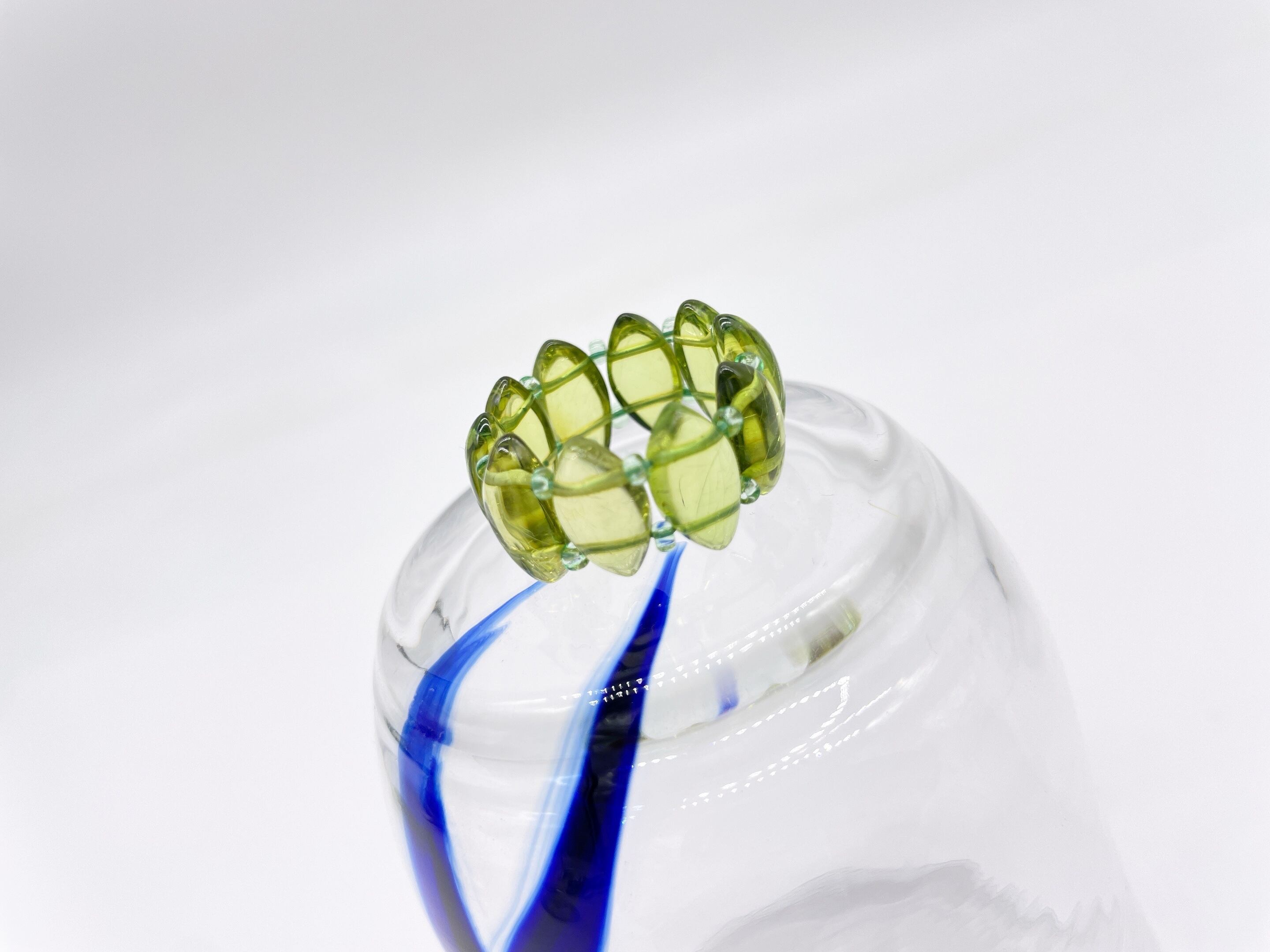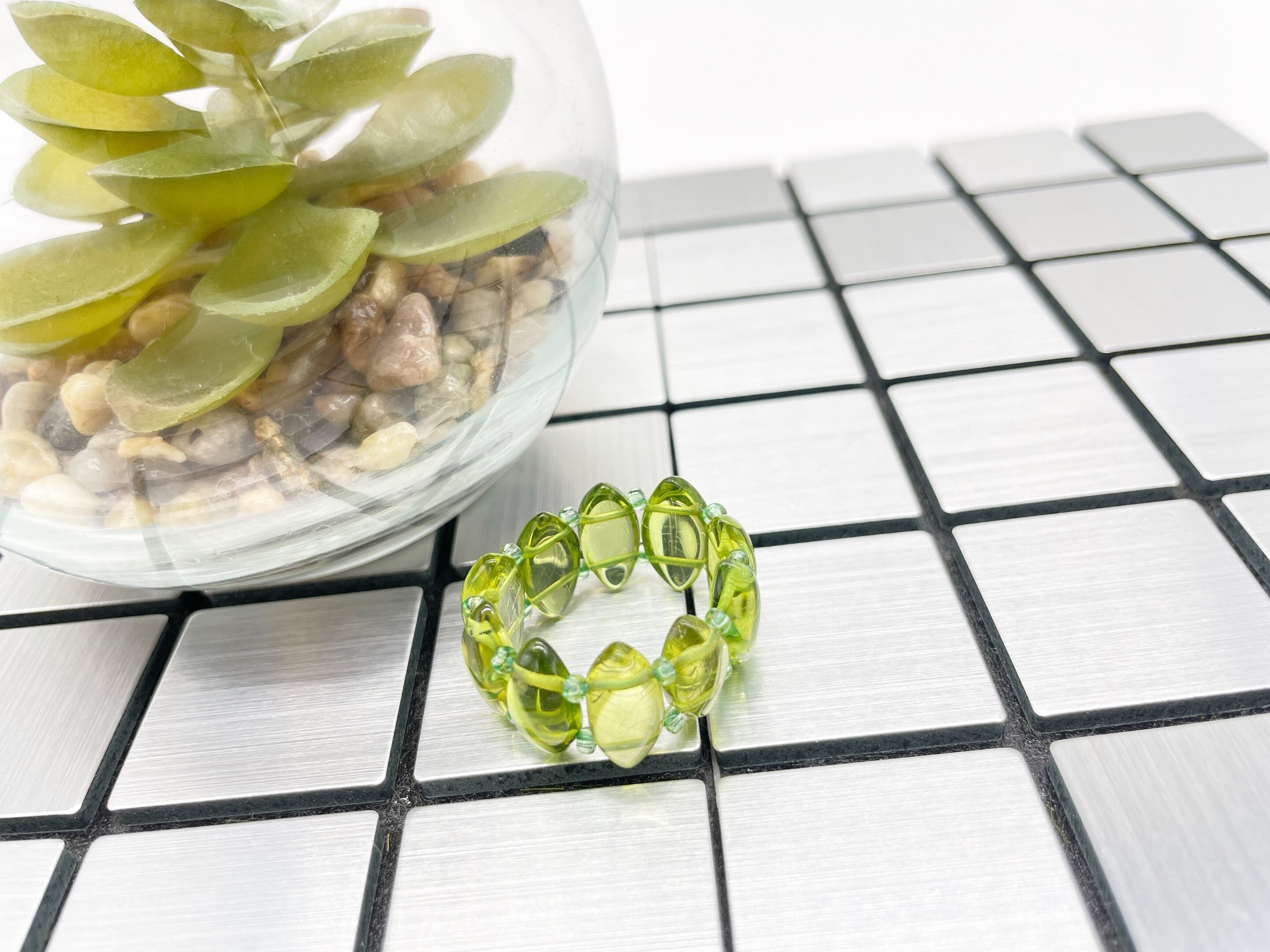 ●サイズ #19〜#21 (フリー)琥珀 幅約12ミリ ●説明 本琥珀(カリビアングリーン)使用 シリコンゴム使用 鮮やかなカリビアングリーンの本琥珀を贅沢に使用した、存在感あふれるリングです。透明感のあるカリビアングリーンが光を受けて美しく輝き、まるで深い海のような神秘的な色合いを楽しめます。ひとつひとつ異なる表情を持つ琥珀のパーツは、職人の手によりリーフ加工を施されたことで、より可愛らしさを演出してくれます。カジュアルな装いに華やぎを添えるだけでなく、フォーマルなシーンでも上品なアクセントとして活躍。シリコンゴムを使用しているので伸縮性があり、指にやさしくフィットし、長時間の着用も快適です。本琥珀は天然素材の為、非常に付け心地が良いですしアレルギーの心配も無いので安心です。指先に、深い海の輝きを。商品はこちらの梱包にて大切に発送致します。天然素材の為、色目やサイズ感は多少異なる場合がございます。※べっ甲 及び琥珀等の天然素材はすべて本物です。希望小売価格\5,500