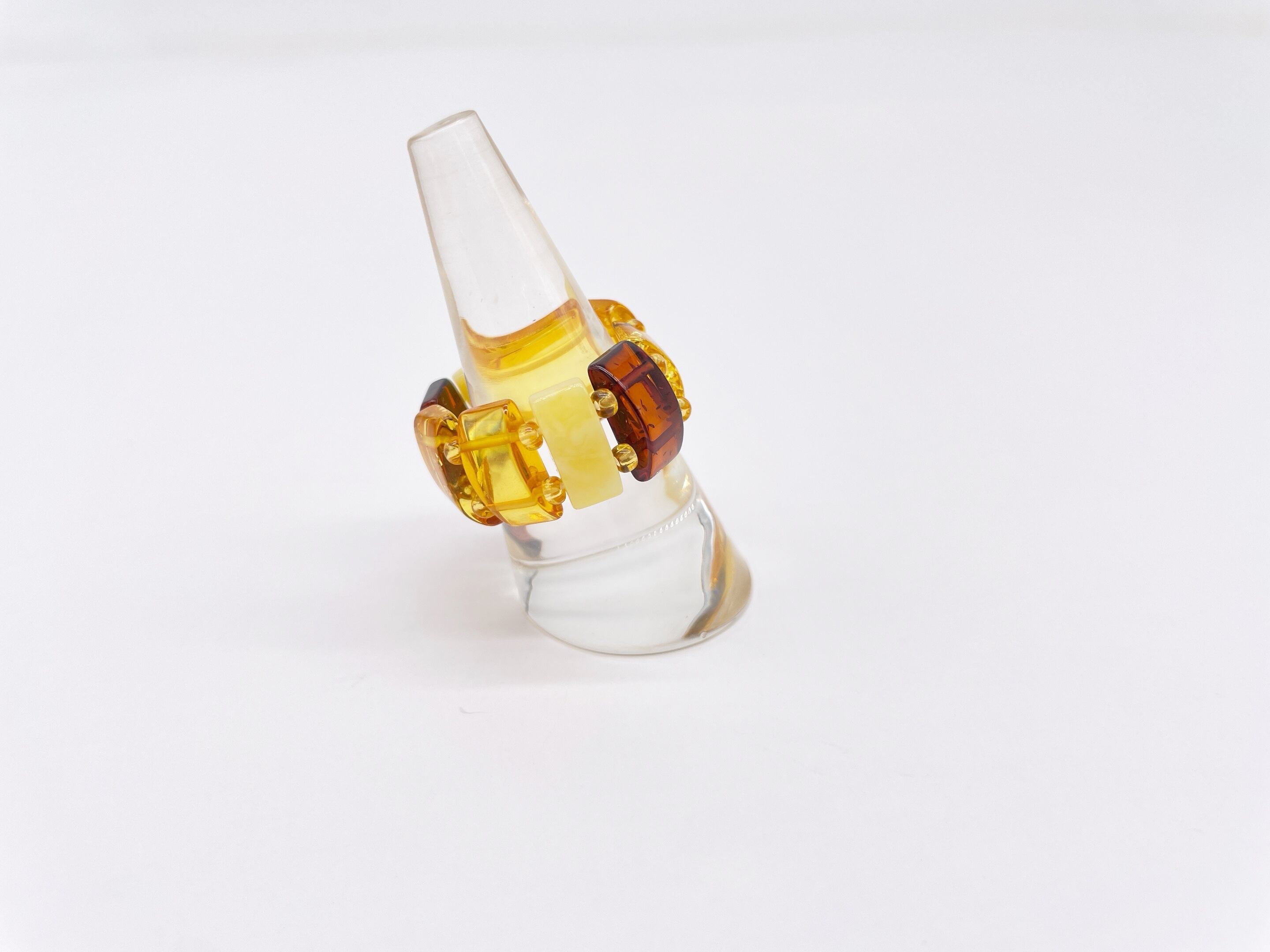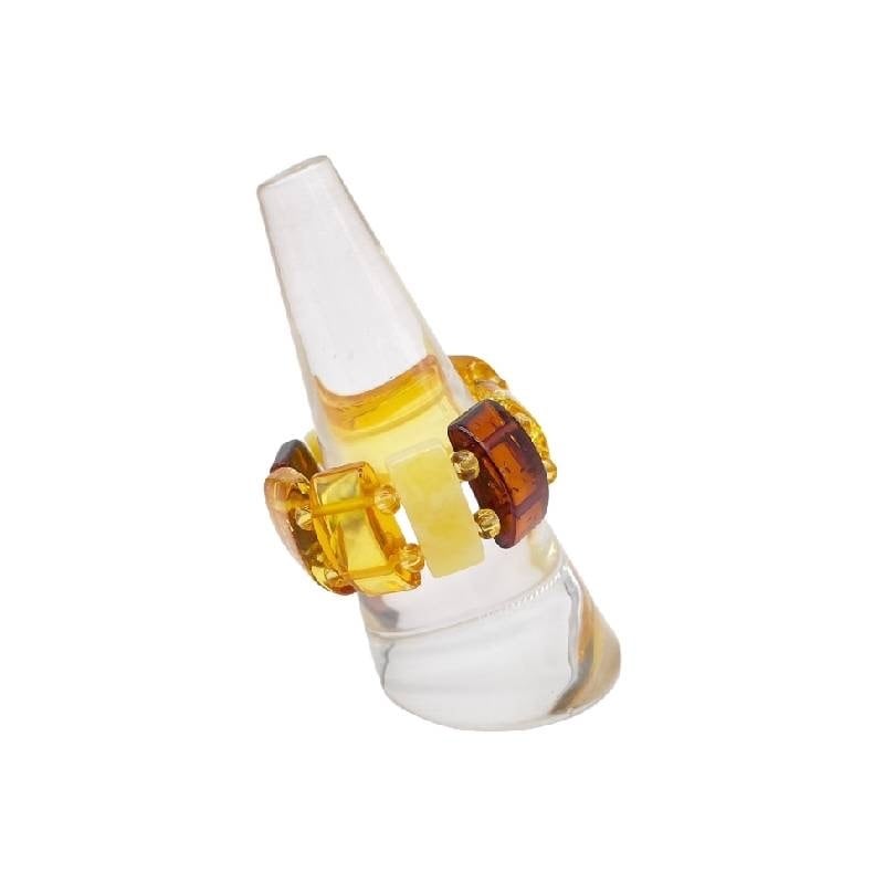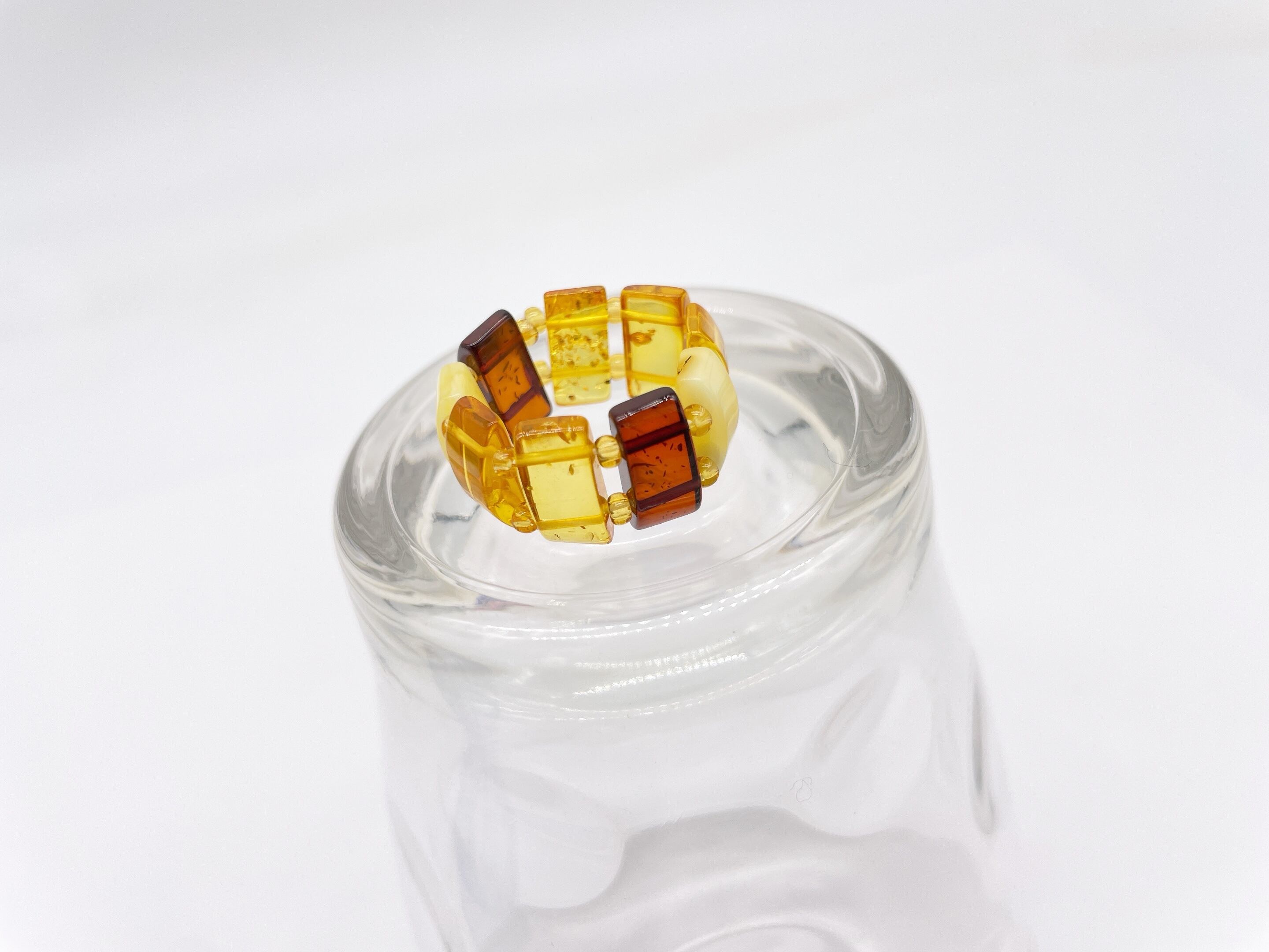 ●サイズ #14〜#16 (フリー)琥珀 幅約10ミリ ●説明 本琥珀(バルティックアンバー)使用 本琥珀(乳白ミルキー)使用 本琥珀(コニャックアンバー)使用 シリコンゴム使用 バルティックアンバーをメインに、柔らかな乳白ミルキーと深みのあるコニャックアンバーを組み合わせた、贅沢なリングです。バルティックアンバーを、リング全体の輝きを引き立てる主役としてふんだんに使用したことで、光を受けるたびに温かみのある煌めきを放ちます。そこに乳白ミルキーとコニャックアンバーを加えることで、存在感アップ!3色の本琥珀が織りなすコントラストは、自然が生み出した色彩のハーモニー。スクエアカットを連ねたデザインは、クラシックな美しさにモダンな要素を加え、シンプルな装いにも華やぎをプラスします。シリコンゴムを使用しているので伸縮性があり、指にやさしくフィットし、長時間の着用も快適。本琥珀は天然素材の為、非常に付け心地が良いですしアレルギーの心配も無いので安心です。商品はこちらの梱包にて大切に発送致します。指先に、三重奏の輝き。天然素材の為、色目やサイズ感は多少異なる場合がございます。※べっ甲 及び琥珀等の天然素材はすべて本物です。希望小売価格\7,500