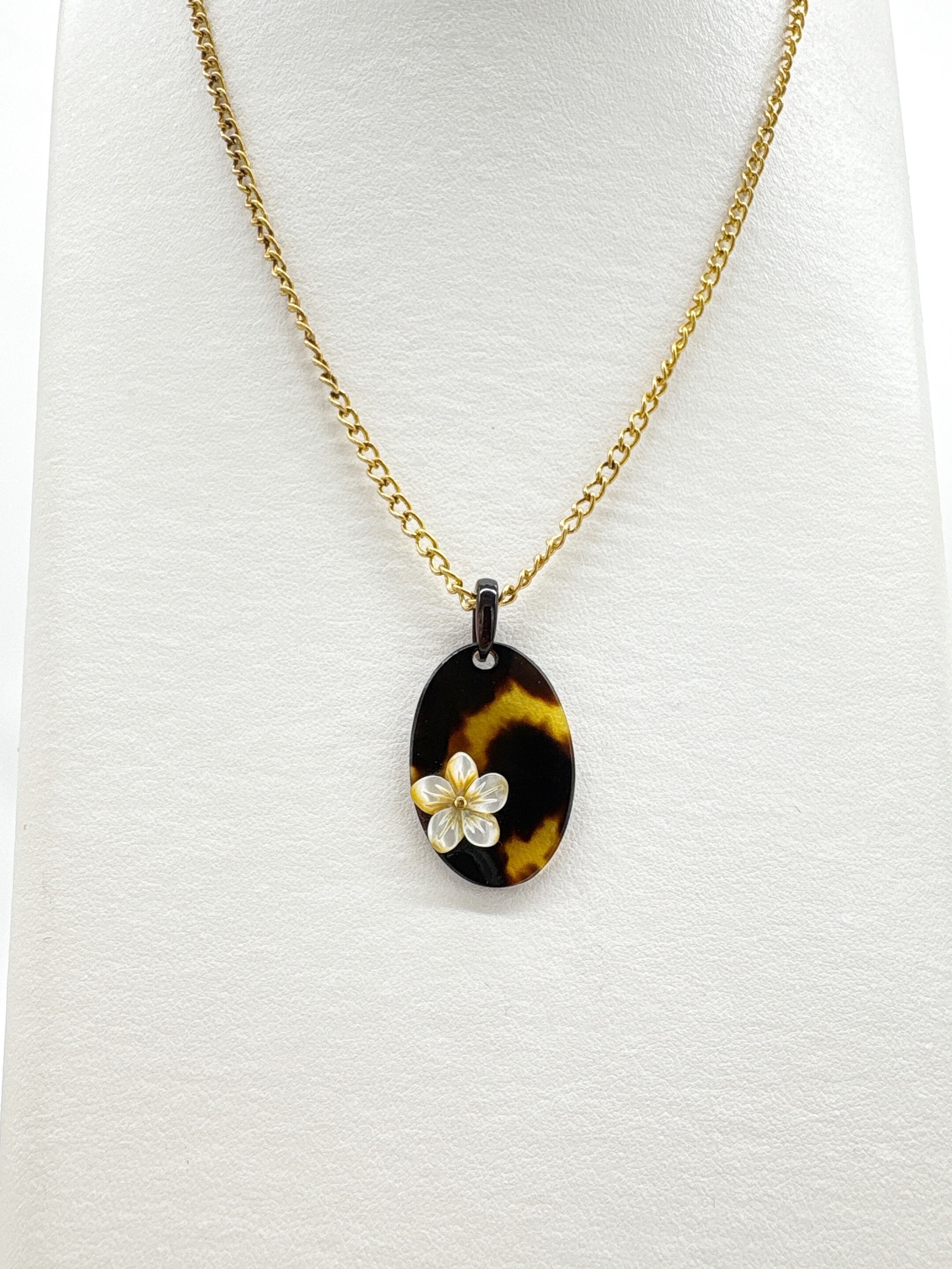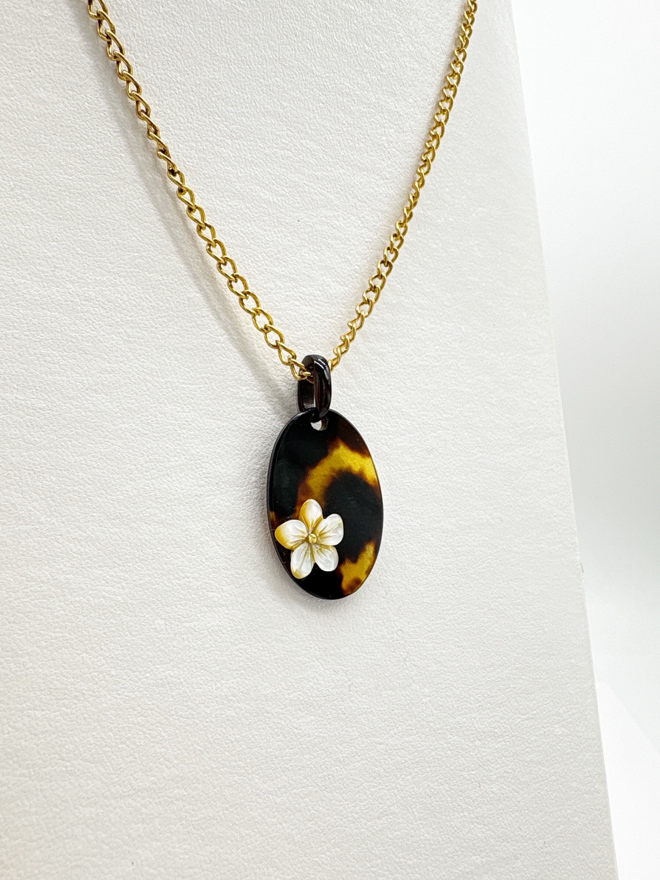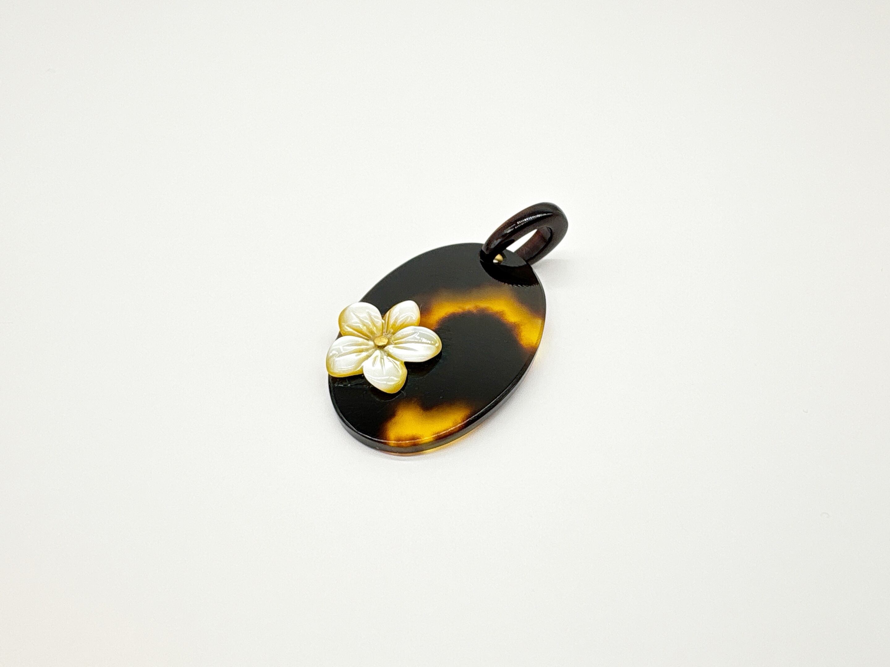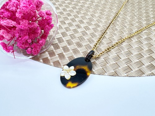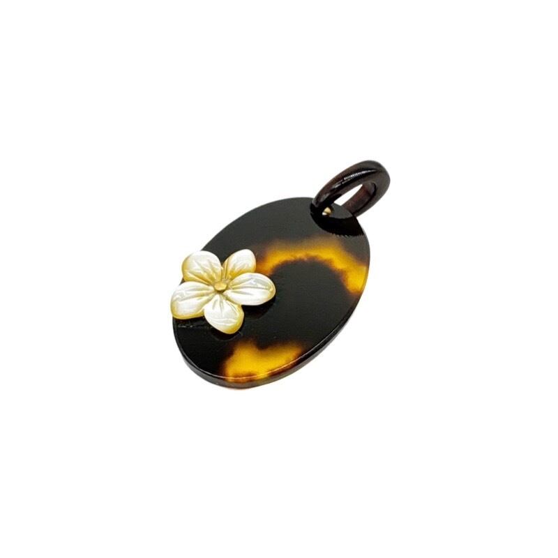 本べっ甲を丁寧に磨き上げ、滑らかな楕円プレートに、小花モチーフに加工した蝶貝を添えたペンダントトップです。オーバルタイプの本べっ甲は適度な厚みと丸みを持ち、胸元に自然に沿う柔らかなフォルムでお顔回りを優しく演出。そこに立体的な花の蝶貝を組み合わせることで、シンプルな造形の中に上品なアクセントが生まれています。蝶貝の輝きとべっ甲の艶が調和し、和装にも洋装にも取り入れやすいデザイン。やさしい印象を添える、小花のワンポイントが魅力の一品で、このやわらかい雰囲気は、ギフトにも選びやすいデザインです!素材の良さと形の美しさが引き立つ、一つ持っておくと長く楽しめる一品です。こちらの金メッキの付属チェーンはサービスでお付けしておりますが、お手持ちのチェーンなどに通してもお使い頂ける商品です。画像にあるスピネルチェーン(別売り)と合わせて頂くと、より豪華な仕上がりになります。心にふわりと寄り添うアクセサリーです。毎日に小さな可憐さを添えて。商品はこちらの梱包にて大切に発送致します。天然素材の為、色目やサイズ感は多少異なる場合がございます。※べっ甲及び琥珀等の天然素材はすべて本物です。通常希望小売価格¥10,000