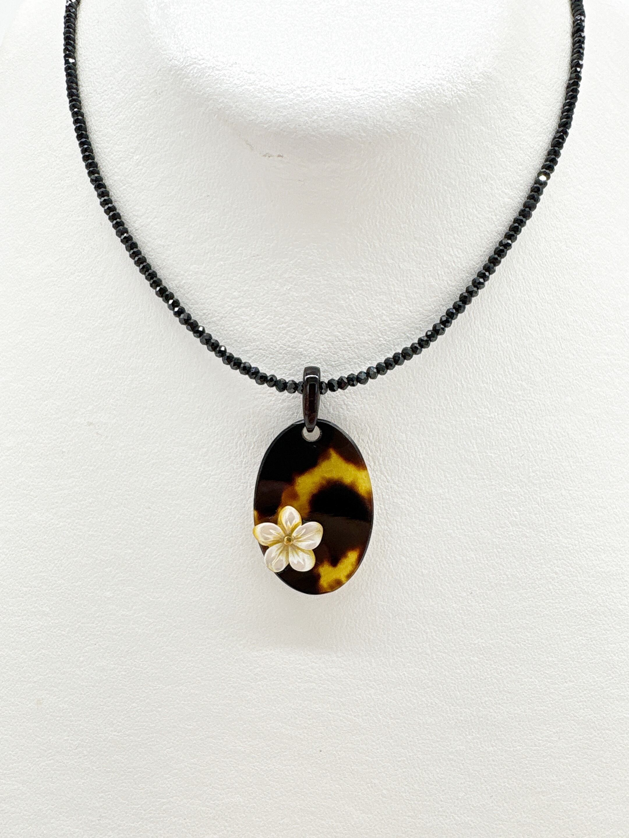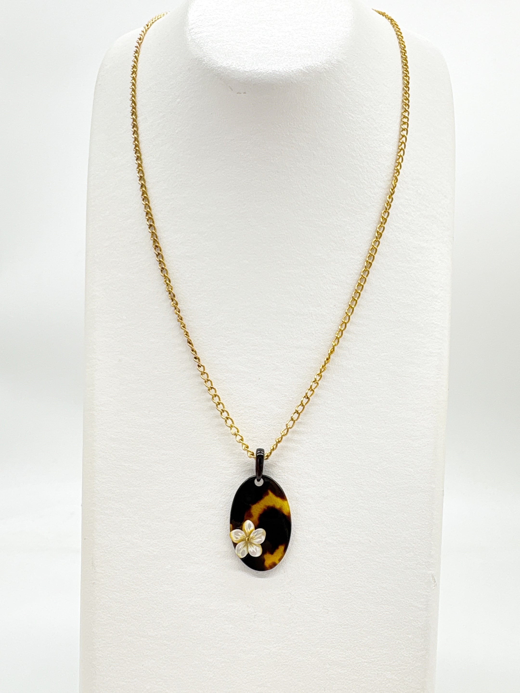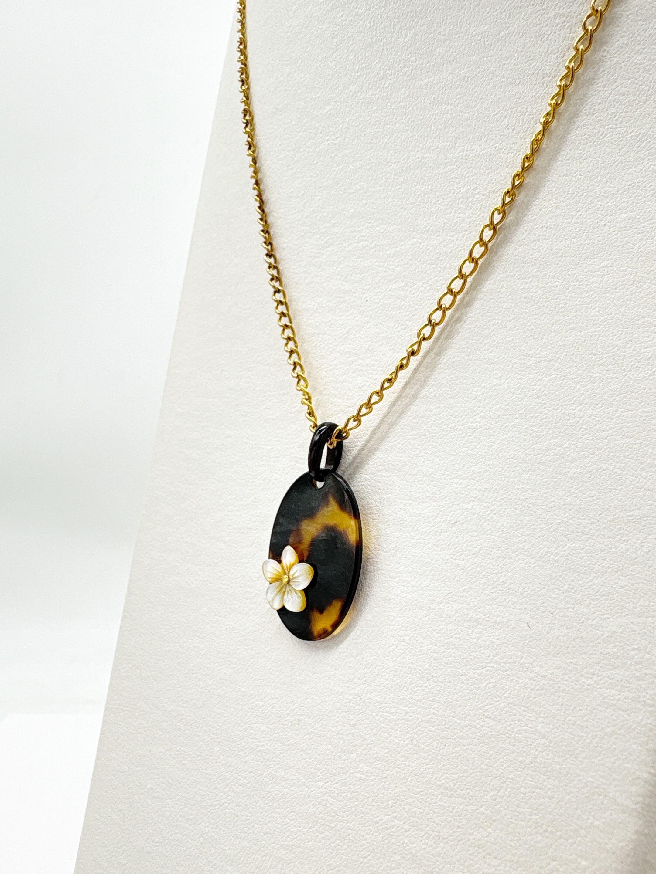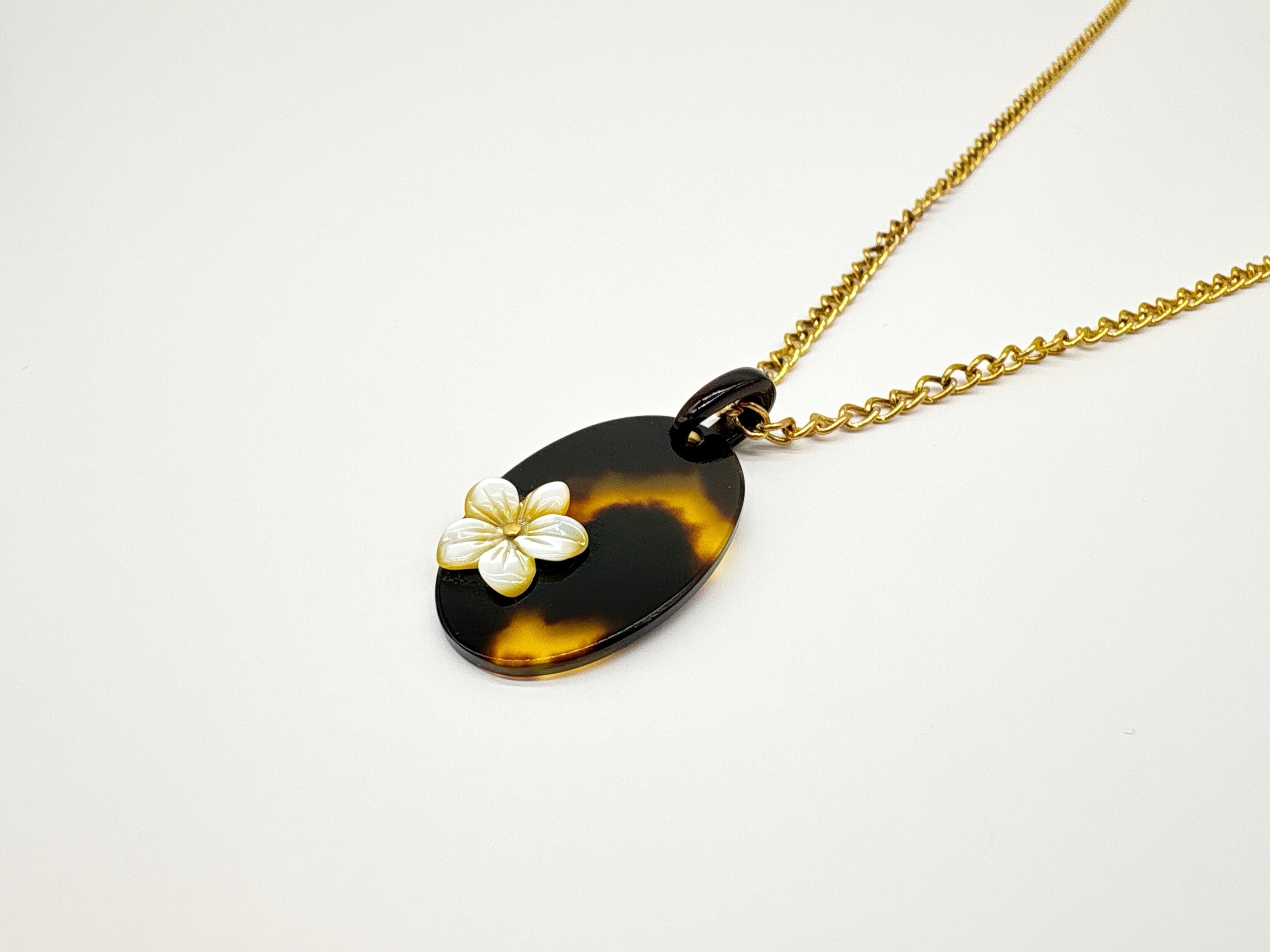 本べっ甲を丁寧に磨き上げ、滑らかな楕円プレートに、小花モチーフに加工した蝶貝を添えたペンダントトップです。オーバルタイプの本べっ甲は適度な厚みと丸みを持ち、胸元に自然に沿う柔らかなフォルムでお顔回りを優しく演出。そこに立体的な花の蝶貝を組み合わせることで、シンプルな造形の中に上品なアクセントが生まれています。蝶貝の輝きとべっ甲の艶が調和し、和装にも洋装にも取り入れやすいデザイン。やさしい印象を添える、小花のワンポイントが魅力の一品で、このやわらかい雰囲気は、ギフトにも選びやすいデザインです!素材の良さと形の美しさが引き立つ、一つ持っておくと長く楽しめる一品です。こちらの金メッキの付属チェーンはサービスでお付けしておりますが、お手持ちのチェーンなどに通してもお使い頂ける商品です。画像にあるスピネルチェーン(別売り)と合わせて頂くと、より豪華な仕上がりになります。心にふわりと寄り添うアクセサリーです。毎日に小さな可憐さを添えて。商品はこちらの梱包にて大切に発送致します。天然素材の為、色目やサイズ感は多少異なる場合がございます。※べっ甲及び琥珀等の天然素材はすべて本物です。通常希望小売価格¥10,000