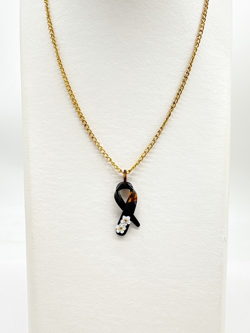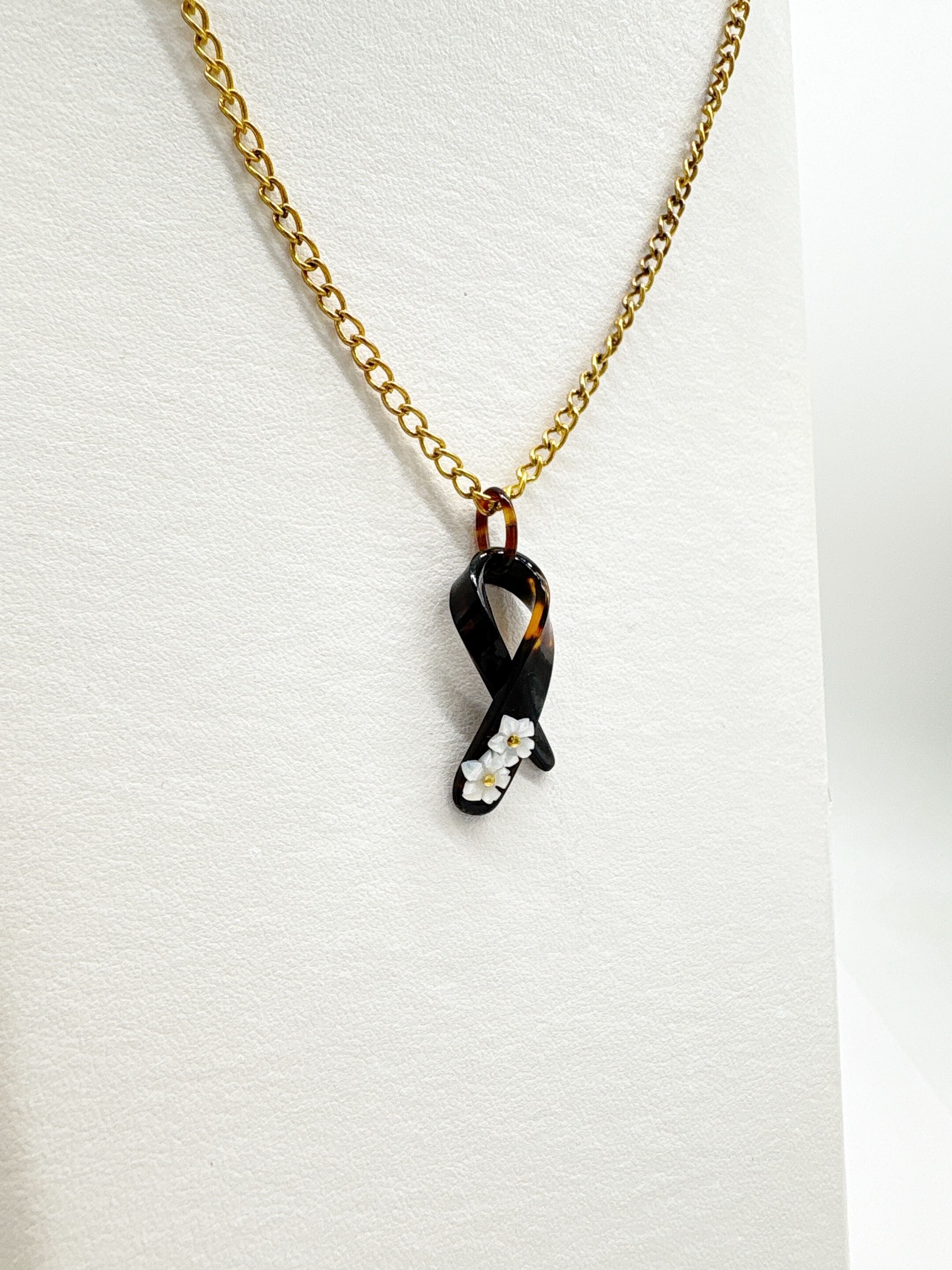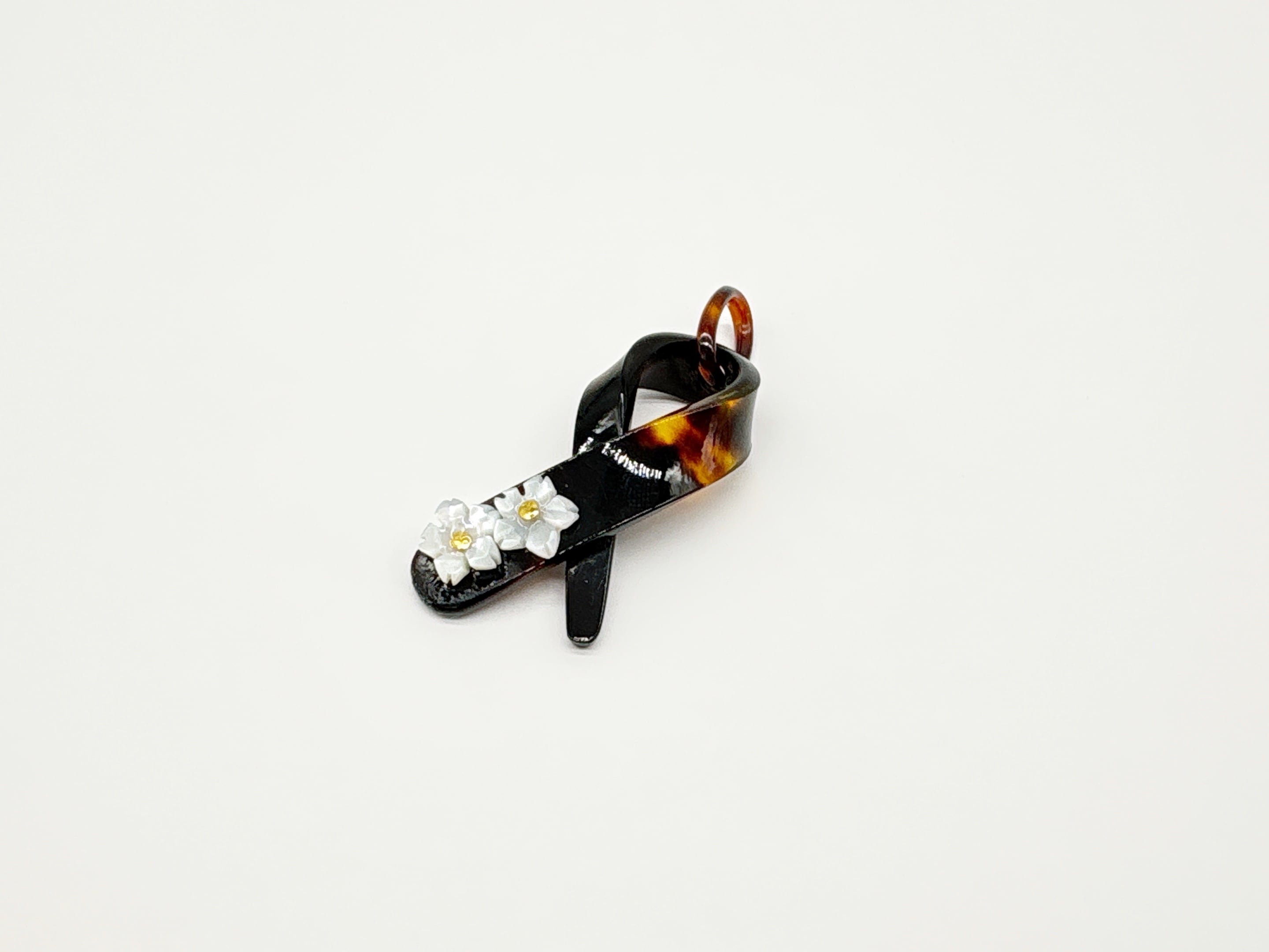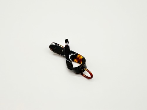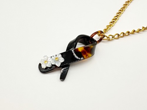 本べっ甲をなめらかに曲げ加工し、立体的なリボンを思わせるフォルムに仕上げたペンダントトップです。緩やかな曲線を描く本べっ甲のラインは、職人による技術と、厚みのある素材だからこそ生まれる造形で、角度によって印象が変わる立体感が魅力です。先端部分には白蝶貝を加工した小花を二輪あしらい、柔らかい存在感を添えています。白蝶貝の花はほどよい厚みと立体感が特徴で、凛とした表情の中にも可憐さが宿る仕上がりに。べっ甲の滑らかな面と白蝶貝の繊細な彫刻が対比となり、全体に上品なリズムを生み出しています。個性的な形でありながら装いに自然に馴染み、カジュアル・フォーマルにもすっと合わせられる万能な逸品です!胸元にほのかな華やぎを添える、表情豊かな一点もののペンダント。こちらの金メッキの付属チェーンはサービスでお付けしておりますが、お手持ちのチェーンなどに通してもお使い頂ける商品です。画像にあるスピネルチェーン(別売り)と合わせて頂くと、より豪華な仕上がりになります。しなやかな美しさをそっと添えてくれる商品です。商品はこちらの梱包にて大切に発送致します。天然素材の為、色目やサイズ感は多少異なる場合がございます。※べっ甲及び琥珀等の天然素材はすべて本物です。通常希望小売価格¥9,000