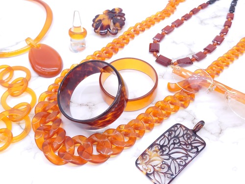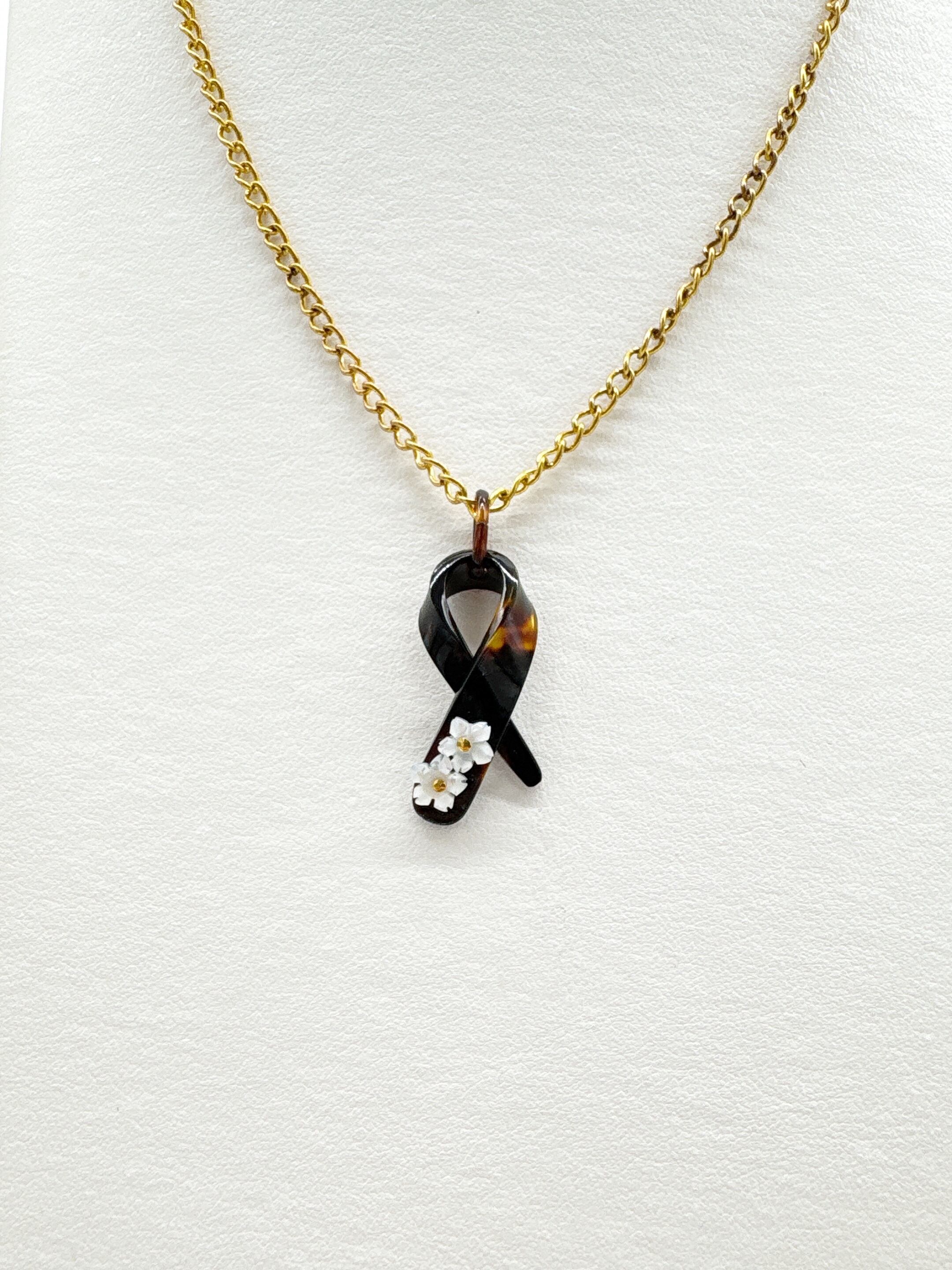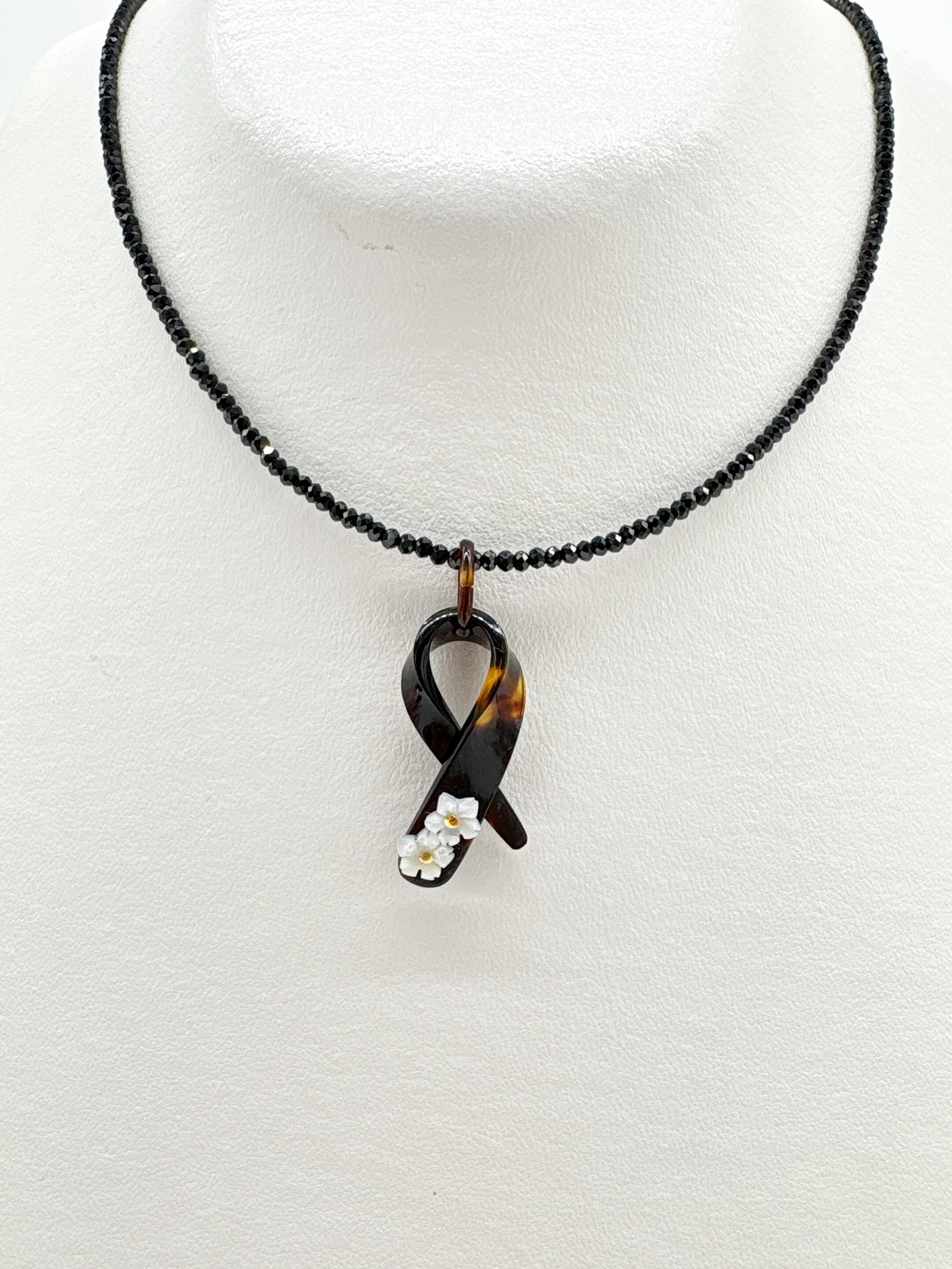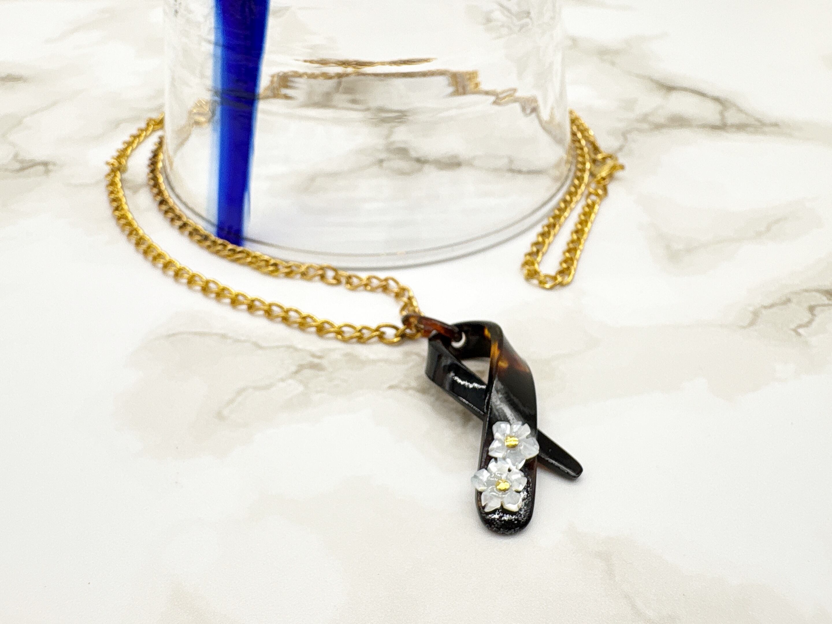 本べっ甲をなめらかに曲げ加工し、立体的なリボンを思わせるフォルムに仕上げたペンダントトップです。緩やかな曲線を描く本べっ甲のラインは、職人による技術と、厚みのある素材だからこそ生まれる造形で、角度によって印象が変わる立体感が魅力です。先端部分には白蝶貝を加工した小花を二輪あしらい、柔らかい存在感を添えています。白蝶貝の花はほどよい厚みと立体感が特徴で、凛とした表情の中にも可憐さが宿る仕上がりに。べっ甲の滑らかな面と白蝶貝の繊細な彫刻が対比となり、全体に上品なリズムを生み出しています。個性的な形でありながら装いに自然に馴染み、カジュアル・フォーマルにもすっと合わせられる万能な逸品です!胸元にほのかな華やぎを添える、表情豊かな一点もののペンダント。こちらの金メッキの付属チェーンはサービスでお付けしておりますが、お手持ちのチェーンなどに通してもお使い頂ける商品です。画像にあるスピネルチェーン(別売り)と合わせて頂くと、より豪華な仕上がりになります。しなやかな美しさをそっと添えてくれる商品です。商品はこちらの梱包にて大切に発送致します。天然素材の為、色目やサイズ感は多少異なる場合がございます。※べっ甲及び琥珀等の天然素材はすべて本物です。通常希望小売価格¥9,000