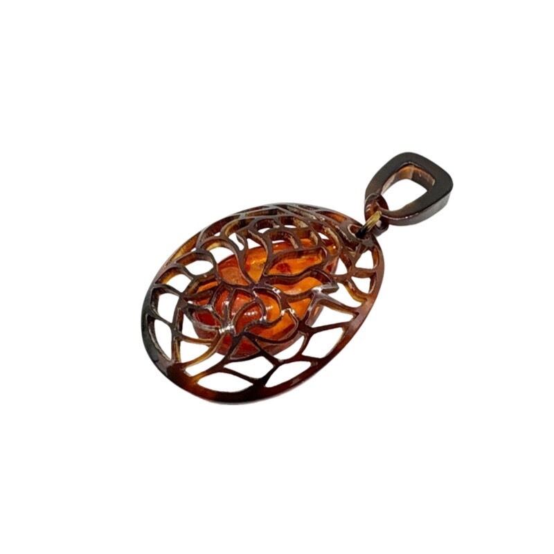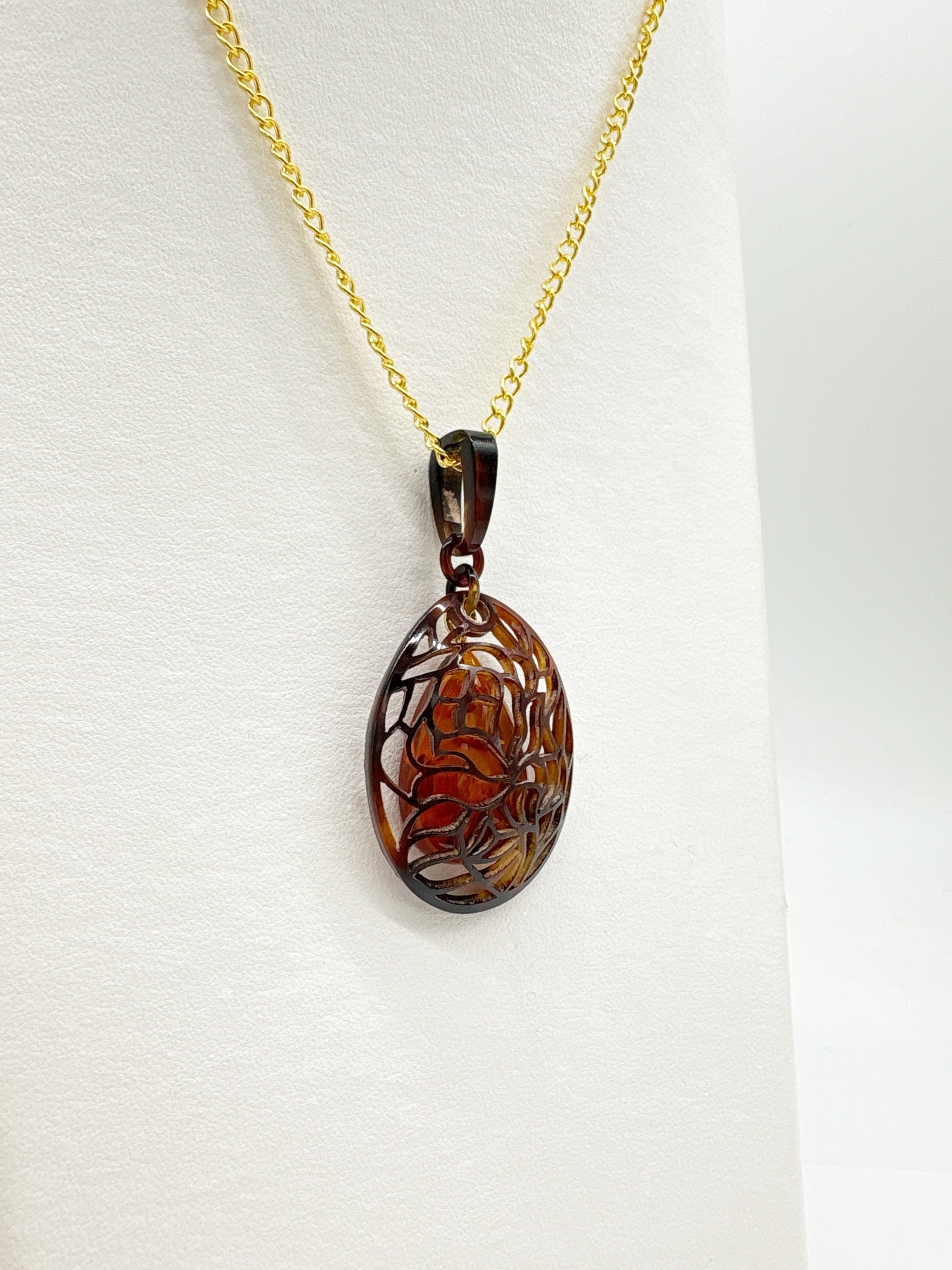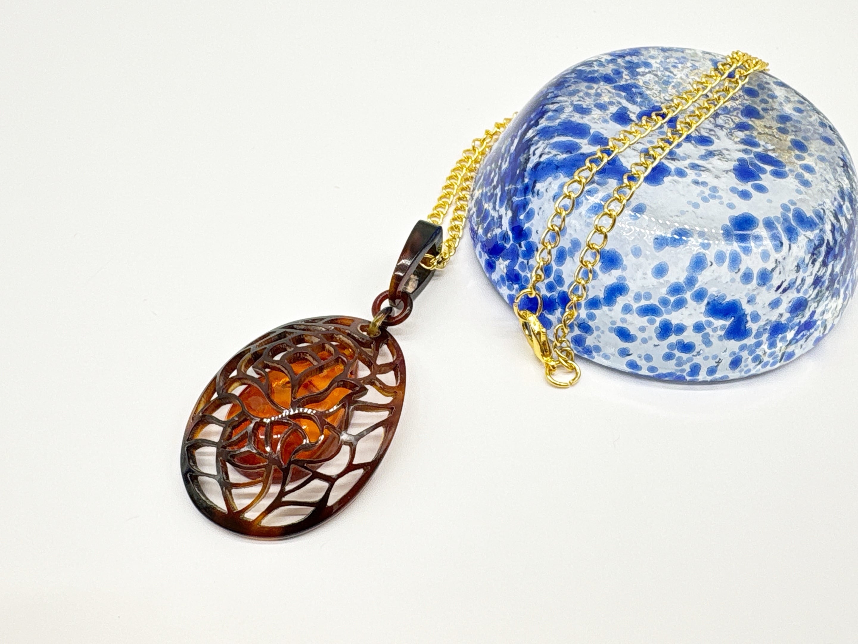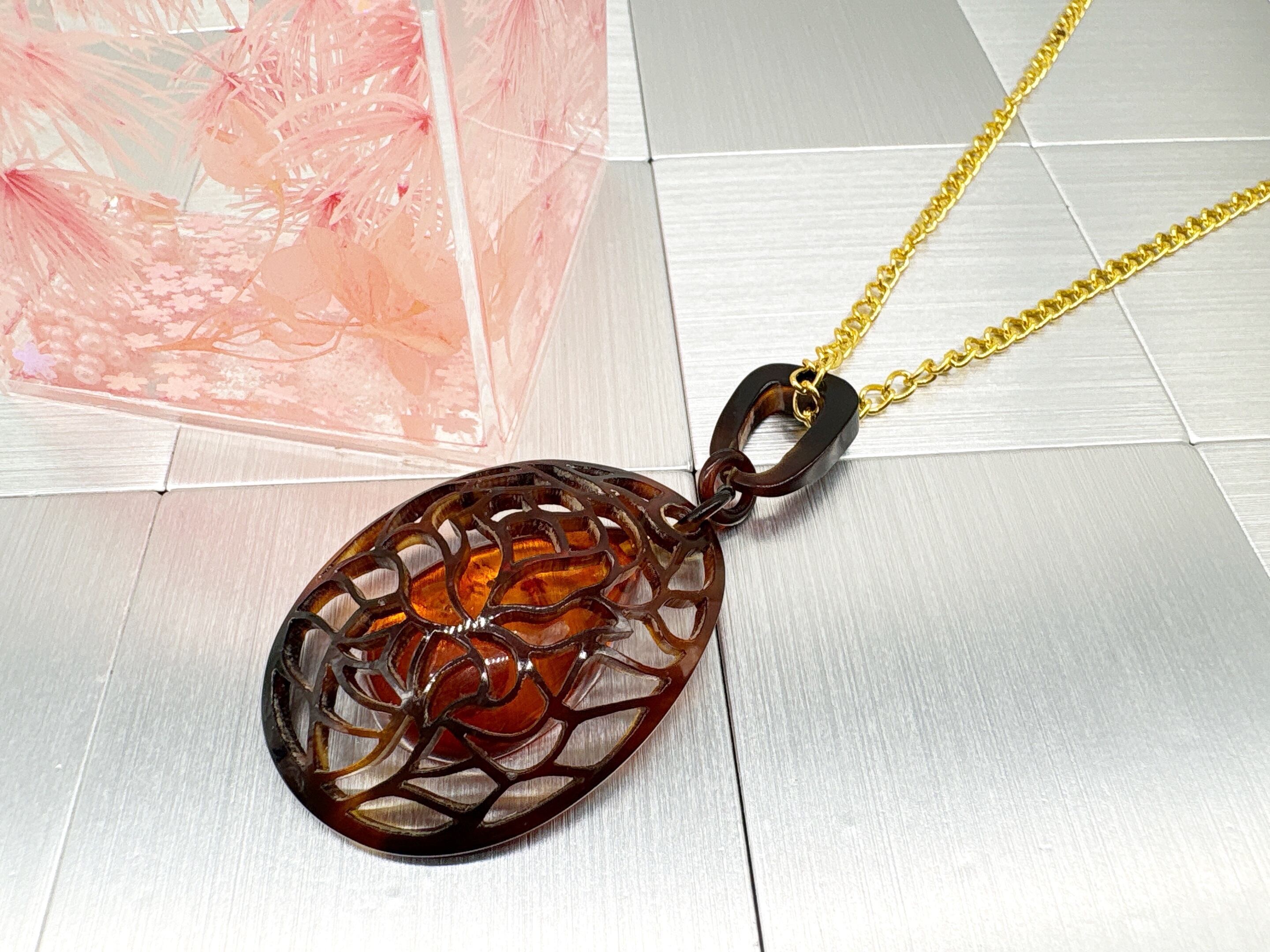 本べっ甲を職人の技によって丁寧に透かし彫りし、中央にコニャックアンバーを添えた、軽やかさと深みを併せ持つペンダントです。べっ甲はオーバルタイプのプレートに複雑なラインを重ねるように彫り込まれ、バラのデザインが美しい伸びやかな模様が、優しい陰影とリズムを生み出しています。透かし部分から光が抜けることで、べっ甲特有の艶がより際立ち、首元に軽やかな印象を与えてくれます。中心に据えられたコニャックアンバーは、長い年月を経た自然素材ならではの奥行きが魅力。透かし模様越しに光を受けると、内部にふわりと温かみが宿り、べっ甲のしっとりとした質感と美しく調和します。透かしの立体感と琥珀の透明感が重なり合うことで、一つのモチーフの中に複数の表情が生まれ、見る角度によって雰囲気が変化する仕上がりです!軽やかでありながら細工の存在感をしっかりと感じられるデザインは、普段の装いはもちろん、特別な日のアクセントとしてもおすすめ。こちらの金メッキの付属チェーンはサービスでお付けしておりますが、お手持ちのチェーンなどに通してもお使い頂ける商品です。画像にあるスピネルチェーン(別売り)や鼈甲チェーンと組合わせて頂くと、より豪華な仕上がりになります。思わず手に取りたくなる、自然体の美しさを胸元に。商品はこちらの梱包にて大切に発送致します。天然素材の為、色目やサイズ感は多少異なる場合がございます。※べっ甲及び琥珀等の天然素材はすべて本物です。通常希望小売価格¥30,000