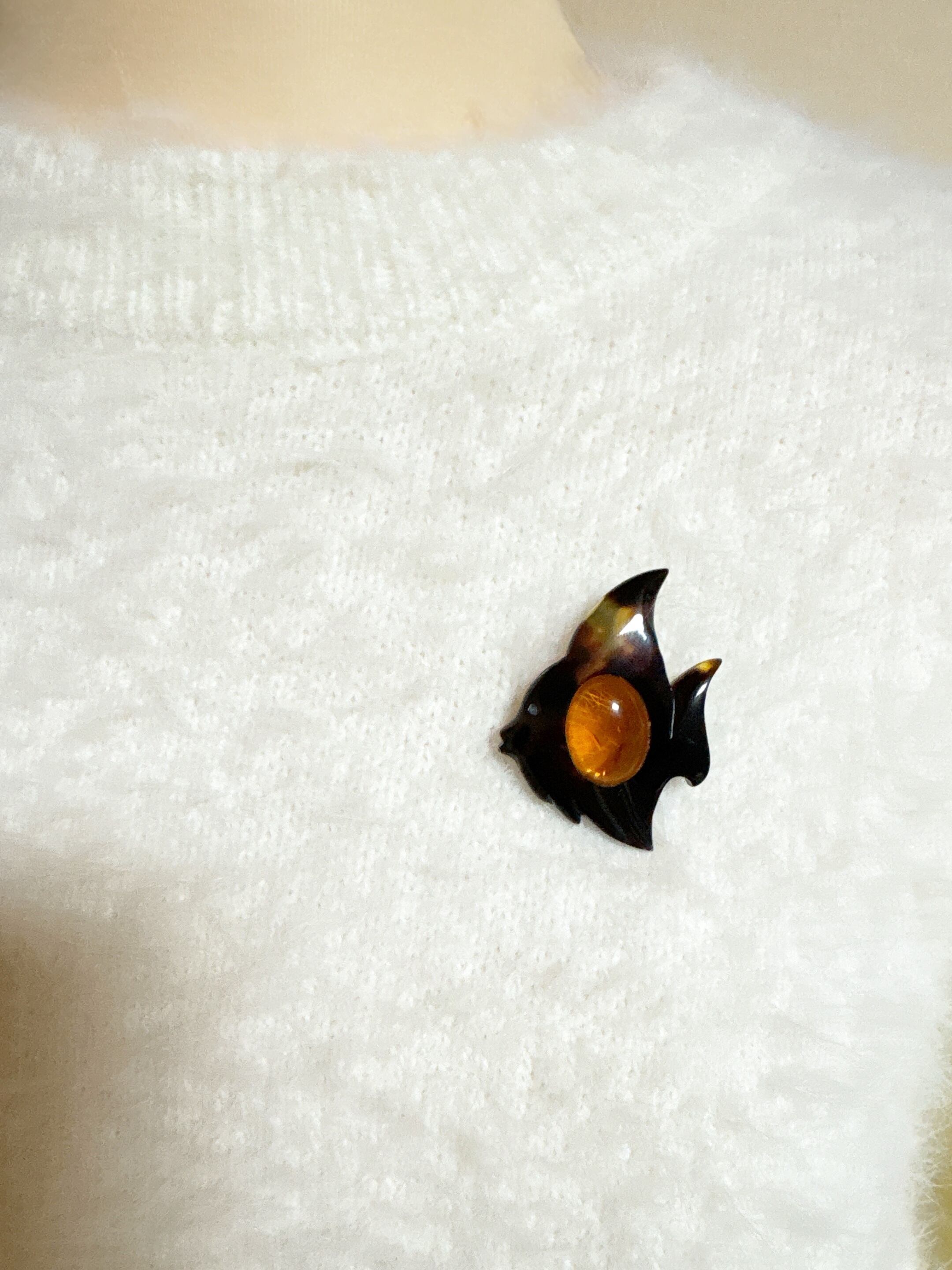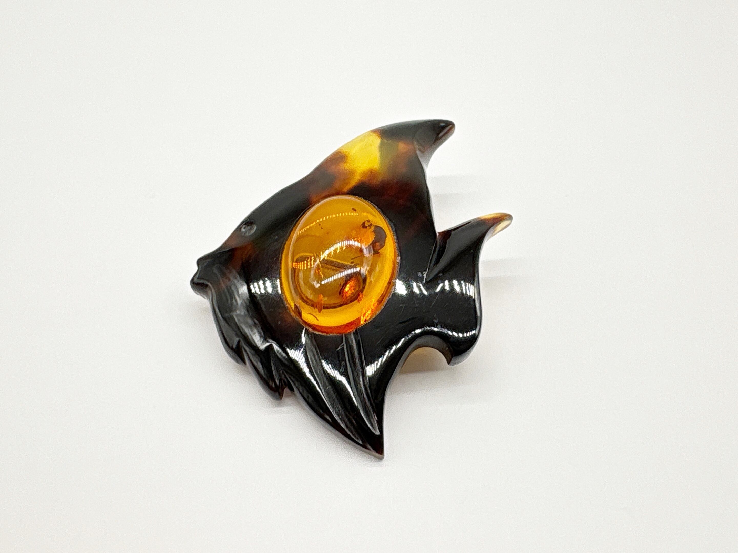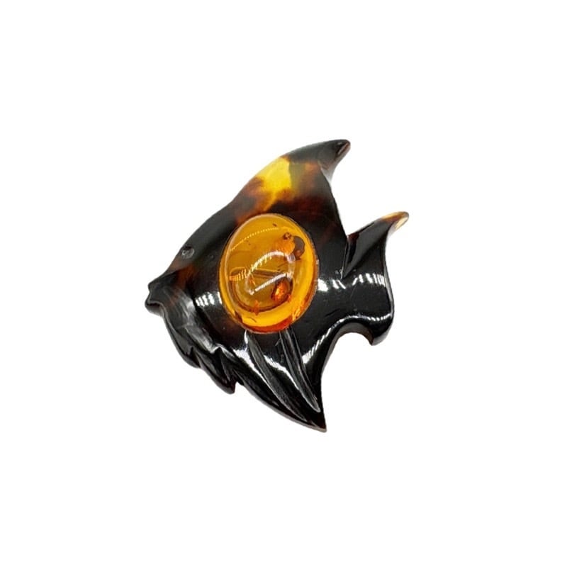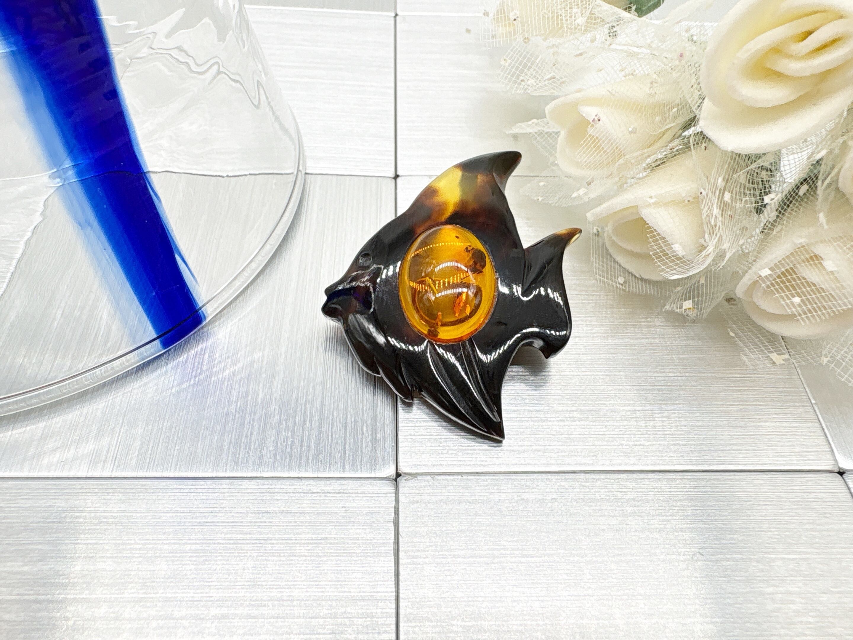 ●サイズ タテ約4.2cm×ヨコ約3.3cm ●説明 本べっ甲 バラフ(背甲)使用 本琥珀(コニャックアンバー)使用 本べっ甲を贅沢に用い、エンゼルフィッシュの伸びやかな輪郭を職人の手により丁寧に演出されたブローチペンダントです。すっと張り出した背びれと、滑らかに波打つ尾びれが美しく調和し、水中をゆったりと泳ぐ姿をそのまま写し取ったような優雅なシルエットが魅力です。胴の中央には本琥珀・コニャックアンバーをあしらい、丸みを帯びたフォルムがアクセントとして存在感を放っています。透明感のある琥珀の内部に映る光(グリッター)の揺らぎが、まるで生きた魚の息づかいを思わせ、デザイン全体に豊かな表情を添えています。本べっ甲と本琥珀ならではのなめらかな質感と軽やかな着け心地は、身に着けるたびに手仕事の温もりを感じられる特別な魅力。ブローチとしても、ペンダントとしても楽しめる二通りの仕様で、装いに合わせて自在に使い分けができます。カジュアル・フォーマル問わず合わせやすく、胸元やストール、ネックレスチェーンの上でも美しく映える、存在感と品の良さを兼ね備えた一品です!べっ甲はとても軽いためお洋服への負担も少なくお気軽にお使い頂けます。スピネルチェーン、べっ甲チェーン(別売り)と合わせて頂くと、より豪華な仕上がりになります。水のゆらぎのように、そっと装いにやさしい動きを。ブローチにもペンダントにもなる贅沢な逸品。商品はこちらの梱包にて大切に発送致します。天然素材の為、色目やサイズ感は多少異なる場合がございます。※べっ甲及び琥珀等の天然素材はすべて本物です。通常希望小売価格¥18,000