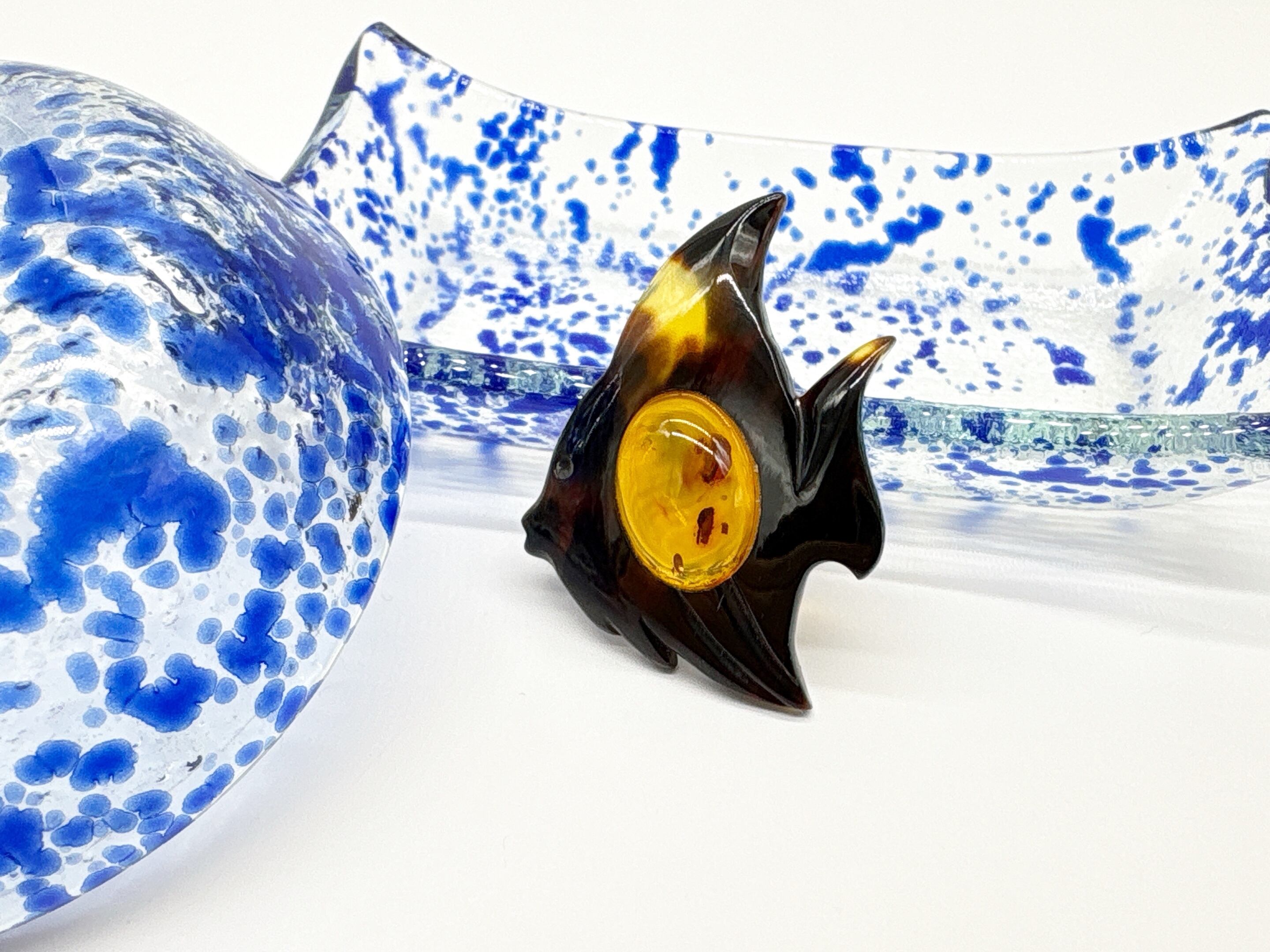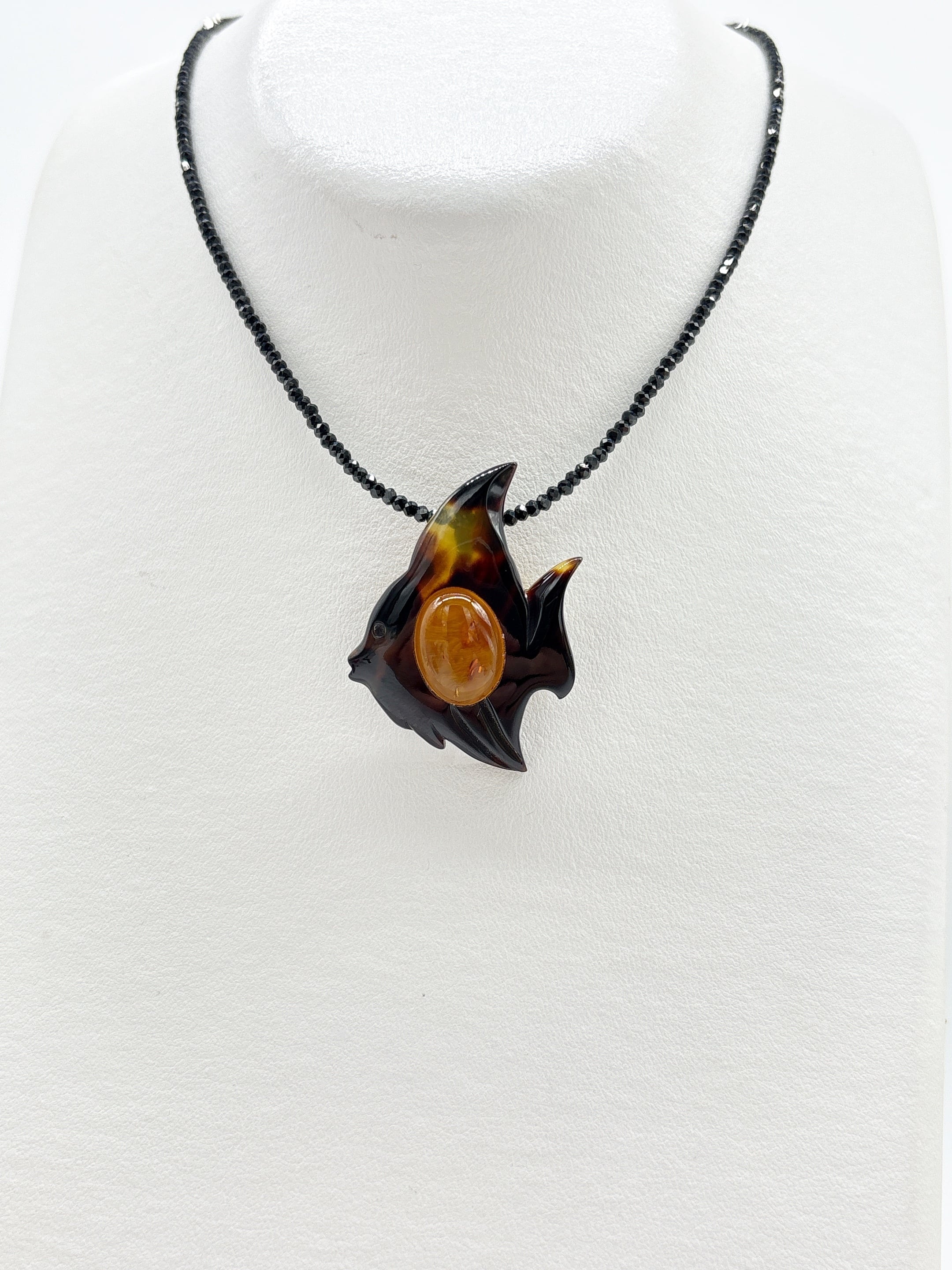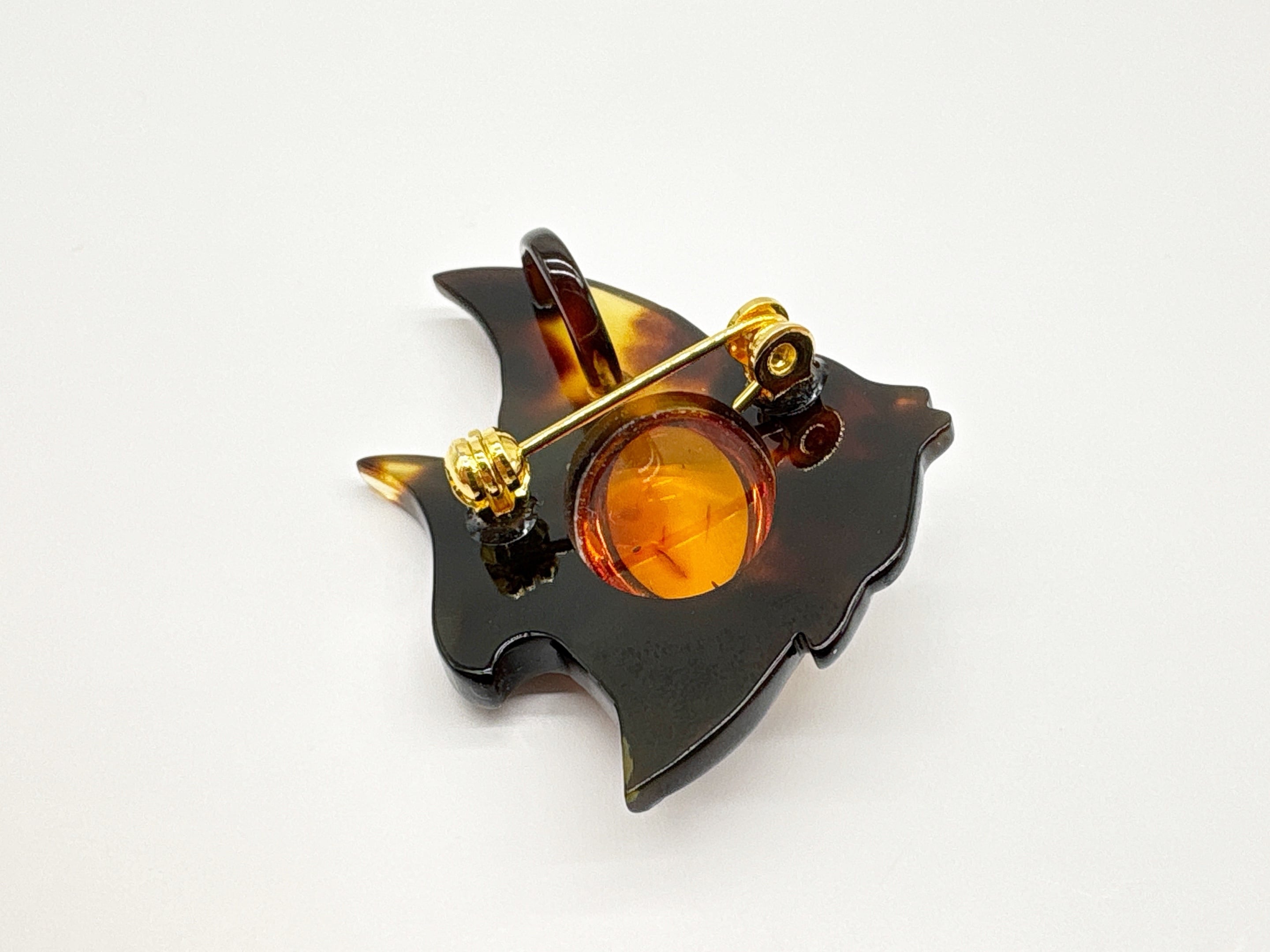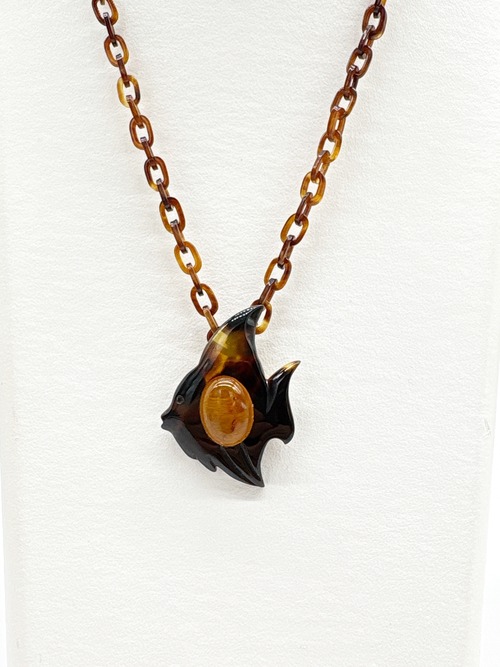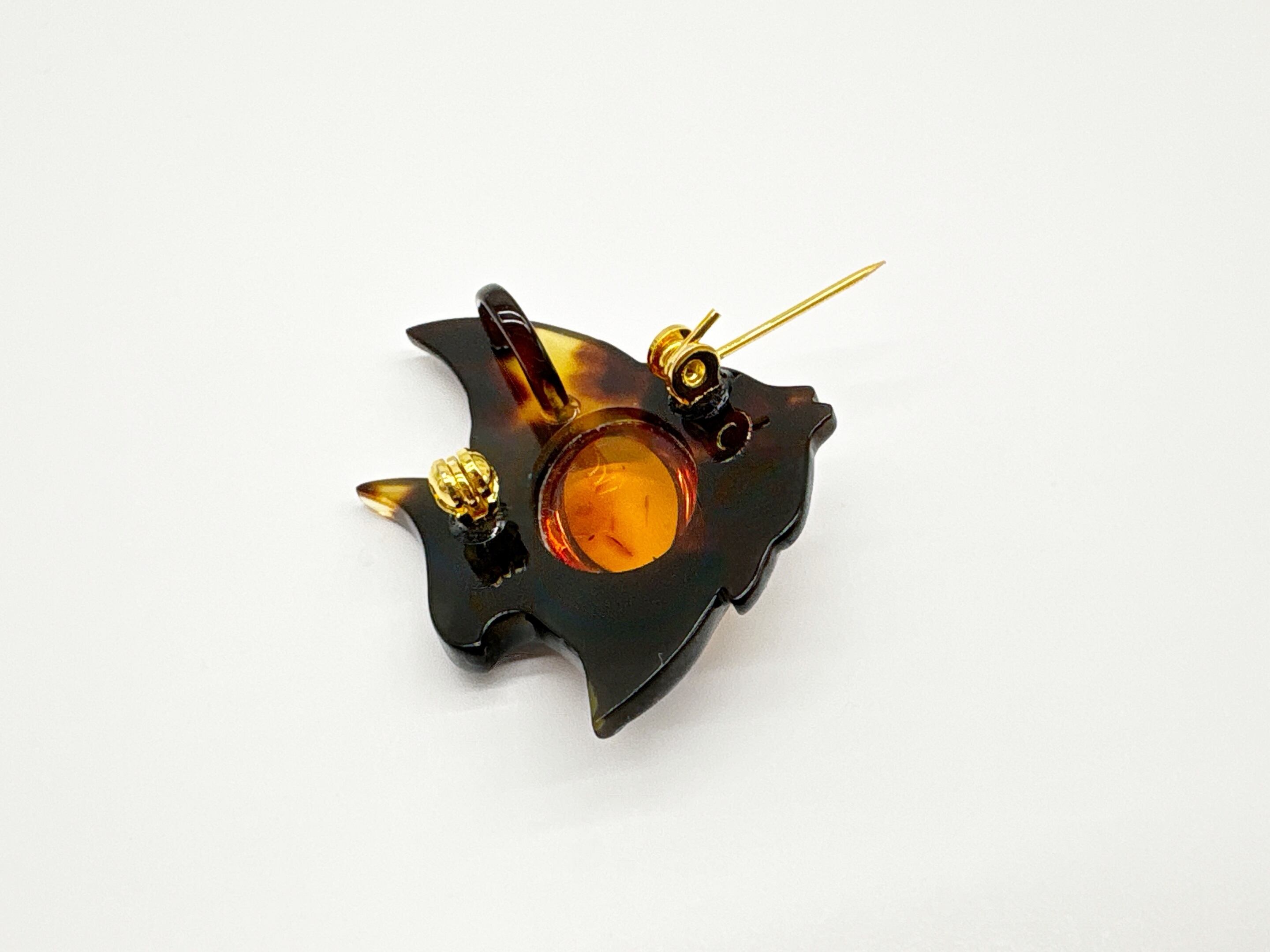 ●サイズ タテ約4.2cm×ヨコ約3.3cm ●説明 本べっ甲 バラフ(背甲)使用 本琥珀(コニャックアンバー)使用 本べっ甲を贅沢に用い、エンゼルフィッシュの伸びやかな輪郭を職人の手により丁寧に演出されたブローチペンダントです。すっと張り出した背びれと、滑らかに波打つ尾びれが美しく調和し、水中をゆったりと泳ぐ姿をそのまま写し取ったような優雅なシルエットが魅力です。胴の中央には本琥珀・コニャックアンバーをあしらい、丸みを帯びたフォルムがアクセントとして存在感を放っています。透明感のある琥珀の内部に映る光(グリッター)の揺らぎが、まるで生きた魚の息づかいを思わせ、デザイン全体に豊かな表情を添えています。本べっ甲と本琥珀ならではのなめらかな質感と軽やかな着け心地は、身に着けるたびに手仕事の温もりを感じられる特別な魅力。ブローチとしても、ペンダントとしても楽しめる二通りの仕様で、装いに合わせて自在に使い分けができます。カジュアル・フォーマル問わず合わせやすく、胸元やストール、ネックレスチェーンの上でも美しく映える、存在感と品の良さを兼ね備えた一品です!べっ甲はとても軽いためお洋服への負担も少なくお気軽にお使い頂けます。スピネルチェーン、べっ甲チェーン(別売り)と合わせて頂くと、より豪華な仕上がりになります。水のゆらぎのように、そっと装いにやさしい動きを。ブローチにもペンダントにもなる贅沢な逸品。商品はこちらの梱包にて大切に発送致します。天然素材の為、色目やサイズ感は多少異なる場合がございます。※べっ甲及び琥珀等の天然素材はすべて本物です。通常希望小売価格¥18,000
