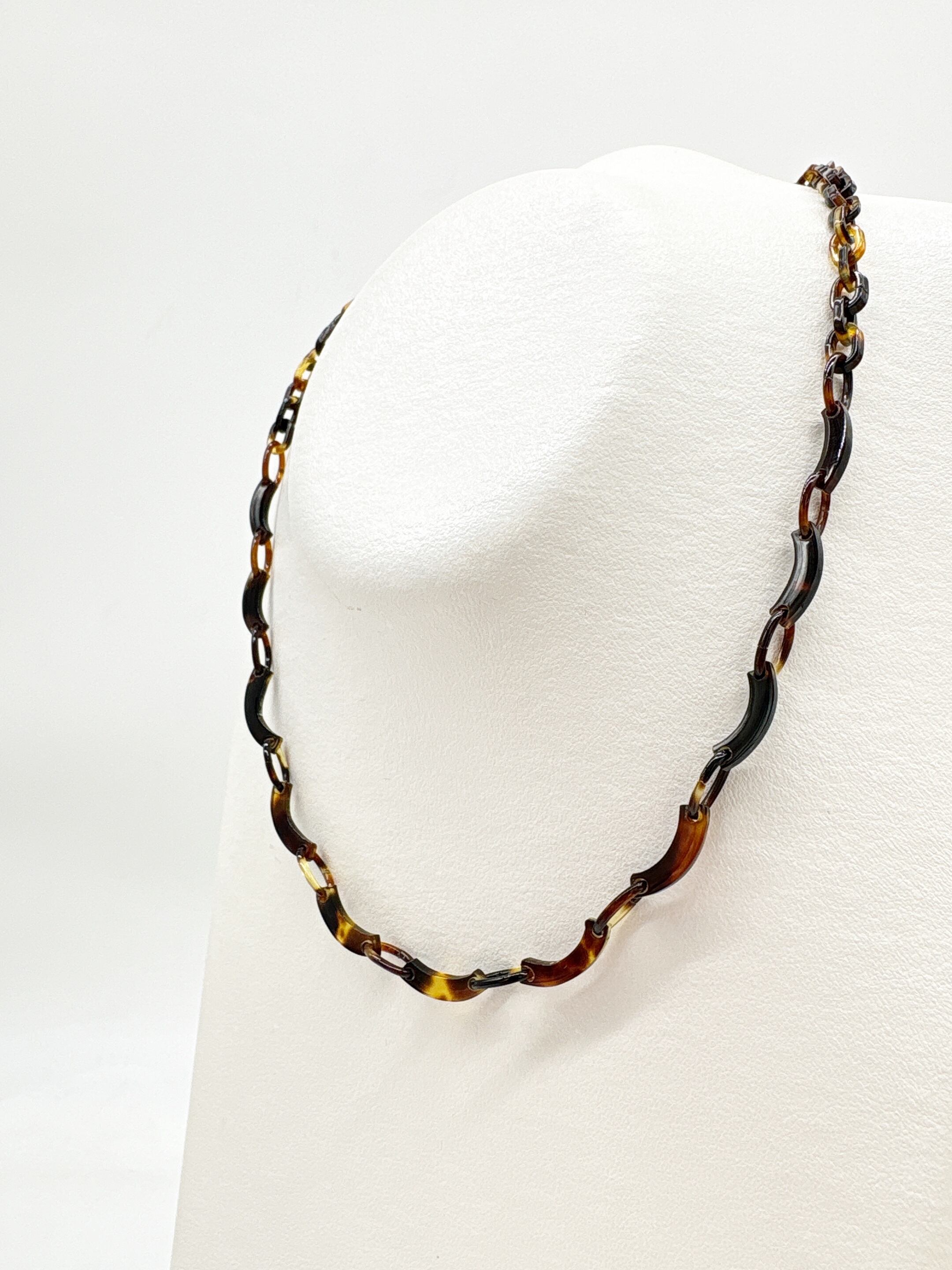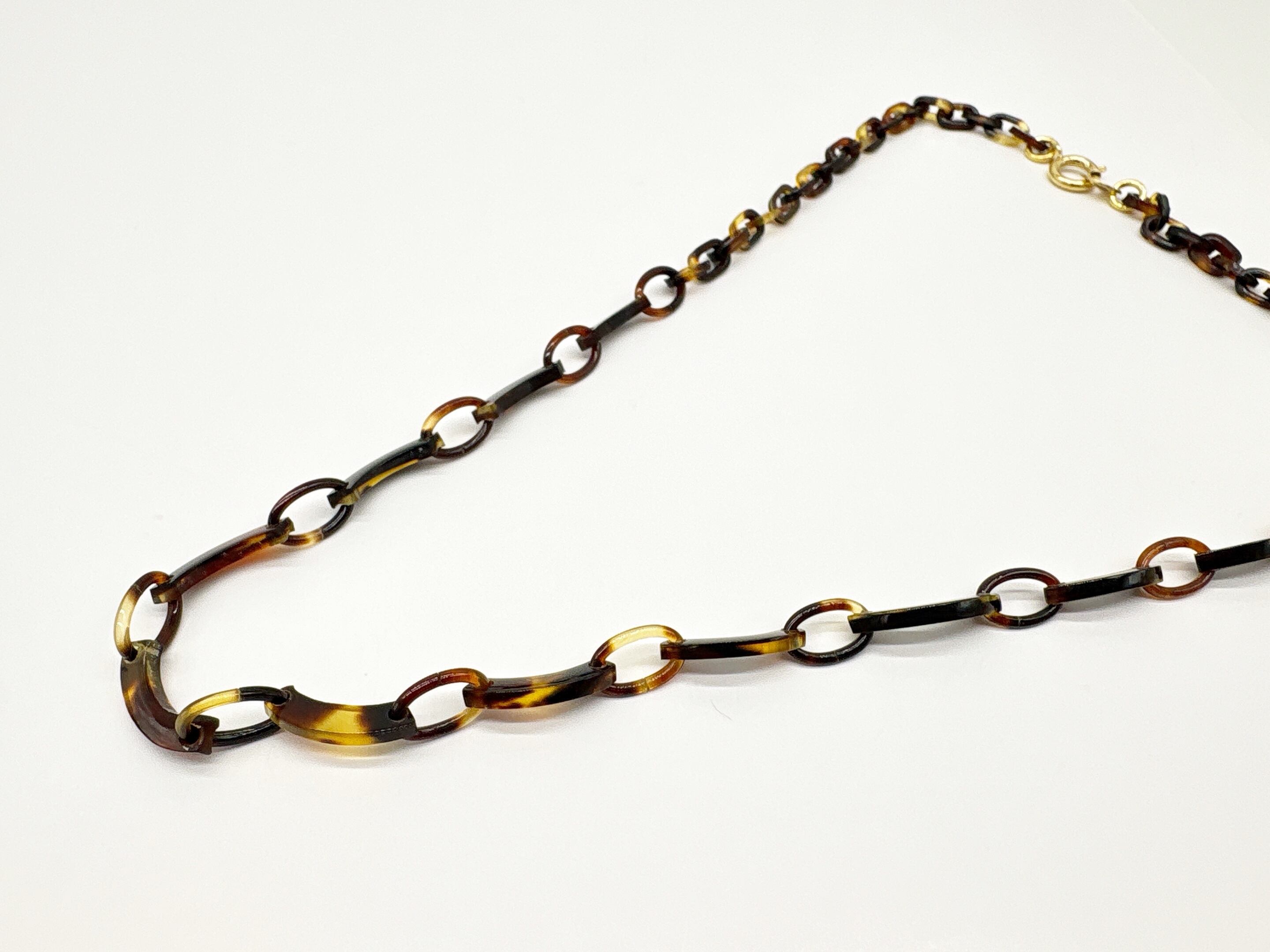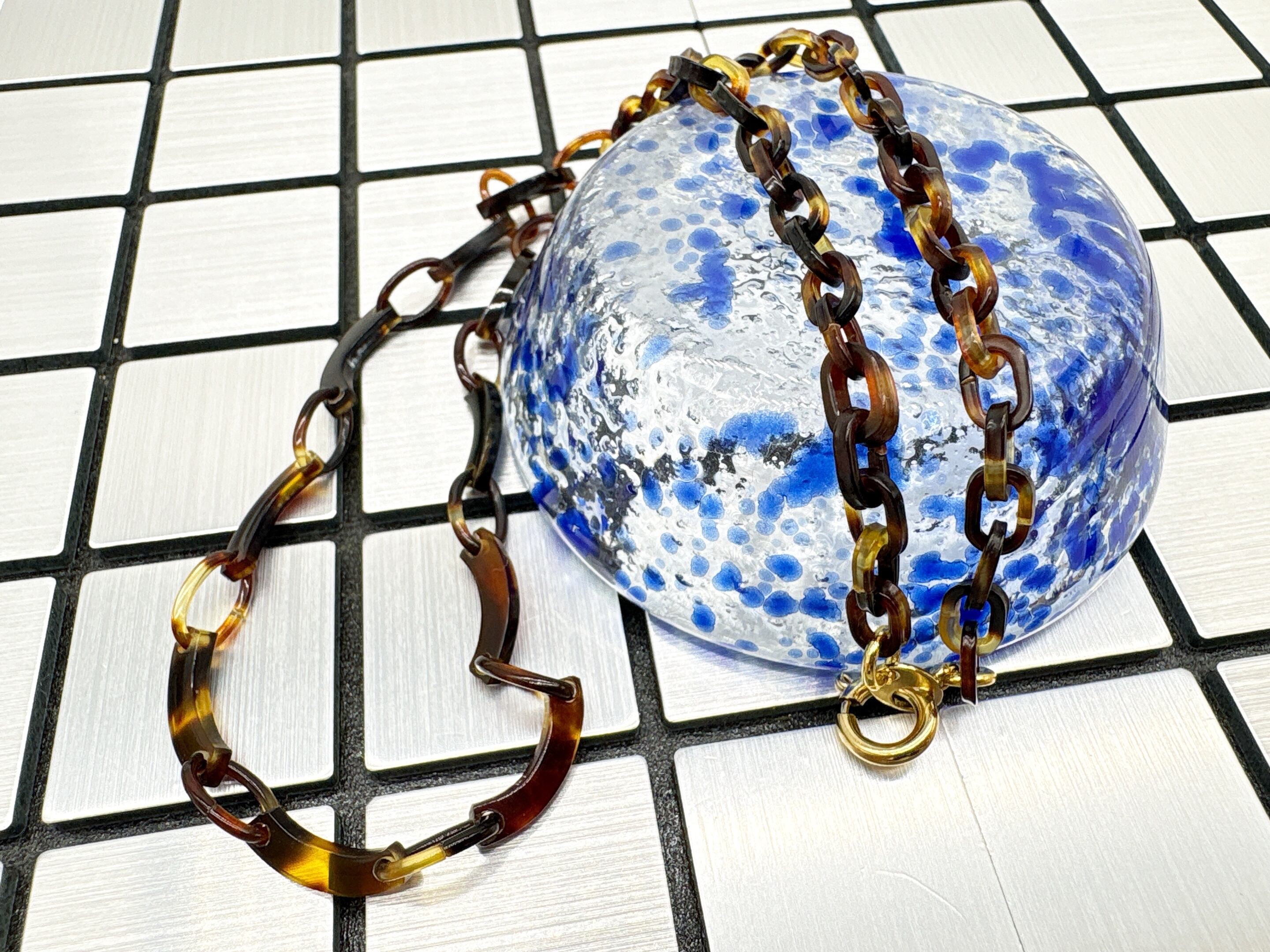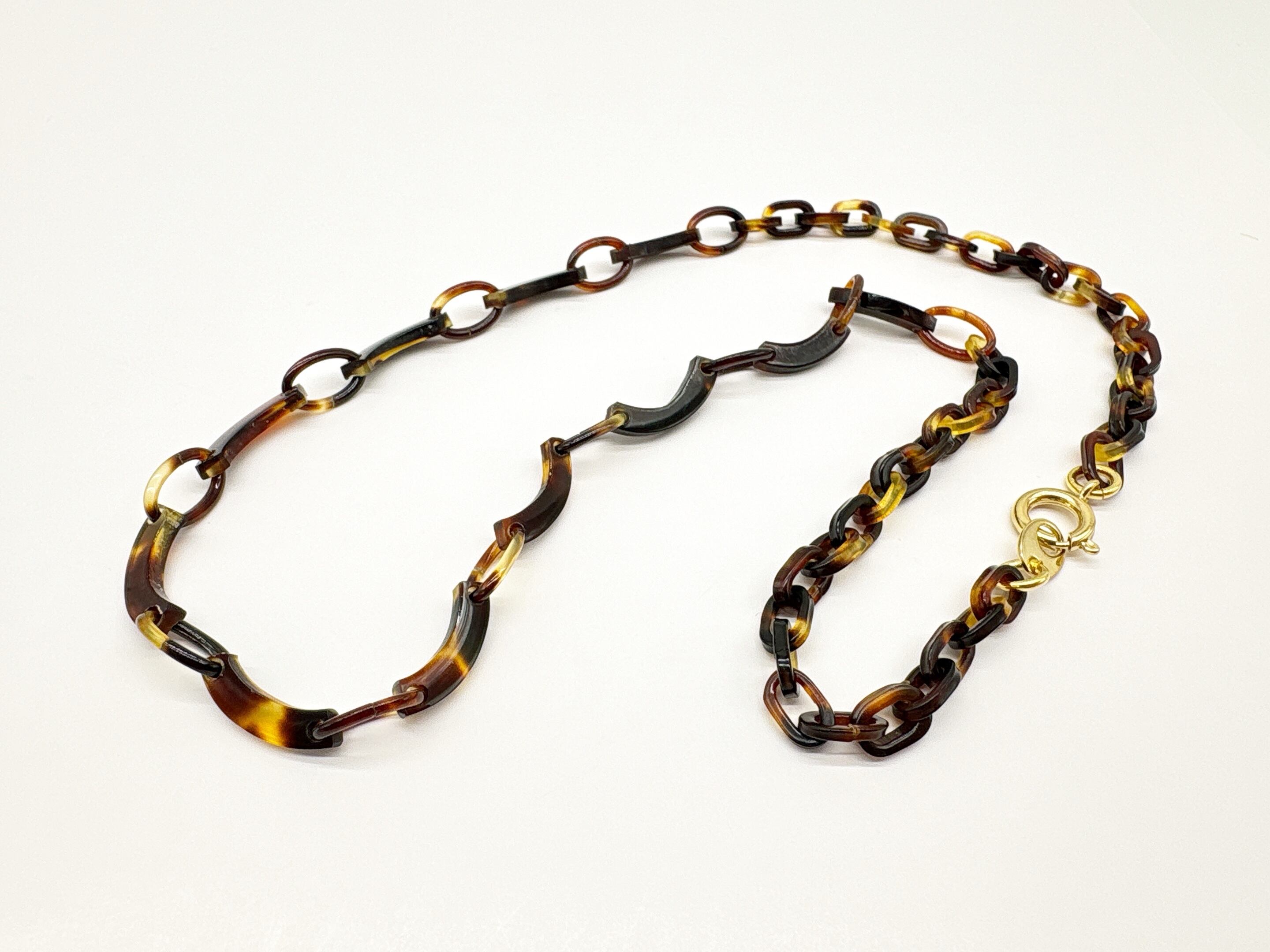 ●サイズ 全長約47.1cm ●説明 本べっ甲 バラフ(背甲)使用 留め具 金メッキカギセット式使用 本べっ甲の魅力を活かしつつ、軽やかなデザインにまとめ上げたネックレスです。全体は、大小の輪を組み合わせたチェーンパーツを基調とし、その間にゆるやかなカーブを描く特徴的なパーツをリズミカルに配置しています。この曲線パーツは、ほどよい立体感と動きを生み、シンプルな構成でありながらも、表情豊かなシルエットを作り出します。表面は丁寧に磨き上げられており、肌に触れた時の滑らかさと軽やかさが魅力です。べっ甲特有の軽い素材感と優しい肌当たりにより、長時間の着用でも負担が少なく、日常使いにも取り入れやすい一本となっています。首元に沿って自然に流れるようなラインは、カジュアルな装いはもちろん、落ち着いたコーディネートにも馴染み、幅広いシーンで活躍するスタッフ一押しの商品!形の美しさと工芸的な質感が調和した、長く愛用できる上質なネックレスです。商品はこちらの梱包にて大切に発送致します。大切な方への贈り物としても喜ばれる逸品。天然素材の為、色目やサイズ感は多少異なる場合がございます。※べっ甲及び琥珀等の天然素材はすべて本物です。通常希望価格¥22,000