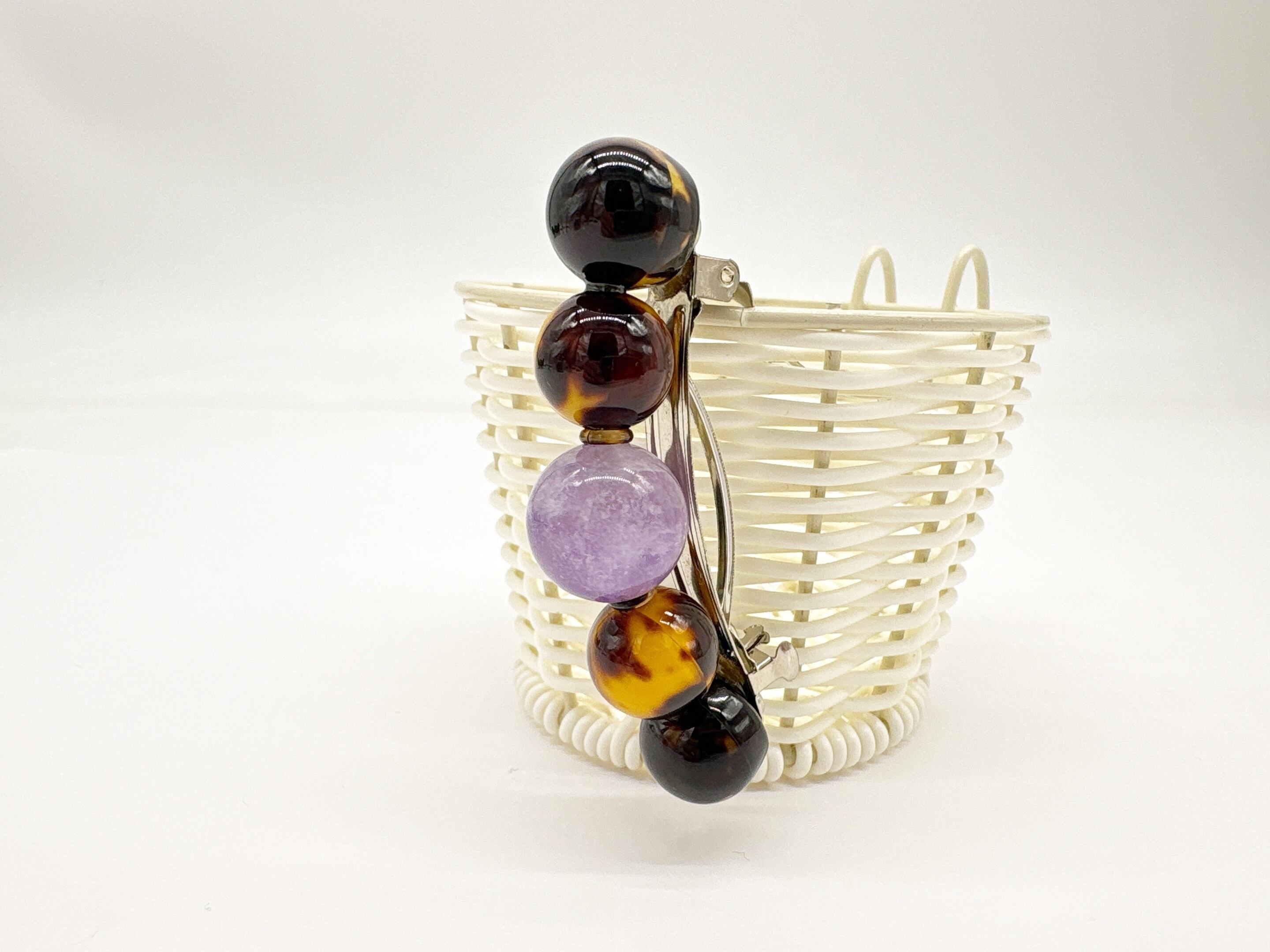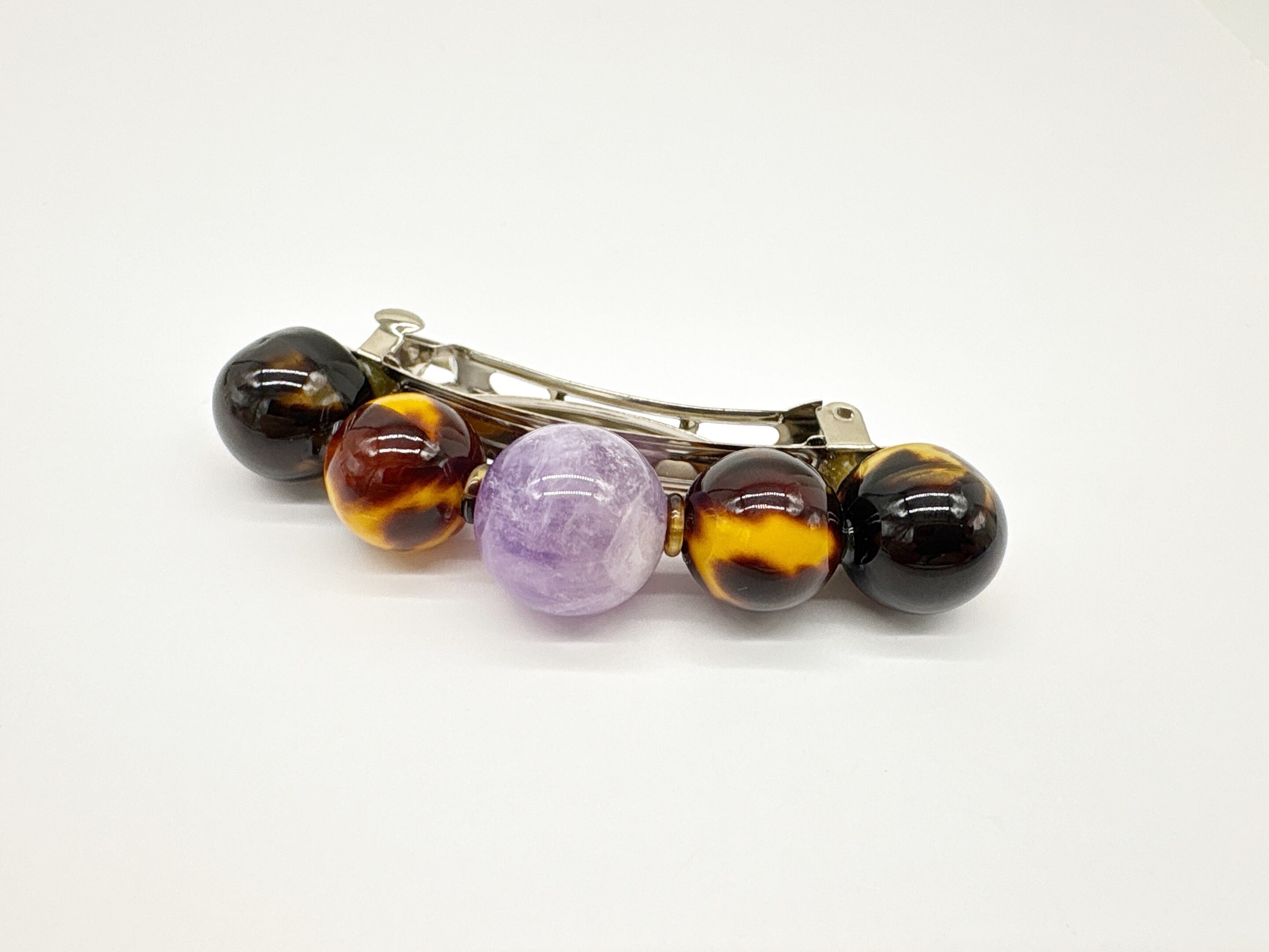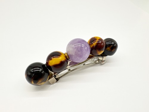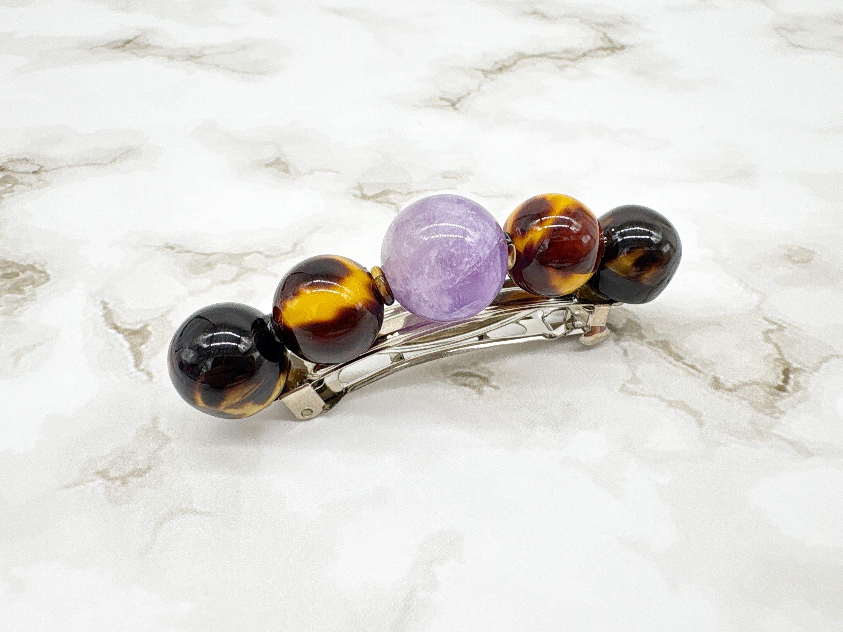 ●サイズ タテ約1.6cm×ヨコ約7.2cm ●説明 本べっ甲 バラフ(背甲)使用 アメシスト使用 本べっ甲とアメシストによる上質な髪留めです。丁寧に磨き上げられたべっ甲パーツは、ふくらまし加工を施し、連なる球体のフォルムが髪に置いたときの安定感と存在感を生み出します。べっ甲特有のなめらかな質感は、光の当たり方によってわずかに表情を変え、自然素材ならではの奥行きを感じさせます。中央のアメシストは、柔らかな印象を放ち、全体のデザインを引き締めるアクセントとなっています。天然石の穏やかな透明感と、べっ甲の落ち着きある質感が調和し、立体的なリズムを与えています。こちらの商品はハーフアップやまとめ髪にも使いやすく、シンプルなアレンジに自然な品を添えてくれます。日常使いはもちろん、和装やフォーマルシーンにも馴染む、落ち着きの中に個性が光るデザインです。本べっ甲とアメシストの組み合わせは、素材そのものの美しさを引き立てながら、長く使うほど味わいが増す特性を持っています。ひとつひとつの球にわずかな個体差があり、それが一点物ならではの魅力を生み出す、特別な髪留めです。金具はバレッタタイプを使用していますので着けやすくなっております。べっ甲はとても軽いためズレ落ちがしにくく疲れません。ふとした仕草まで、上品に映る一本。商品はこちらの梱包にて大切に発送致します。天然素材の為、色目やサイズ感は多少異なる場合がございます。※べっ甲及び琥珀等の天然素材はすべて本物です。通常希望小売価格¥24,000