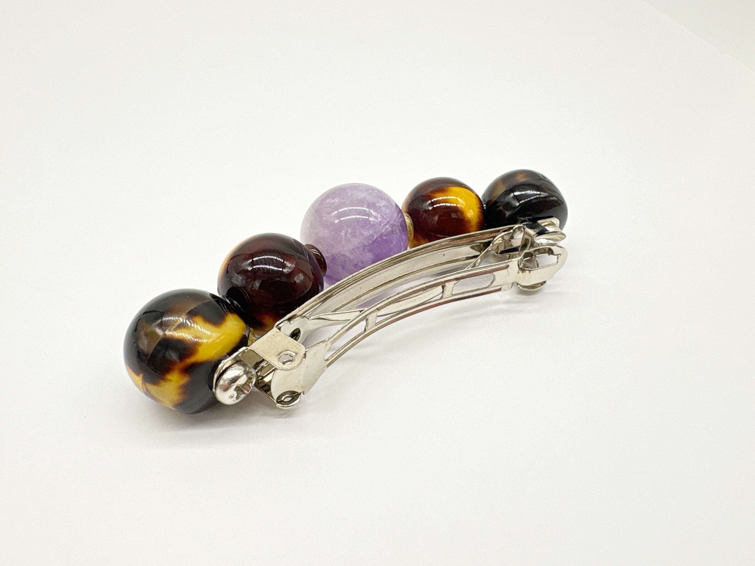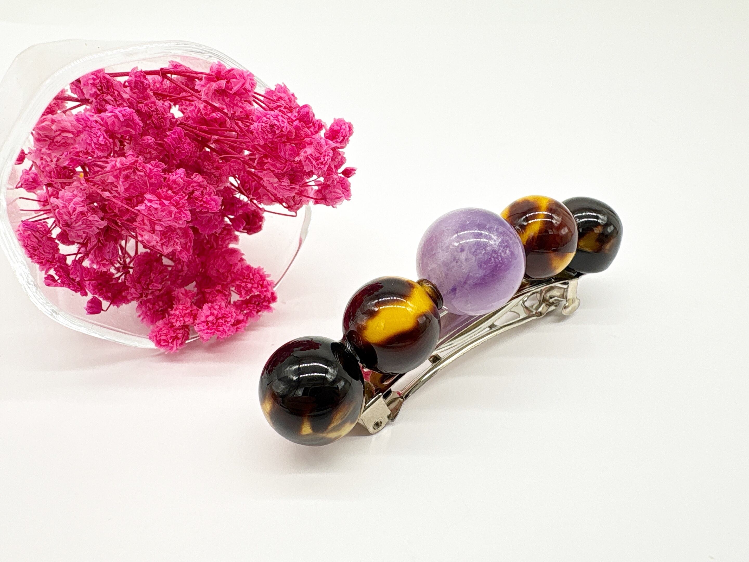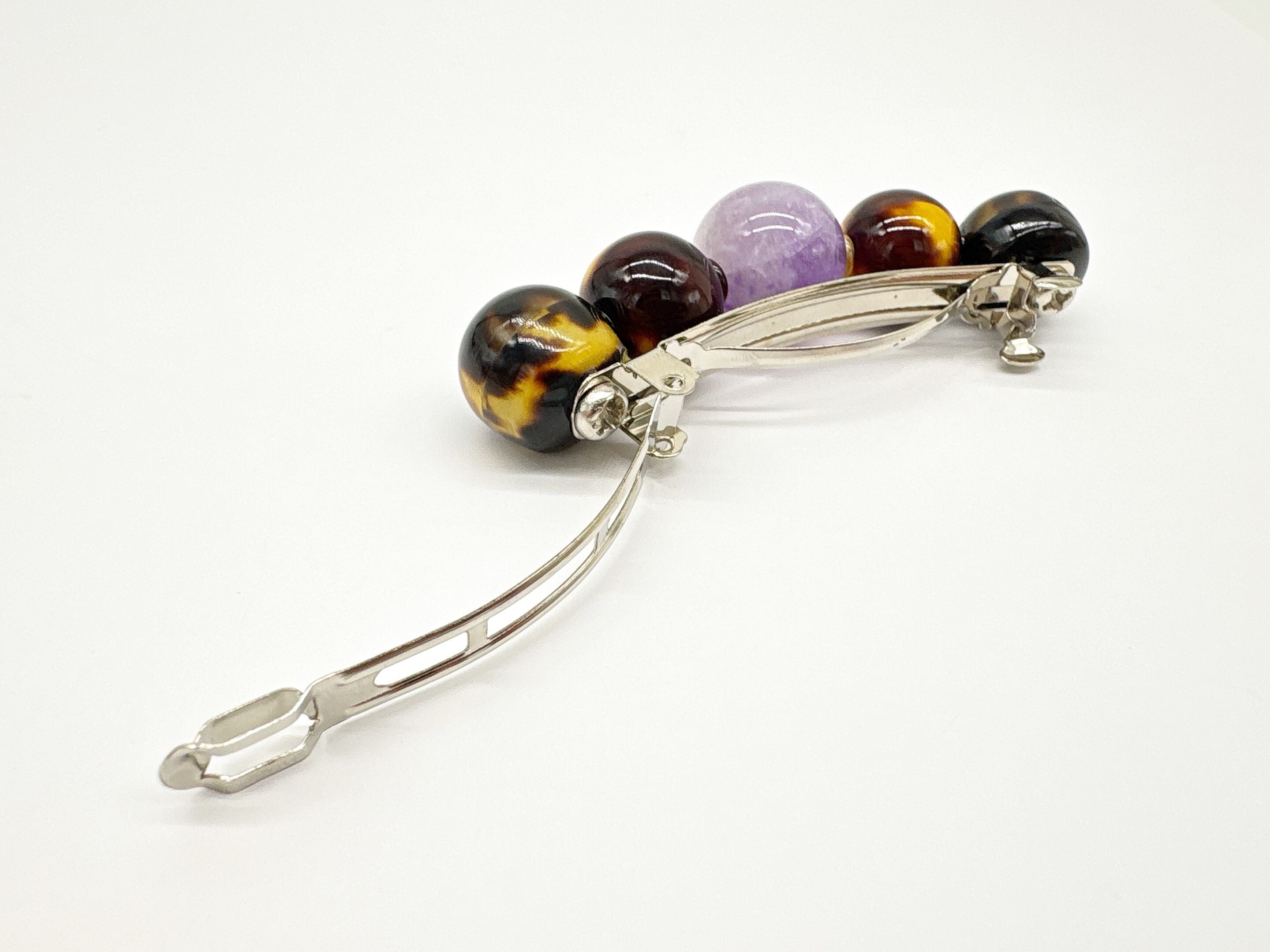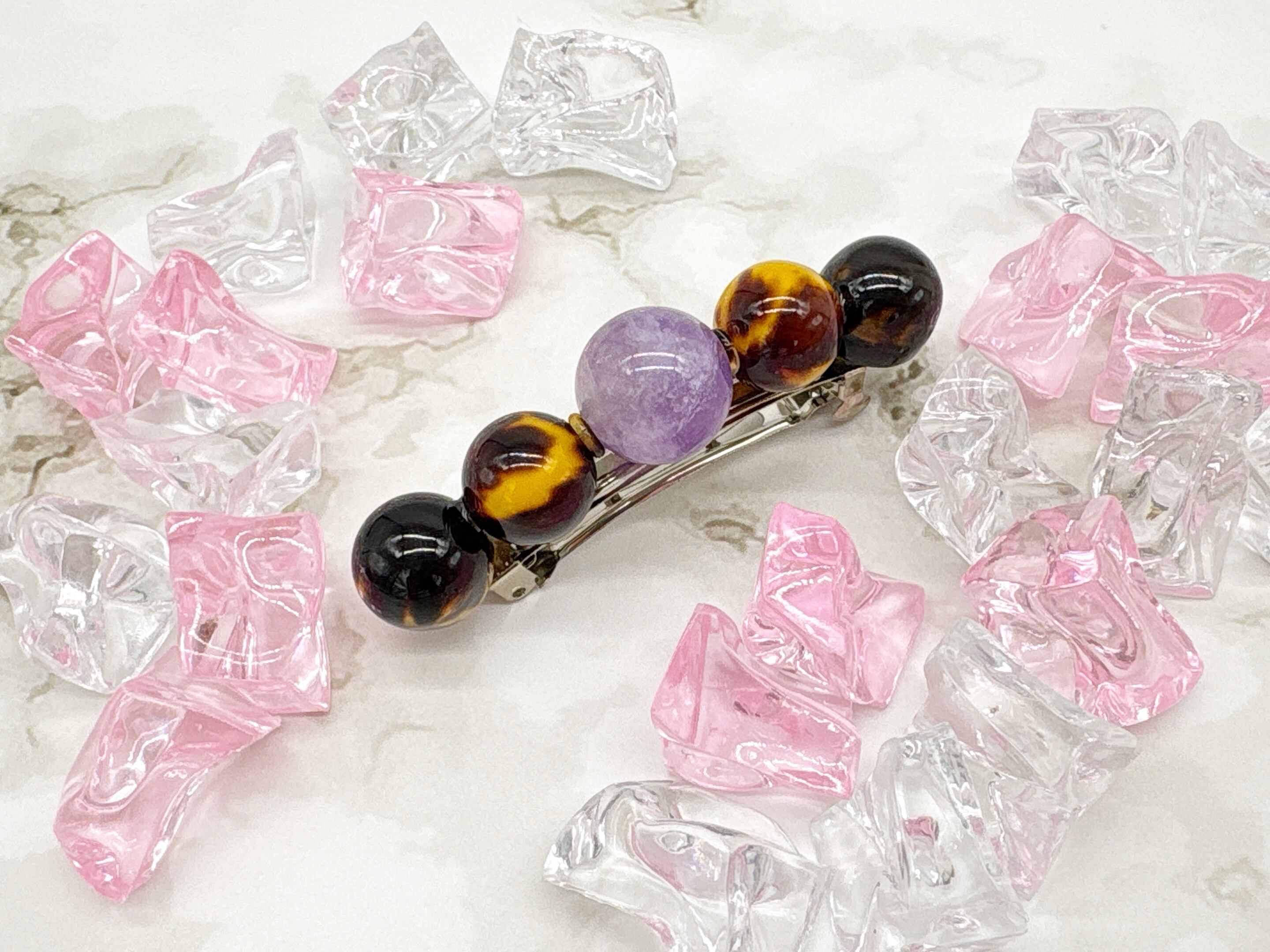 ●サイズ タテ約1.6cm×ヨコ約7.2cm ●説明 本べっ甲 バラフ(背甲)使用 アメシスト使用 本べっ甲とアメシストによる上質な髪留めです。丁寧に磨き上げられたべっ甲パーツは、ふくらまし加工を施し、連なる球体のフォルムが髪に置いたときの安定感と存在感を生み出します。べっ甲特有のなめらかな質感は、光の当たり方によってわずかに表情を変え、自然素材ならではの奥行きを感じさせます。中央のアメシストは、柔らかな印象を放ち、全体のデザインを引き締めるアクセントとなっています。天然石の穏やかな透明感と、べっ甲の落ち着きある質感が調和し、立体的なリズムを与えています。こちらの商品はハーフアップやまとめ髪にも使いやすく、シンプルなアレンジに自然な品を添えてくれます。日常使いはもちろん、和装やフォーマルシーンにも馴染む、落ち着きの中に個性が光るデザインです。本べっ甲とアメシストの組み合わせは、素材そのものの美しさを引き立てながら、長く使うほど味わいが増す特性を持っています。ひとつひとつの球にわずかな個体差があり、それが一点物ならではの魅力を生み出す、特別な髪留めです。金具はバレッタタイプを使用していますので着けやすくなっております。べっ甲はとても軽いためズレ落ちがしにくく疲れません。ふとした仕草まで、上品に映る一本。商品はこちらの梱包にて大切に発送致します。天然素材の為、色目やサイズ感は多少異なる場合がございます。※べっ甲及び琥珀等の天然素材はすべて本物です。通常希望小売価格¥24,000