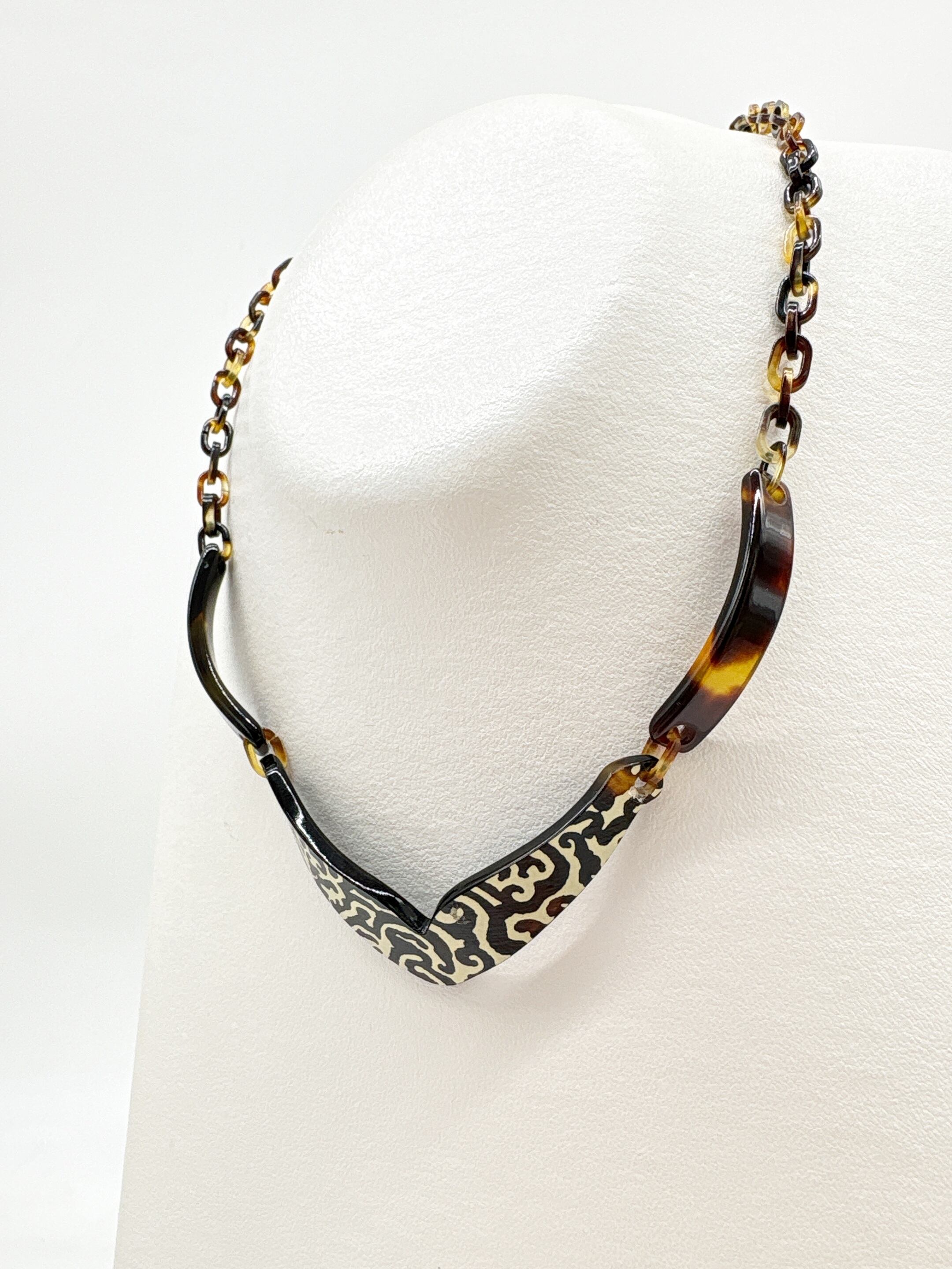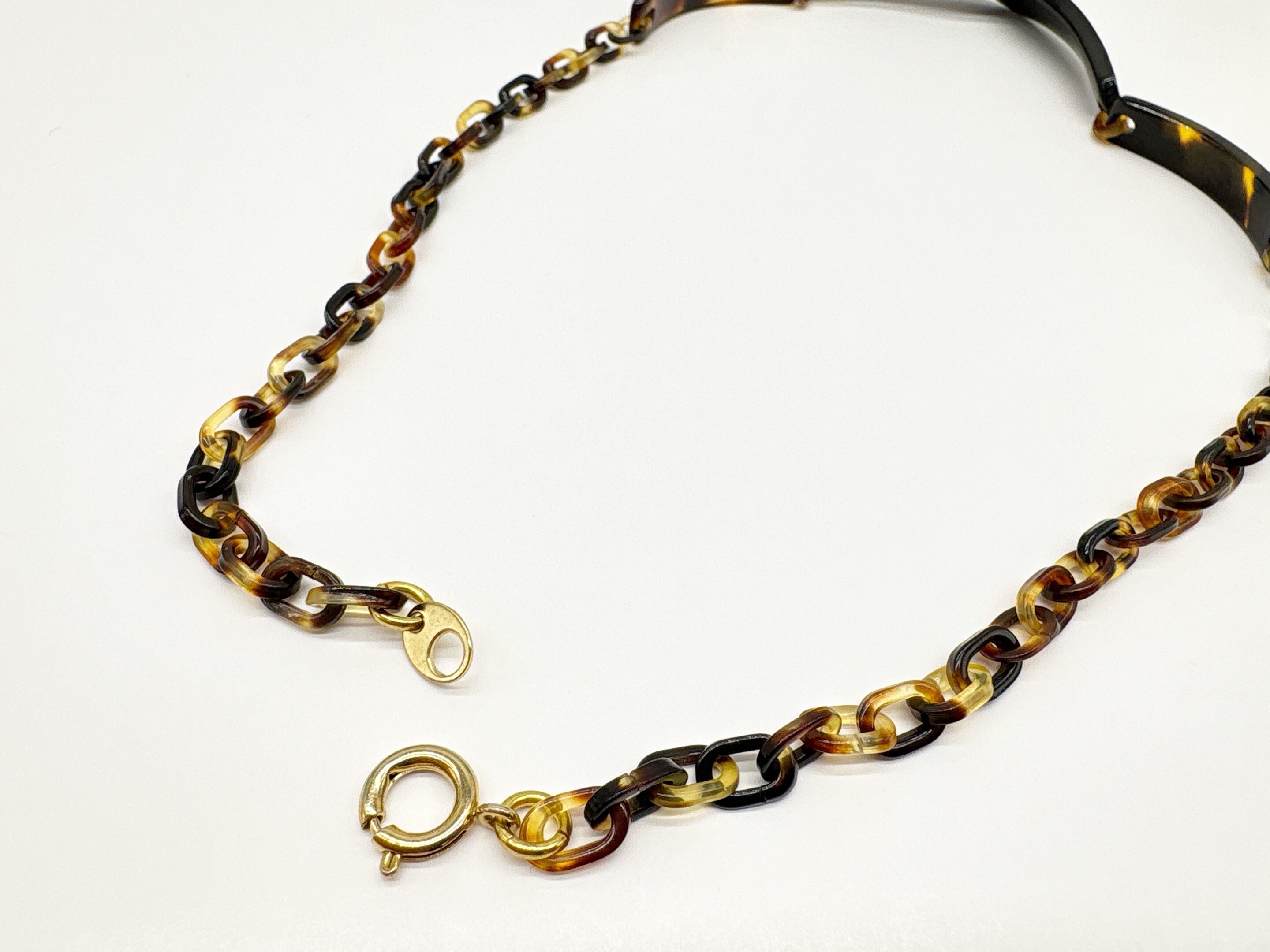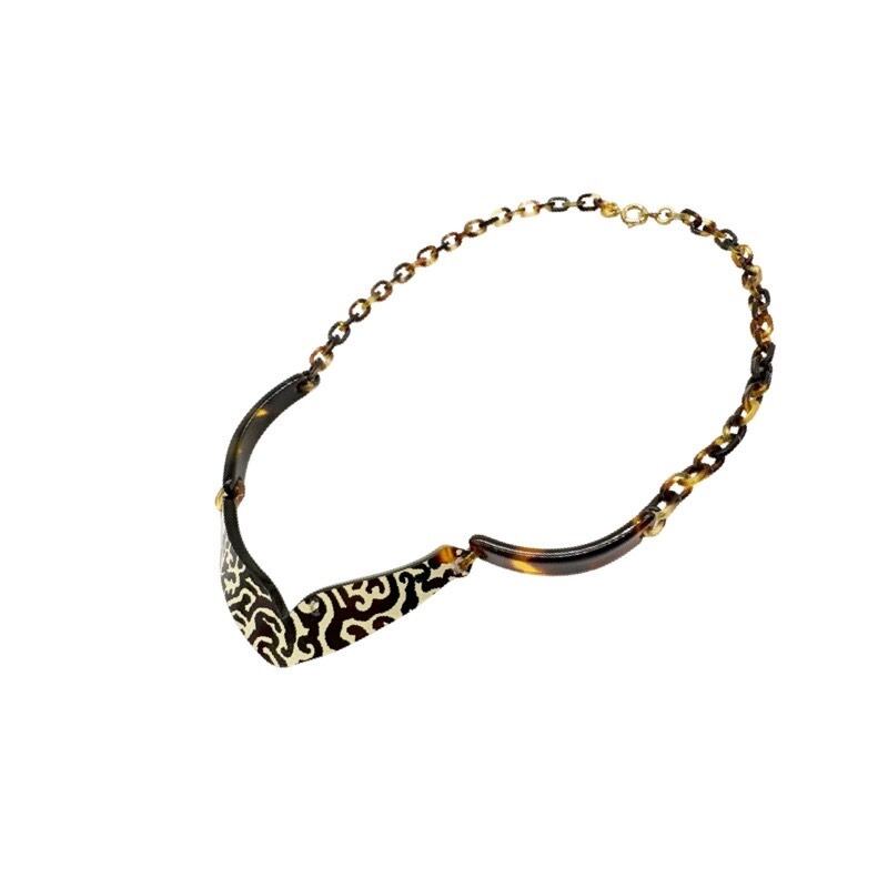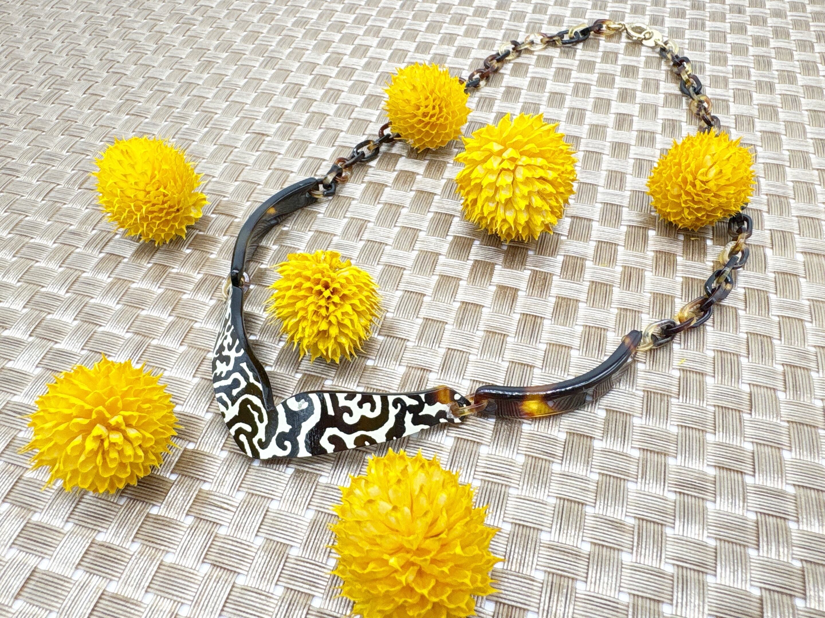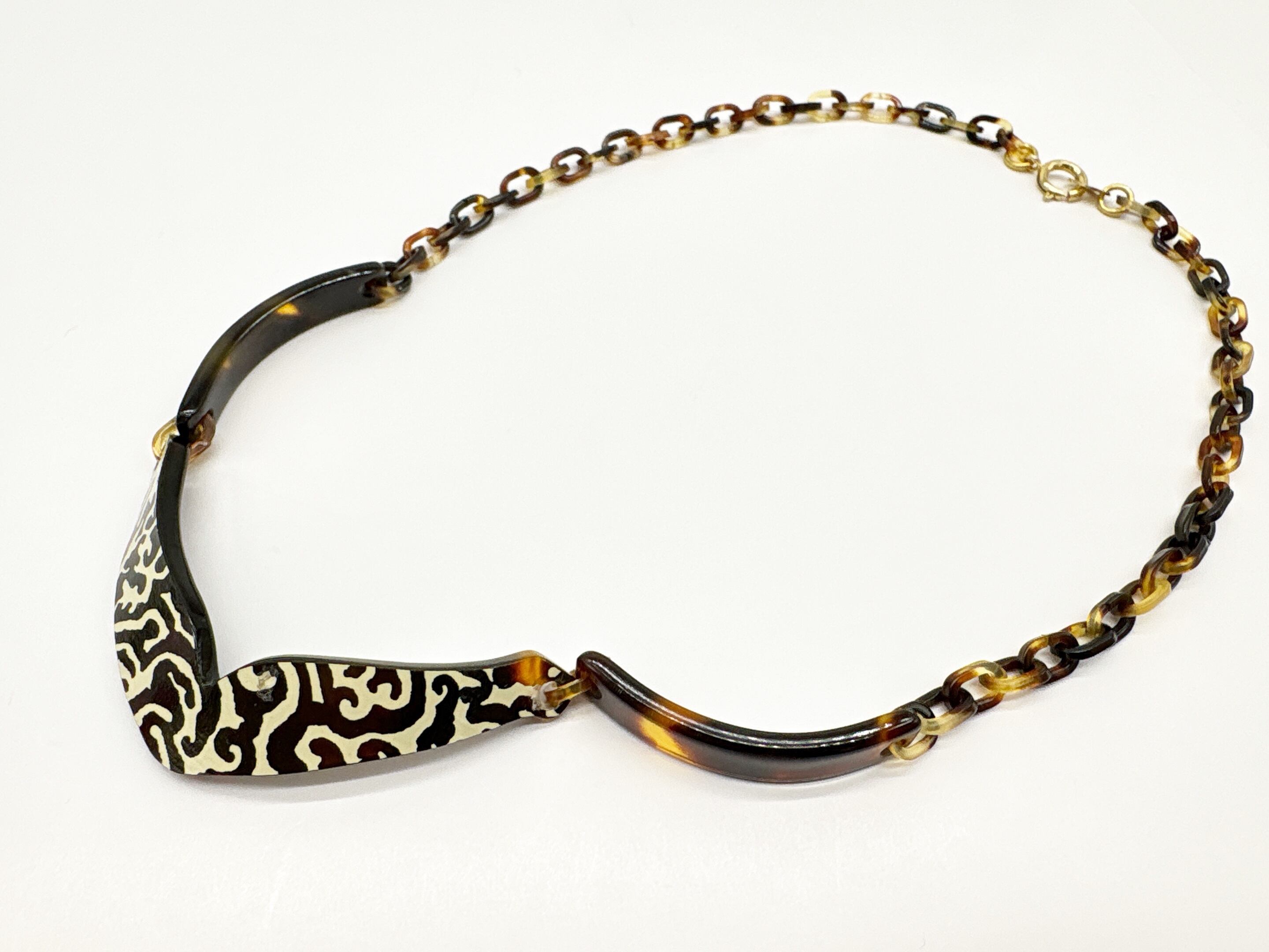 ●サイズ 全長約44.3cm ●説明 本べっ甲 バラフ(背甲)使用 水目柄(漆塗り)使用 留め具 金メッキカギセット式使用 希少な本べっ甲のバラフと本水目を組み合わせ、素材の持つ立体感を最大限に引き出したネックレスです。異なる表情をもつべっ甲バラフと本水目柄を巧みに組み合わせることで、単調にならず、奥行きのあるデザインに仕上げました。首元に沿うように緩やかなカーブを描く左右のパーツは、程よいボリュームを持ちながらも大ぶりになりすぎず、しなやかな流れを生み出します。中央のトップは、面の取り方や角度にこだわり、動きに合わせて自然な陰影が生まれるデザインに。手仕事ならではの磨きがかけられているため、肌に当たる感触も滑らかで、着用時の心地よさにも配慮されています。チェーン部分には軽量なべっ甲パーツを連ね、全体の印象を軽やかにまとめつつ、素材の上品さを引き立てる構成に。べっ甲のサイズを細かく調整することで、トップとのバランスが美しく整えられ、横顔や後ろ姿からも洗練された印象を与えてくれます。一つ身につけるだけで装いの重心が整い、シンプルな服装にも自然に奥行きが生まれるデザイン性の高い一本です。商品はこちらの梱包にて大切に発送致します。装いにしなやかな存在感を添える、特別な一本となるでしょう。天然素材の為、色目やサイズ感は多少異なる場合がございます。※べっ甲及び琥珀等の天然素材はすべて本物です。通常希望価格¥38,000