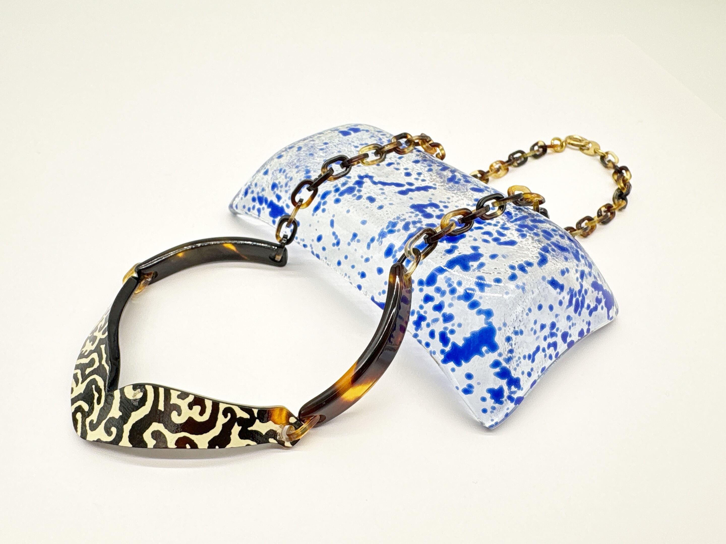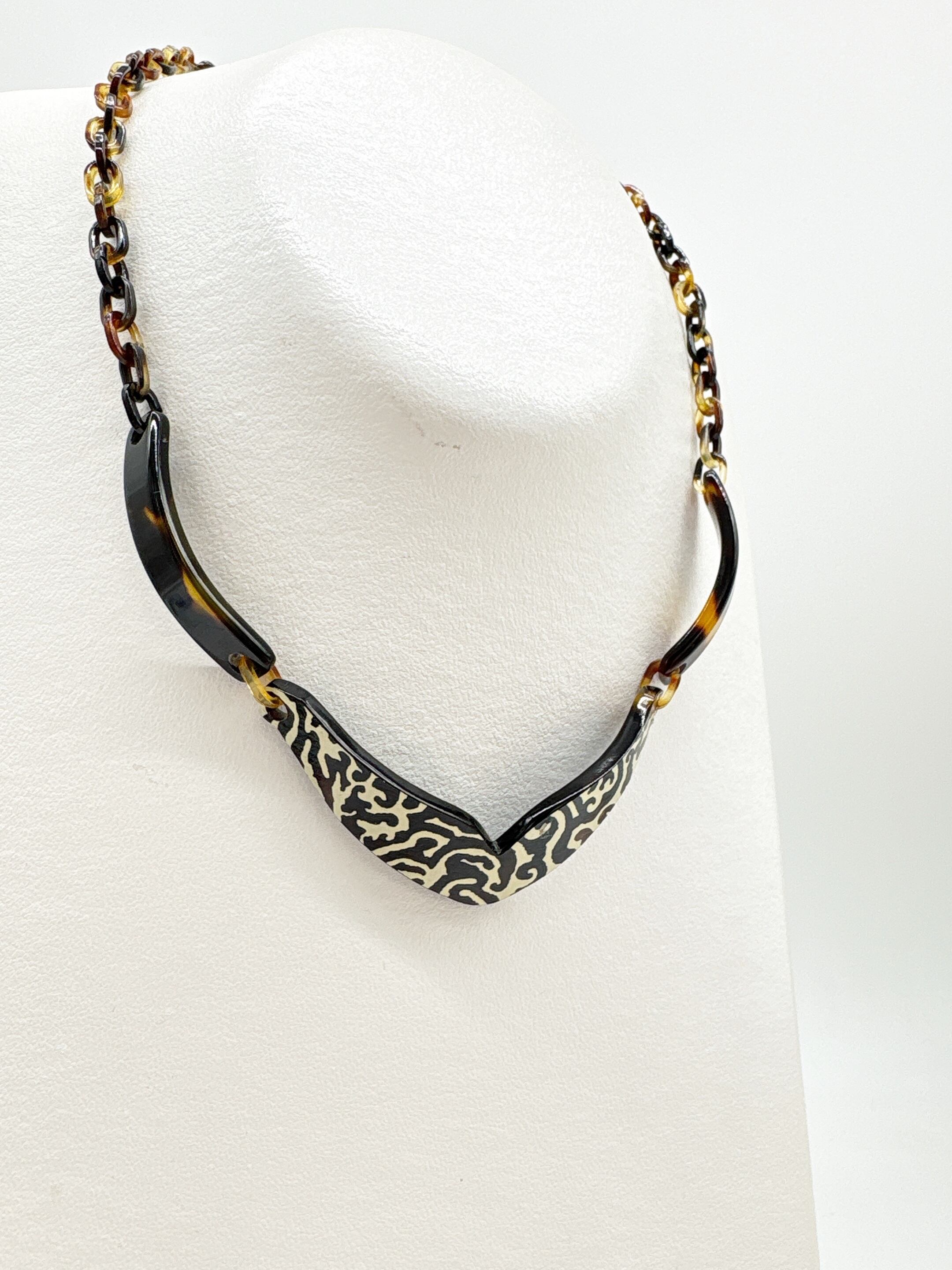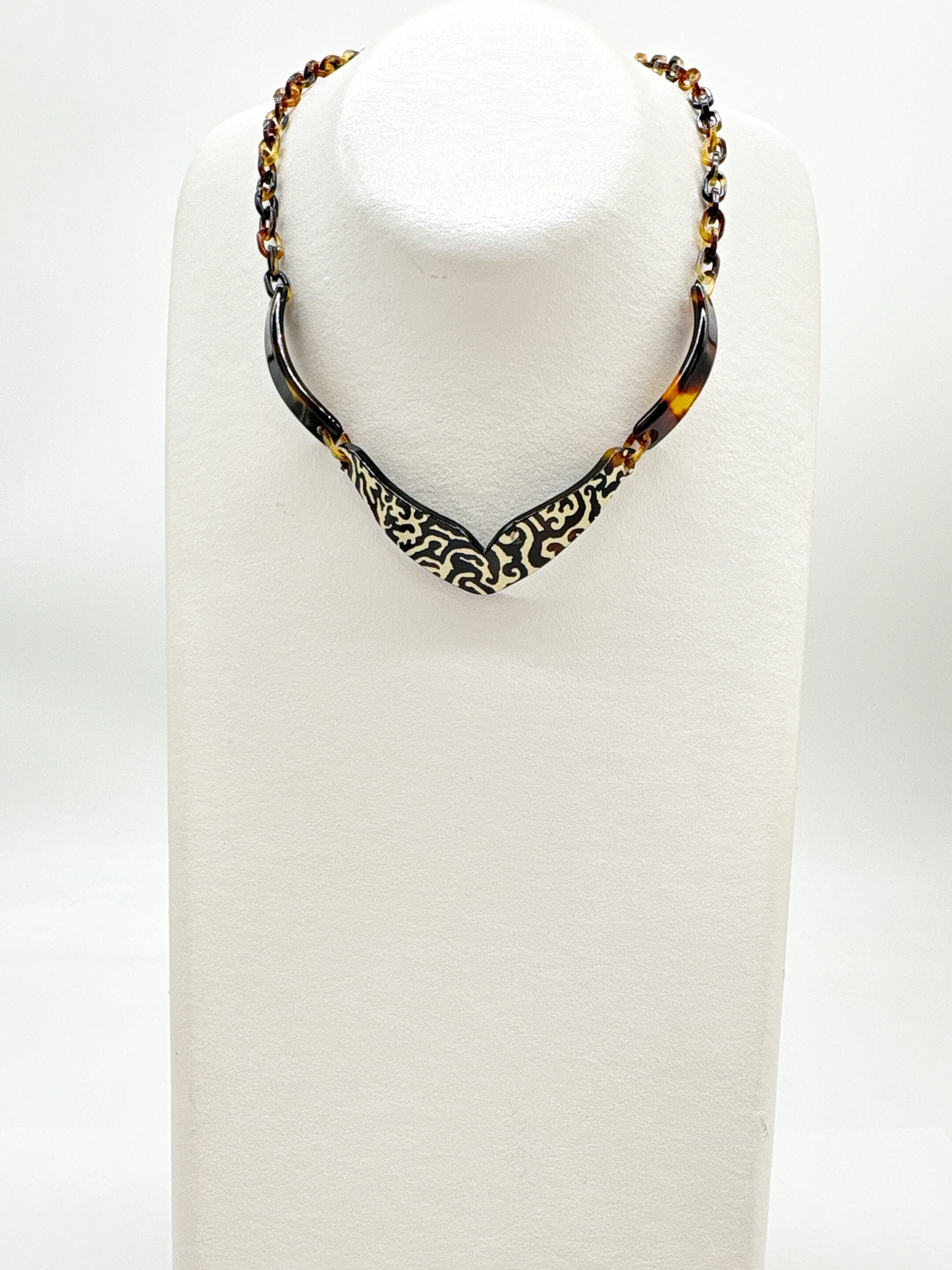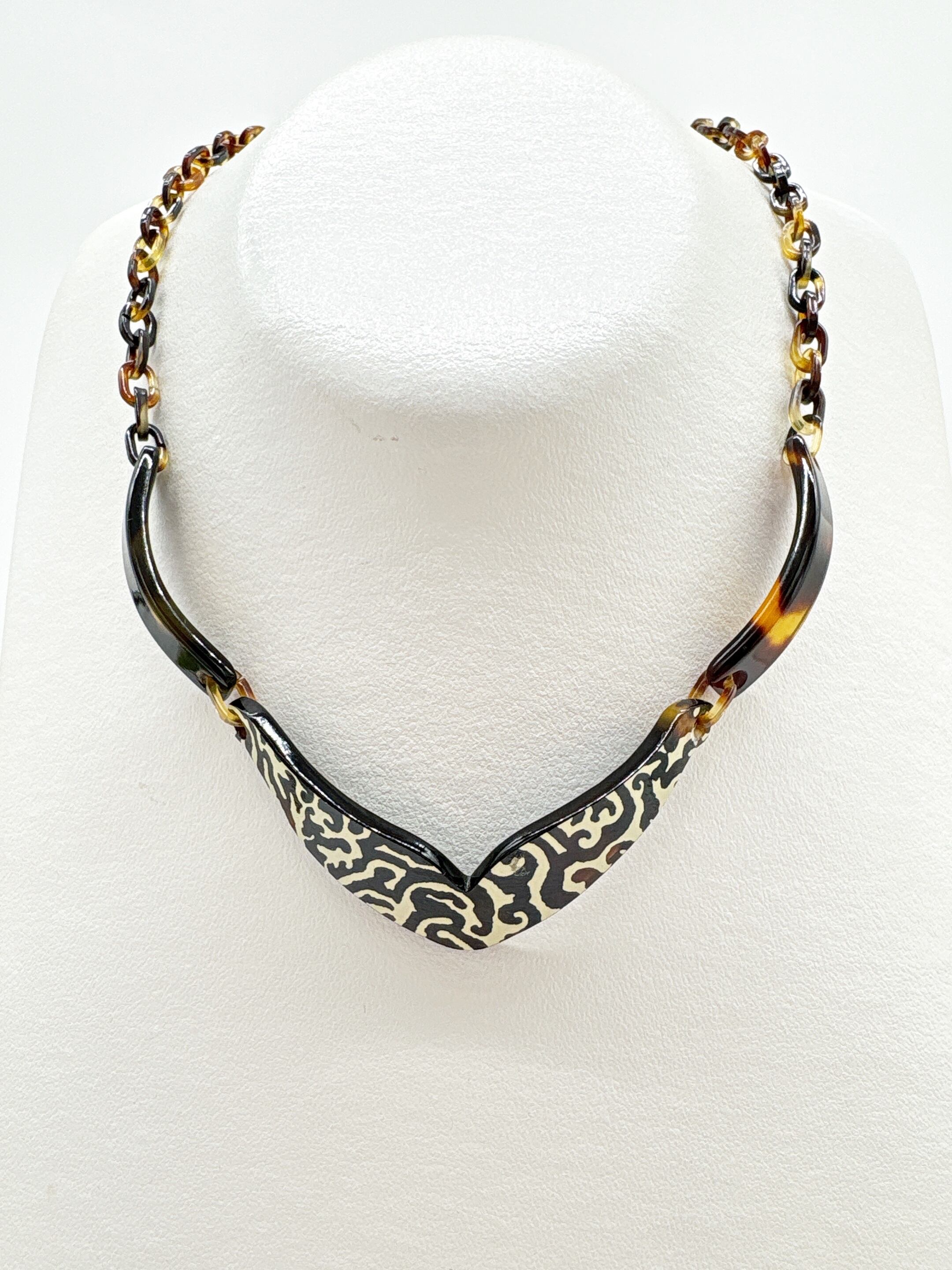 ●サイズ 全長約44.3cm ●説明 本べっ甲 バラフ(背甲)使用 水目柄(漆塗り)使用 留め具 金メッキカギセット式使用 希少な本べっ甲のバラフと本水目を組み合わせ、素材の持つ立体感を最大限に引き出したネックレスです。異なる表情をもつべっ甲バラフと本水目柄を巧みに組み合わせることで、単調にならず、奥行きのあるデザインに仕上げました。首元に沿うように緩やかなカーブを描く左右のパーツは、程よいボリュームを持ちながらも大ぶりになりすぎず、しなやかな流れを生み出します。中央のトップは、面の取り方や角度にこだわり、動きに合わせて自然な陰影が生まれるデザインに。手仕事ならではの磨きがかけられているため、肌に当たる感触も滑らかで、着用時の心地よさにも配慮されています。チェーン部分には軽量なべっ甲パーツを連ね、全体の印象を軽やかにまとめつつ、素材の上品さを引き立てる構成に。べっ甲のサイズを細かく調整することで、トップとのバランスが美しく整えられ、横顔や後ろ姿からも洗練された印象を与えてくれます。一つ身につけるだけで装いの重心が整い、シンプルな服装にも自然に奥行きが生まれるデザイン性の高い一本です。商品はこちらの梱包にて大切に発送致します。装いにしなやかな存在感を添える、特別な一本となるでしょう。天然素材の為、色目やサイズ感は多少異なる場合がございます。※べっ甲及び琥珀等の天然素材はすべて本物です。通常希望価格¥38,000