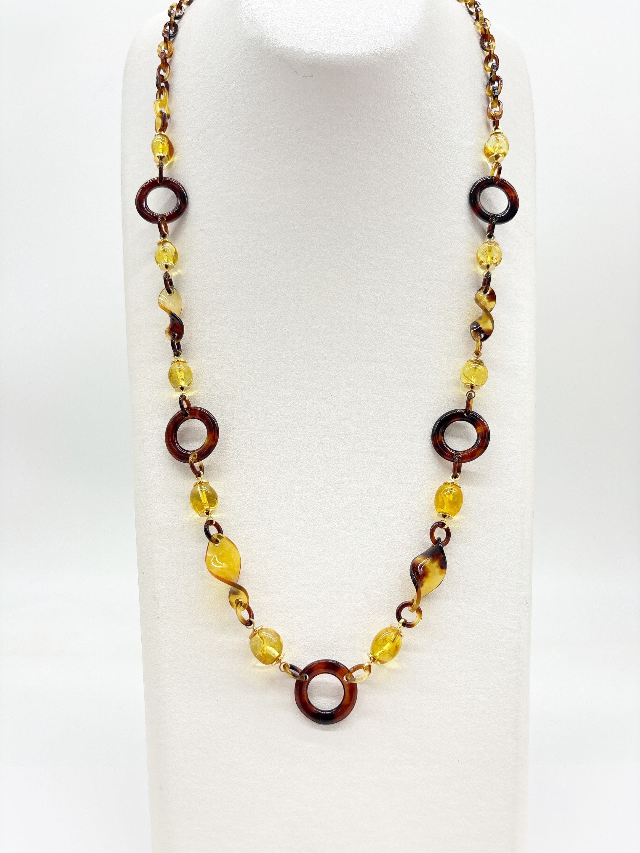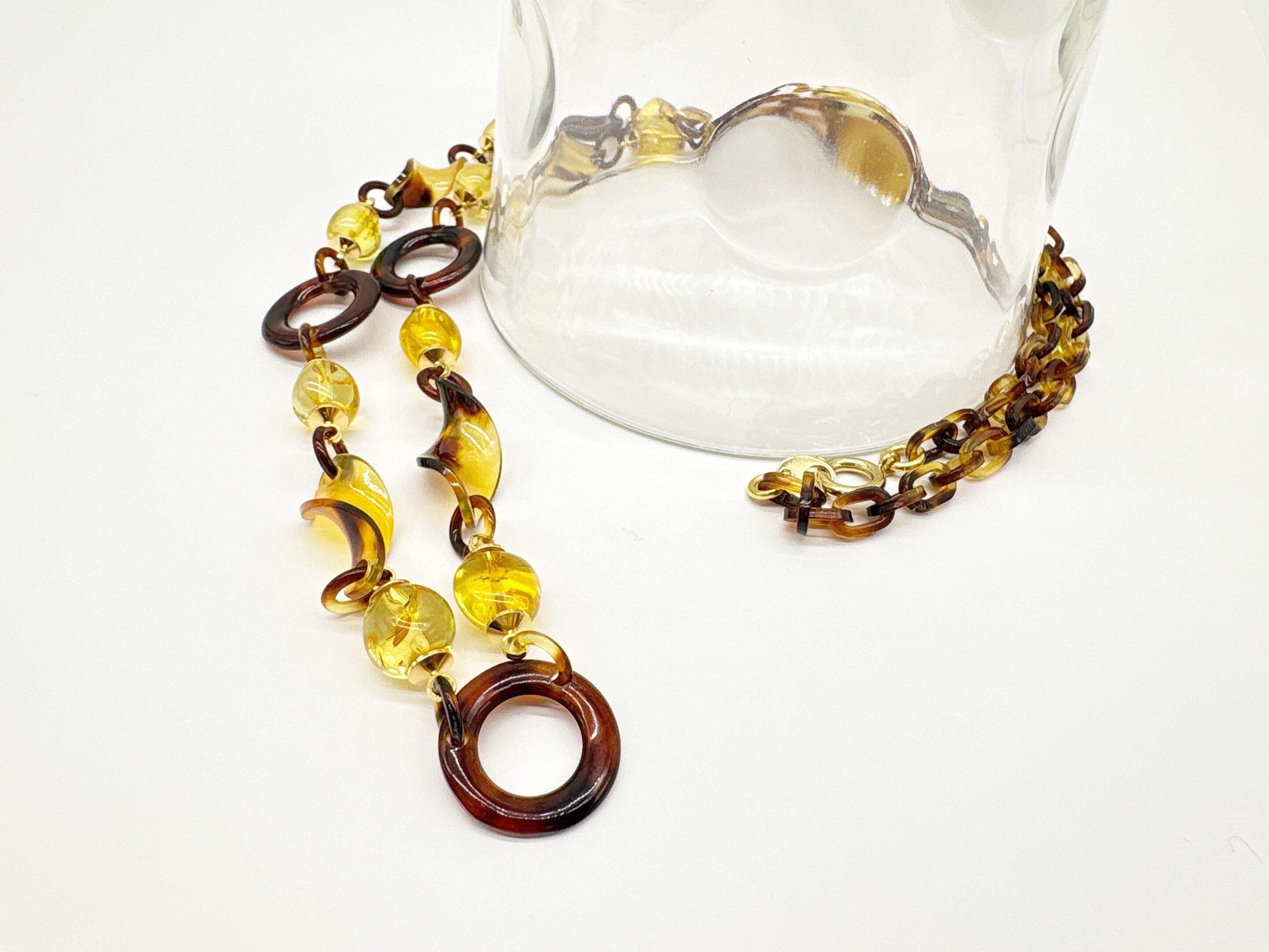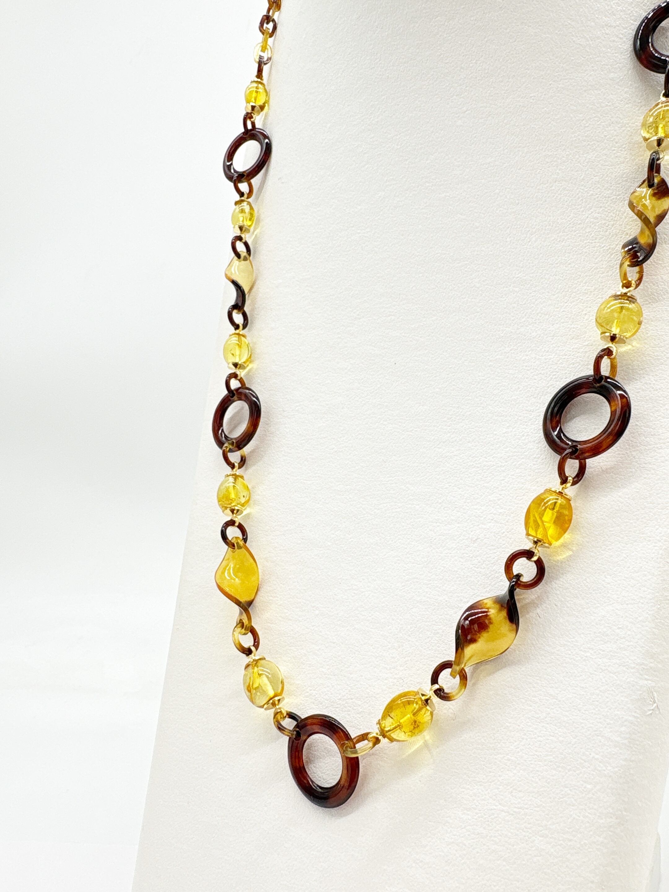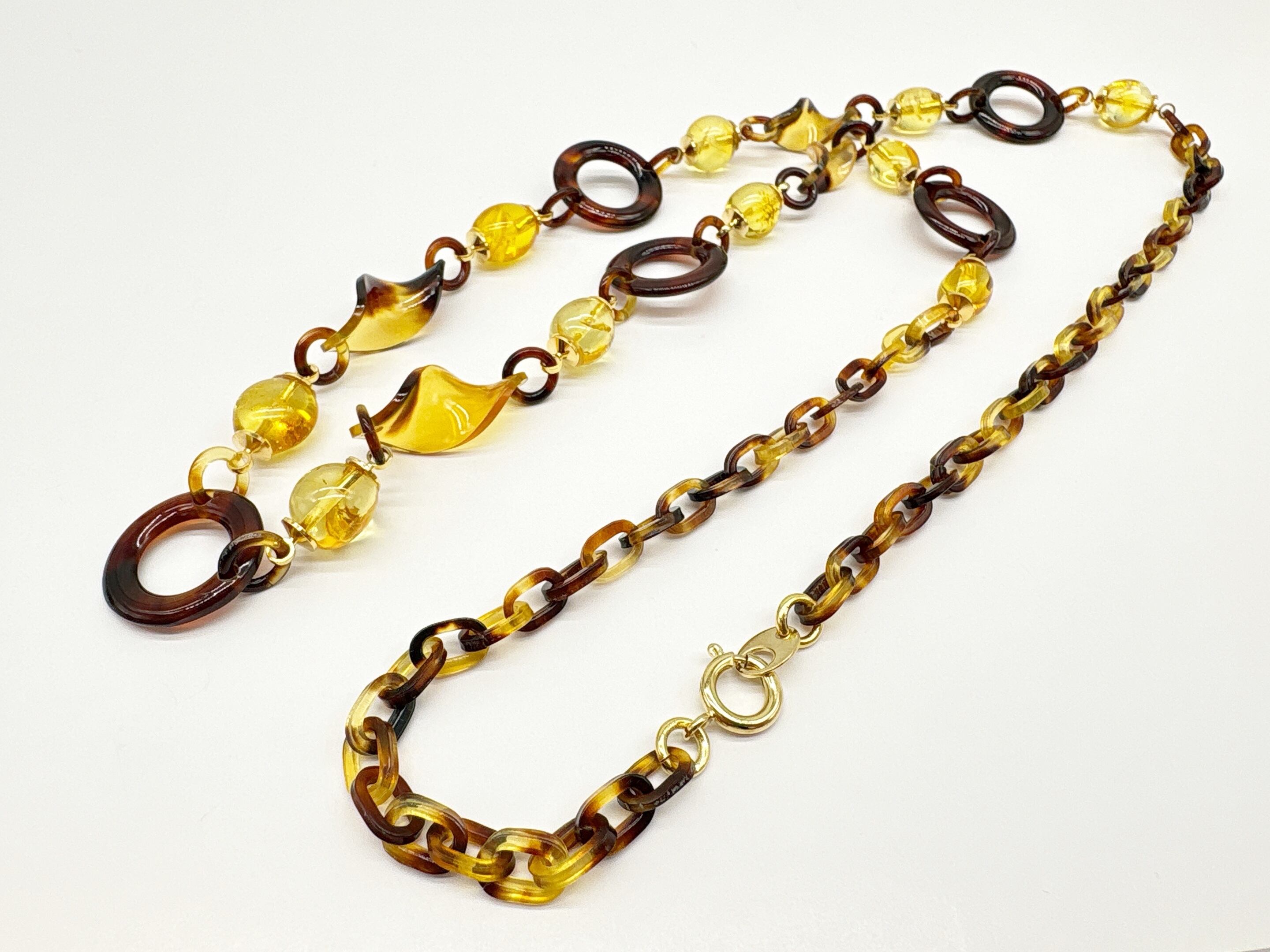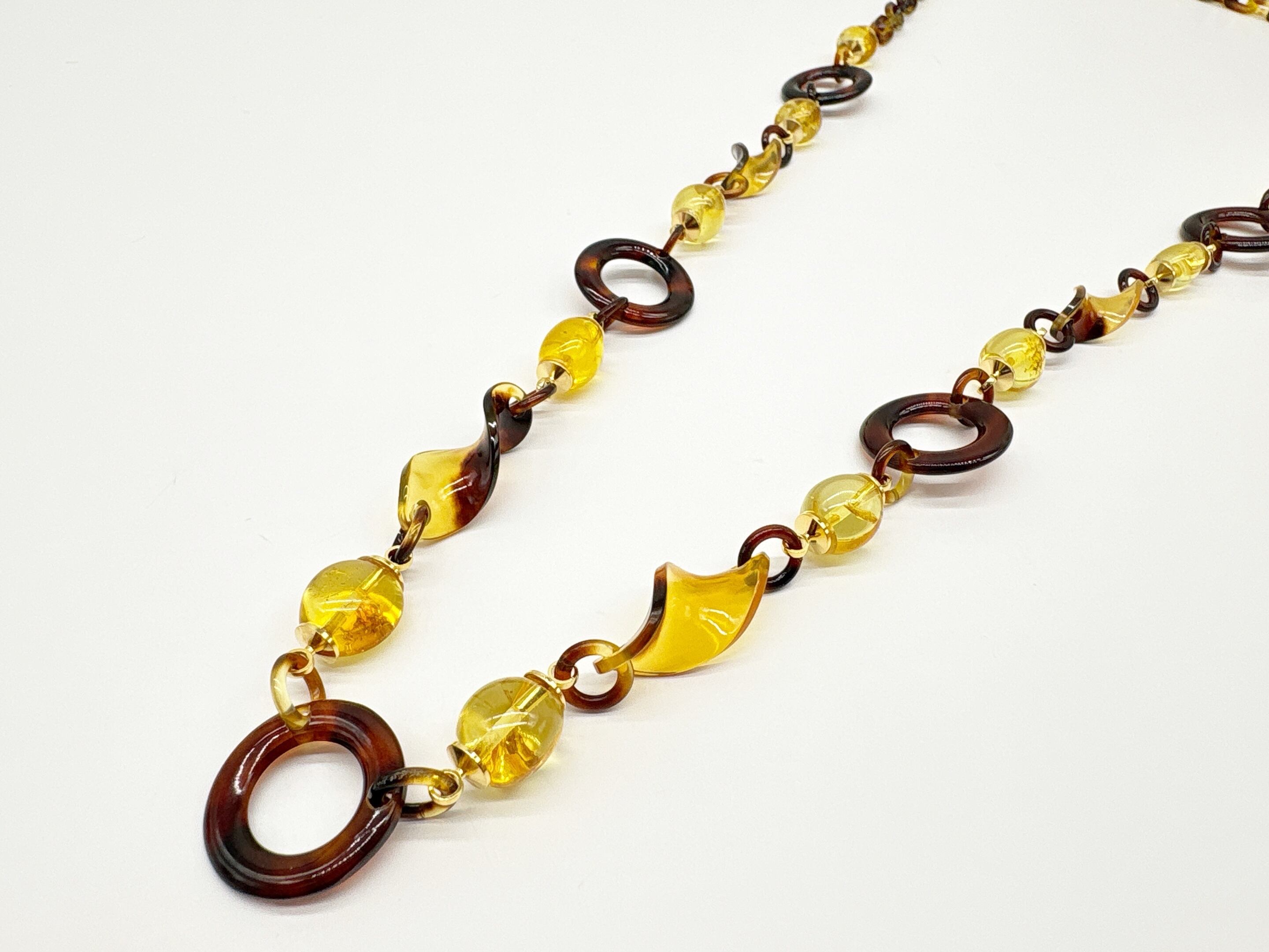 ●サイズ 全長約70.8cm ●説明 本べっ甲 バラフ(背甲)使用 本琥珀(バルティックアンバー)使用 留め具 金メッキカギセット式使用 本べっ甲と本琥珀(バルティックアンバー)を組み合わせ、自然素材の魅力を立体的なラインに落とし込んだネックレスです。べっ甲パーツは、ねじり加工を施したデザインやサークルタイプのリングなど、形状の異なるパーツをバランスよく組み合わせ、動きに合わせて穏やかな表情を見せる仕上りになっています。チェーン部分も本べっ甲で作成されており、見た目の上質さはそのままに、長時間の着用でも負担の少ない軽さと滑らかさを両立。内包物(グリッター)か入った美しい輝きを放つバルティックアンバーは、柔らかな丸みと軽やかな透明感を備え、べっ甲の滑らかな質感と調和するよう丁寧に組み合わせられています。大小さまざまな球体パーツの連なりは、光を受けて穏やかに輝き、全体のデザインに立体感と軽やかなリズムを添えています。シンプルな装いにも自然に馴染みながら、ひとつ身につけるだけで全体を明るく整えてくれる存在感を備えており、日常使いから特別なシーンまで幅広く活躍する一本です!商品はこちらの梱包にて大切に発送致します。やさしい表情が、ふとした仕草を美しく。天然素材の為、色目やサイズ感は多少異なる場合がございます。※べっ甲及び琥珀等の天然素材はすべて本物です。通常希望価格¥42,000