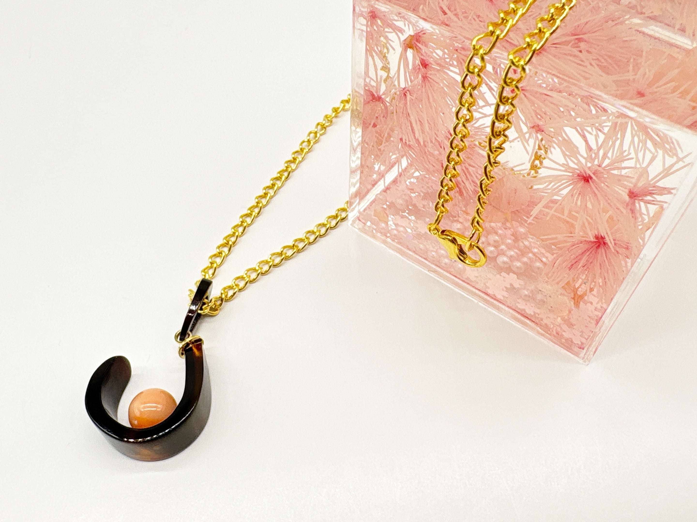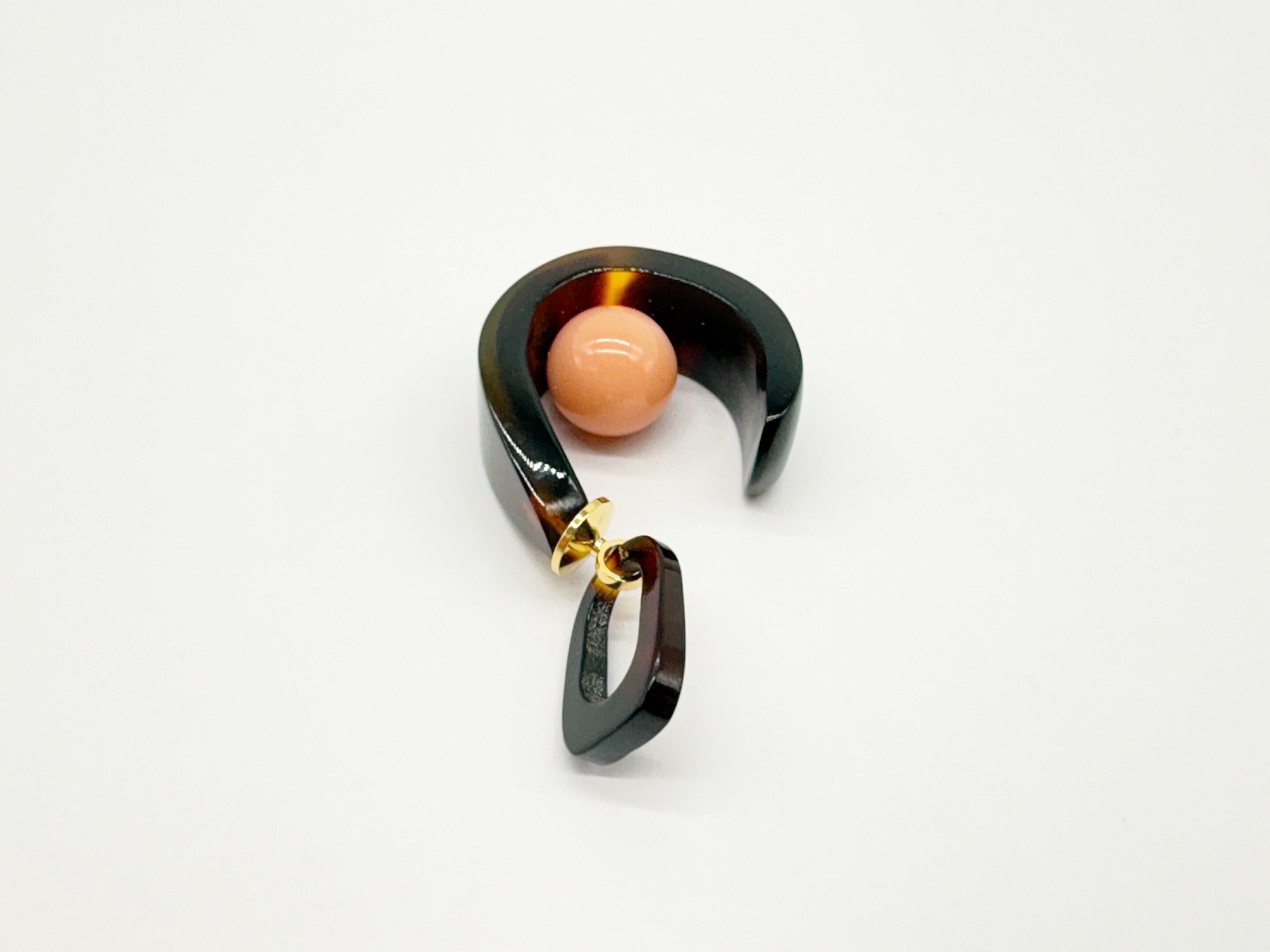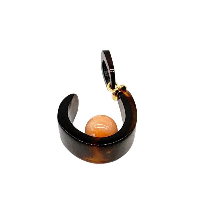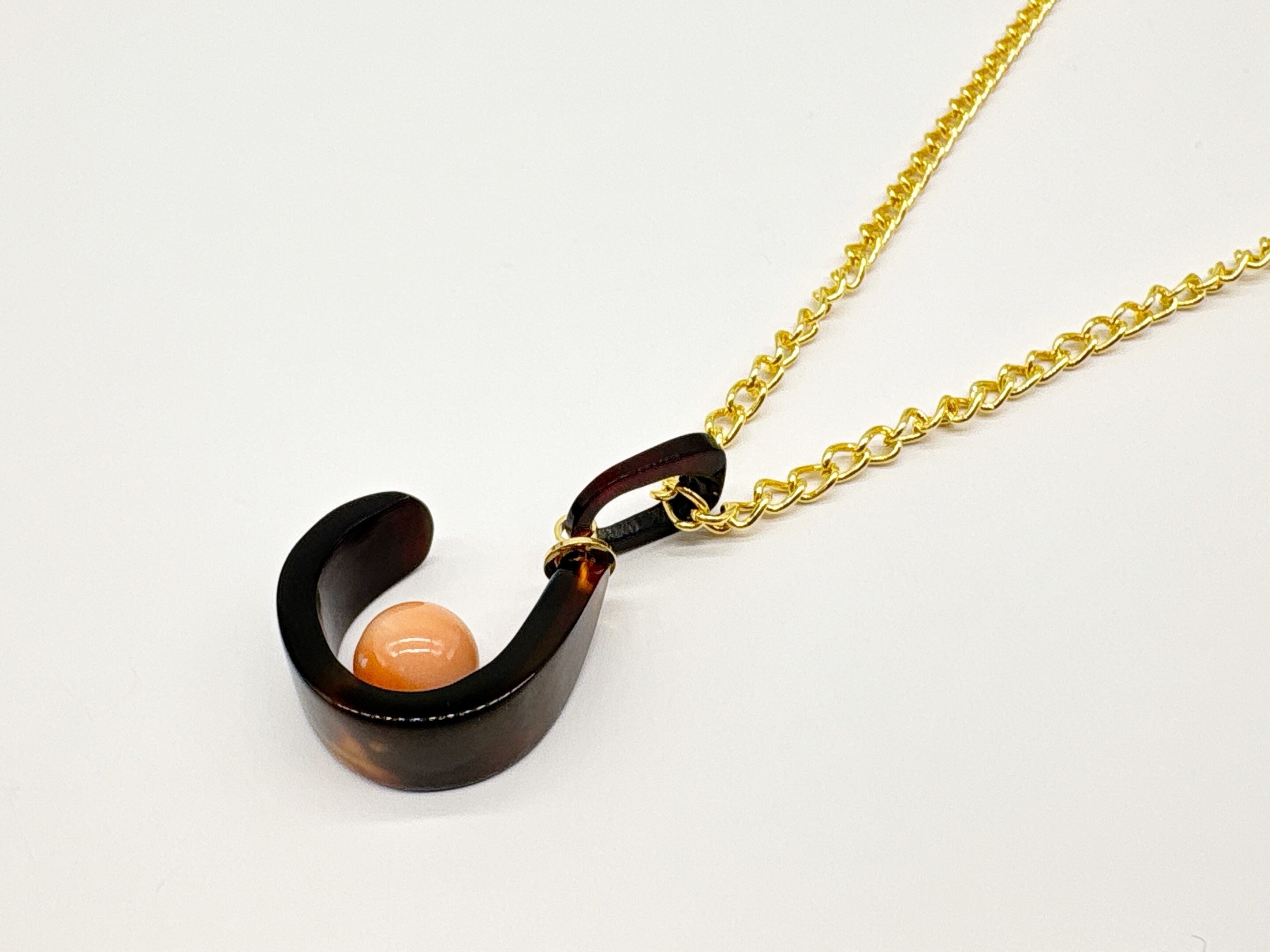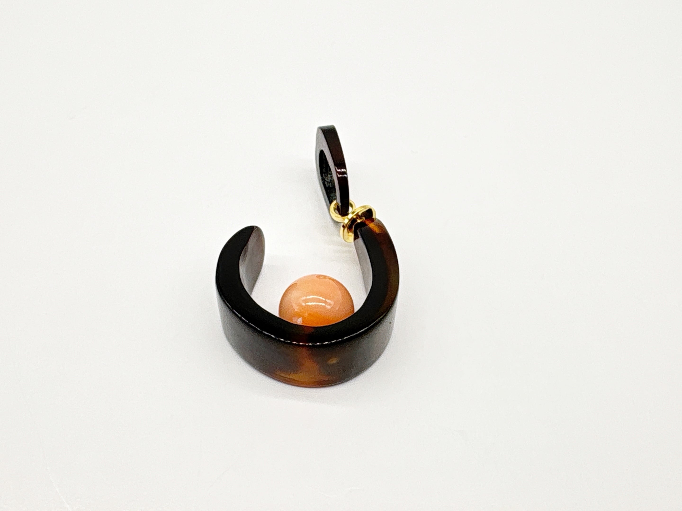 ●サイズ タテ約3.2cm×ヨコ約1.9cm(バチカン含む) ●説明 本べっ甲 バラフ(背甲)使用 もも珊瑚使用 本べっ甲ともも珊瑚を用いたペンダントです。厚みのある本べっ甲を立体的に削り出し、緩やかなC字型のフォルムにまとめています。直線を用いず、連続する曲線のみで構成された形は、見る角度によって印象が変わり、奥行きのある造形を生み出します。中央には球状に磨き上げたもも珊瑚を組み合わせ、完全に囲い込まず、あえて余白を残す構成としています。べっ甲の量感ともも珊瑚の存在が調和し、全体として安定感のあるバランスに仕上がりました!バチカン部分もペンダントトップの曲線に呼応するデザインで、装着時にはトップ全体が一体のフォルムとして見えます。素材と形そのものの美しさを引き出したデザインは、カジュアル・フォーマルを問わず自然に馴染み、胸元に静かな存在感を与えます。さりげない品を添えたい方にも、特別な贈り物としてもおすすめできる、美しさと心地よさを兼ね備えた逸品です。こちらの金メッキの付属チェーンはサービスでお付けしておりますが、お手持ちのチェーンなどに通してもお使い頂ける商品です。画像にあるスピネルチェーン、べっ甲チェーン(別売り)と合わせて頂くと、より豪華な仕上がりになります。日常の装いに、さりげない個性を。商品はこちらの梱包にて大切に発送致します。天然素材の為、色目やサイズ感は多少異なる場合がございます。※べっ甲及び琥珀等の天然素材はすべて本物です。通常希望小売価格¥13,500