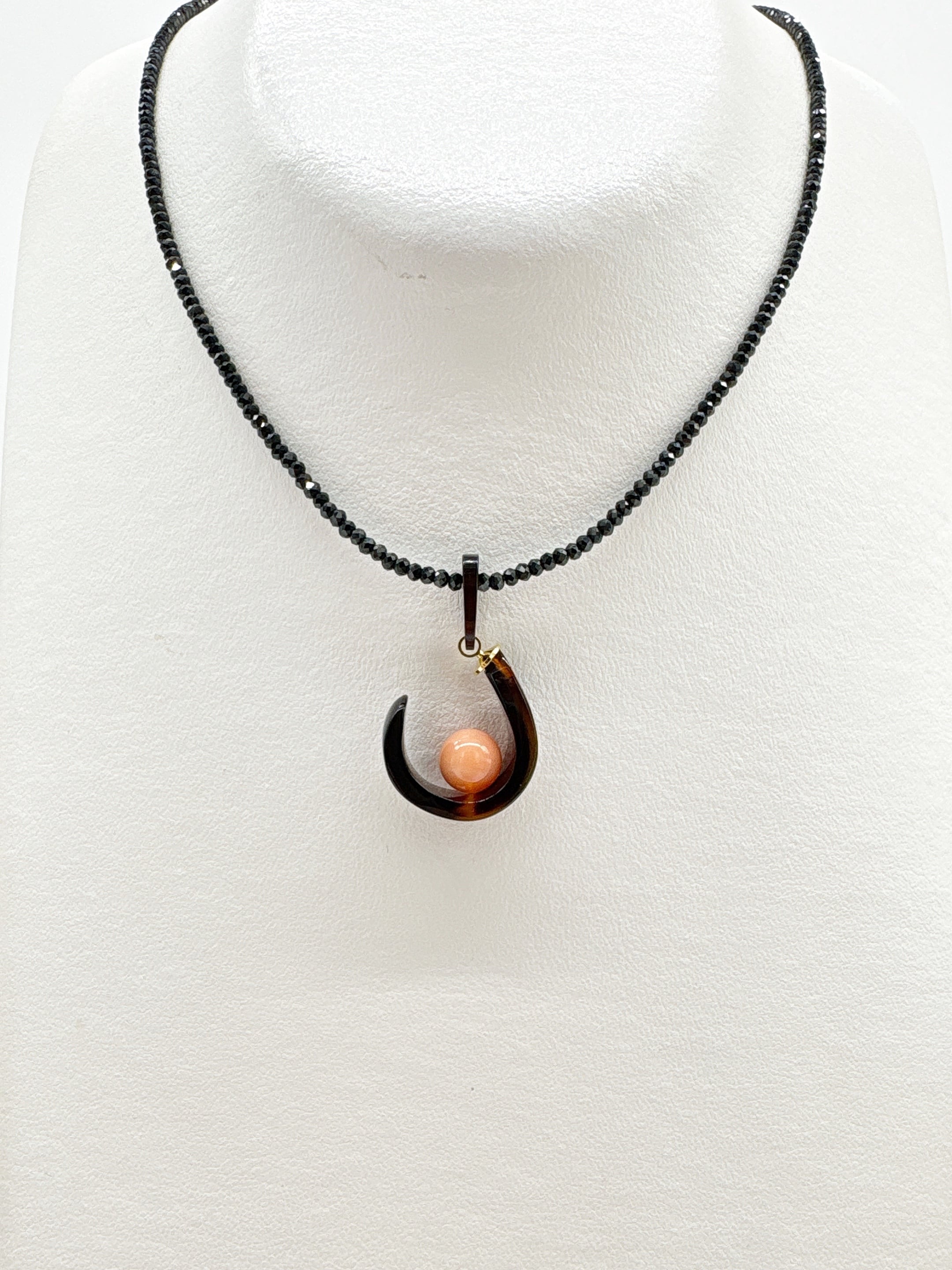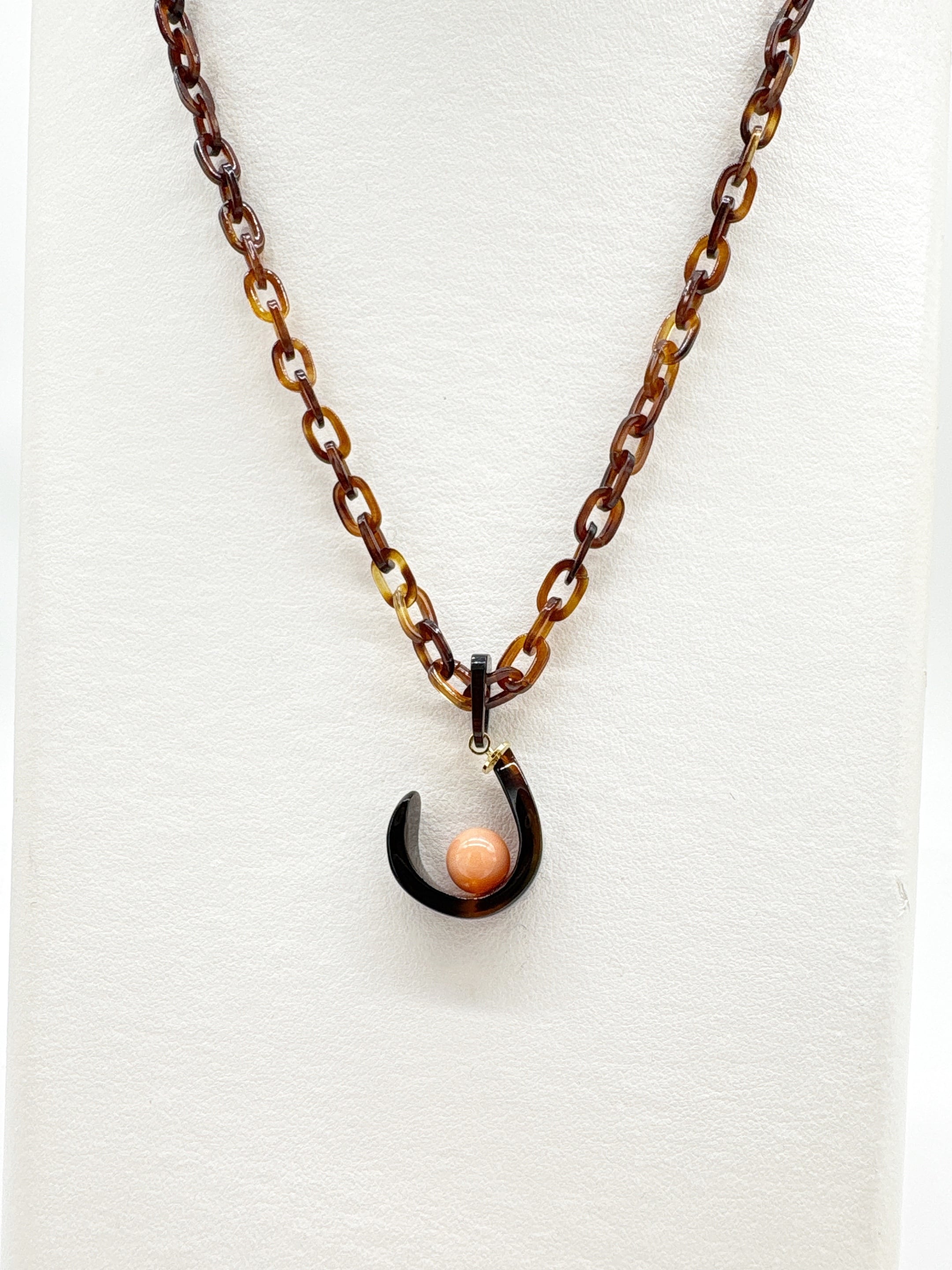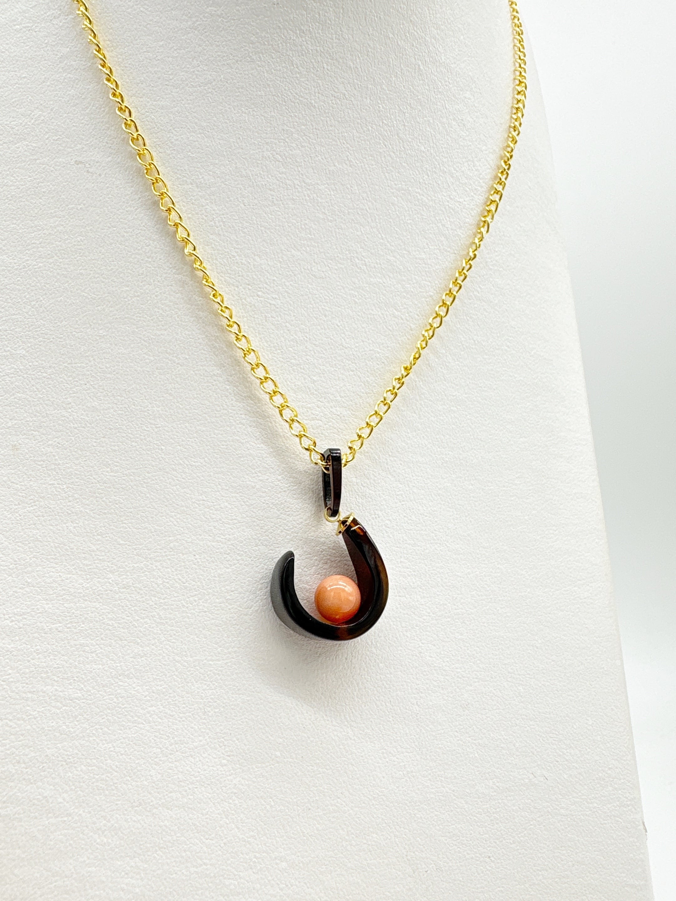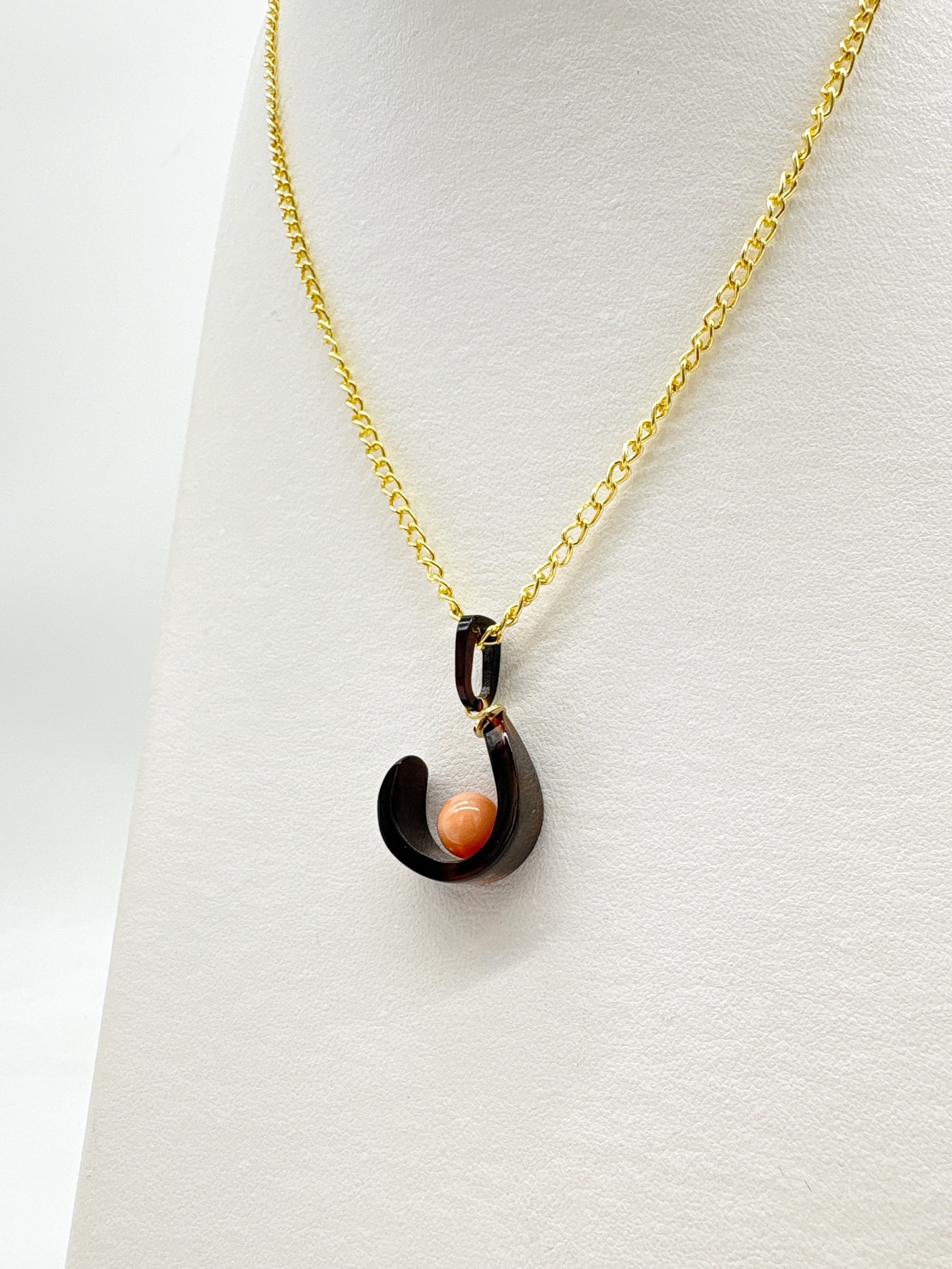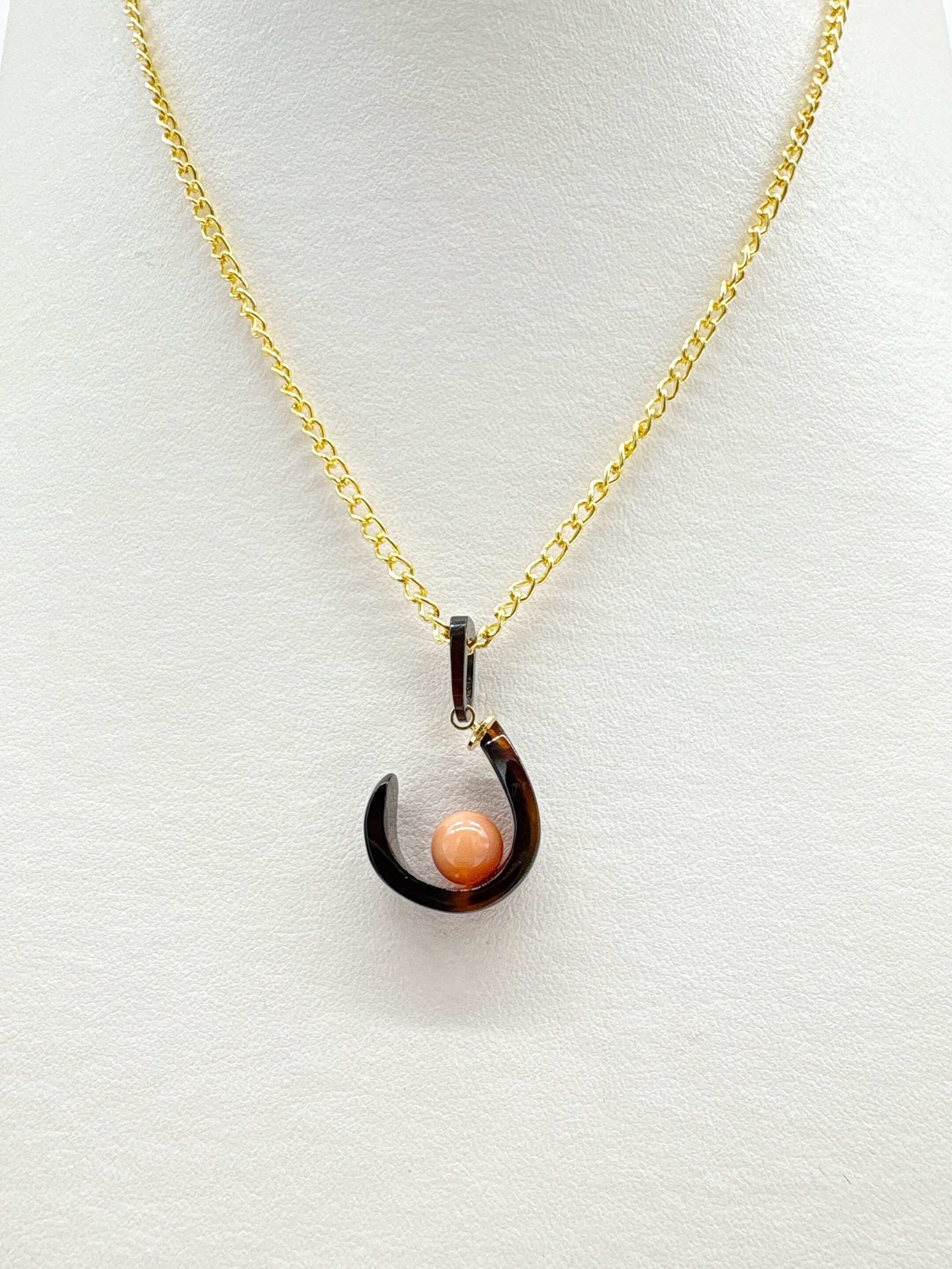 ●サイズ タテ約3.2cm×ヨコ約1.9cm(バチカン含む) ●説明 本べっ甲 バラフ(背甲)使用 もも珊瑚使用 本べっ甲ともも珊瑚を用いたペンダントです。厚みのある本べっ甲を立体的に削り出し、緩やかなC字型のフォルムにまとめています。直線を用いず、連続する曲線のみで構成された形は、見る角度によって印象が変わり、奥行きのある造形を生み出します。中央には球状に磨き上げたもも珊瑚を組み合わせ、完全に囲い込まず、あえて余白を残す構成としています。べっ甲の量感ともも珊瑚の存在が調和し、全体として安定感のあるバランスに仕上がりました!バチカン部分もペンダントトップの曲線に呼応するデザインで、装着時にはトップ全体が一体のフォルムとして見えます。素材と形そのものの美しさを引き出したデザインは、カジュアル・フォーマルを問わず自然に馴染み、胸元に静かな存在感を与えます。さりげない品を添えたい方にも、特別な贈り物としてもおすすめできる、美しさと心地よさを兼ね備えた逸品です。こちらの金メッキの付属チェーンはサービスでお付けしておりますが、お手持ちのチェーンなどに通してもお使い頂ける商品です。画像にあるスピネルチェーン、べっ甲チェーン(別売り)と合わせて頂くと、より豪華な仕上がりになります。日常の装いに、さりげない個性を。商品はこちらの梱包にて大切に発送致します。天然素材の為、色目やサイズ感は多少異なる場合がございます。※べっ甲及び琥珀等の天然素材はすべて本物です。通常希望小売価格¥13,500