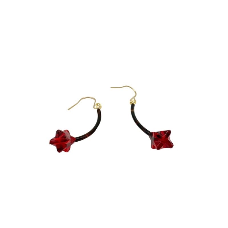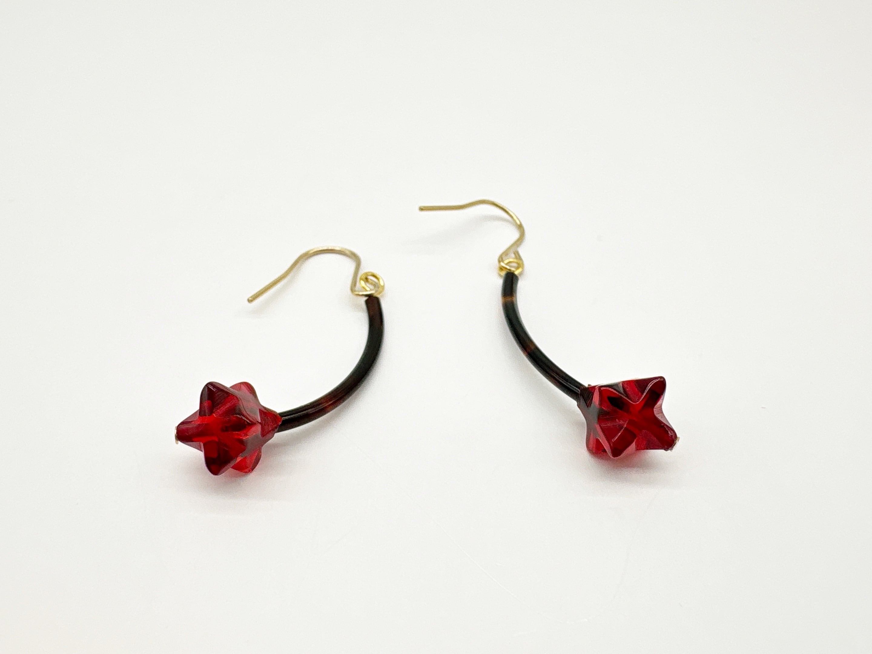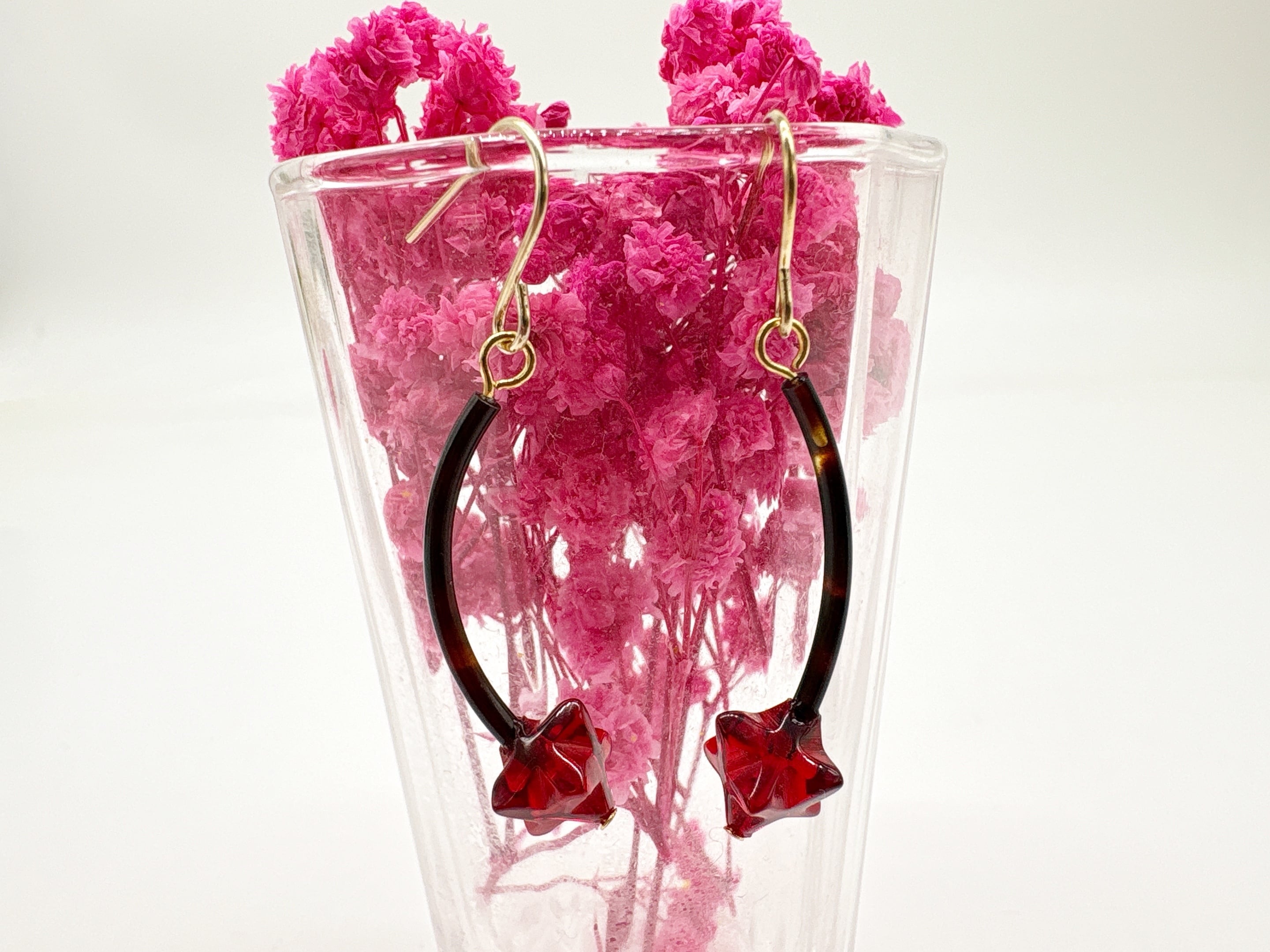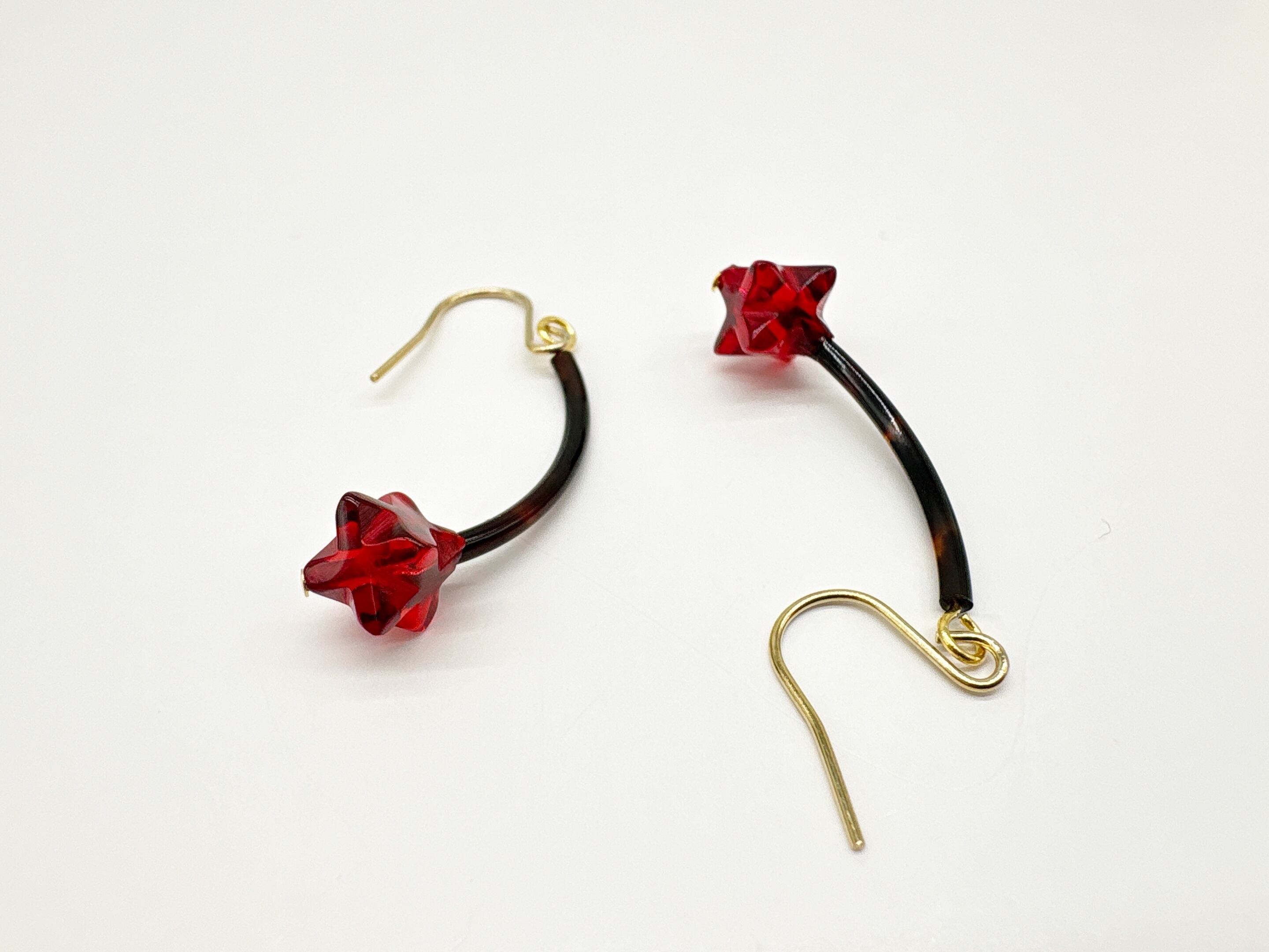 ●サイズ 長さ約4.1cm(金具フック部分含む)×星形パーツ約0.8cm ●説明 本べっ甲 バラフ(背甲)使用 本琥珀(レッドアンバー)使用 金具 サージカルチタン使用 アメリカンフックタイプ 本べっ甲と本琥珀(レッドアンバー)を組み合わせ、素材それぞれの美しさと動きを大切にして仕立てたピアスです。しなやかなカーブを描くべっ甲のラインの先に、星形に磨き上げたレッドアンバーをあしらい、耳元に軽やかで印象的な揺れを生み出しています。べっ甲のパーツは、無駄のないシンプルな曲線ですので、素材の艶やなめらかな表情が自然と引き立ち、全体に落ち着きと洗練された印象をもたらします。先端に組み合わせたレッドアンバーは、内部に光を含んだような透明感があり、動くたびに表情を変えながら、さりげない華やかさを添えます。フックタイプの金具を採用することで、歩くたび、振り向くたびに自然な揺れが生まれ、顔まわりをやさしく彩ります。見た目は印象的でありながら、着け心地は軽く、日常の装いにも取り入れやすいバランスに仕上げています。異なる素材が互いを引き立て合いながら、一体となって静かな存在感を放つデザイン。装いのアクセントとしても、控えめな華やぎを添える一本としてもお楽しみいただける、上品なピアスです。金具はサージカルチタンのニッケルフリーを使用しているのでアレルギーの方にも安心してご使用頂けます。揺れるたび、赤の輝きが耳元に静かな余韻を残します。●べっ甲はとても軽いためお気軽にお付けいただけます。商品はこちらの梱包にて大切に発送致します。天然素材の為、色目やサイズ感は多少異なる場合がございます。※べっ甲及び琥珀等の天然素材はすべて本物です。通常希望小売価格¥10,000