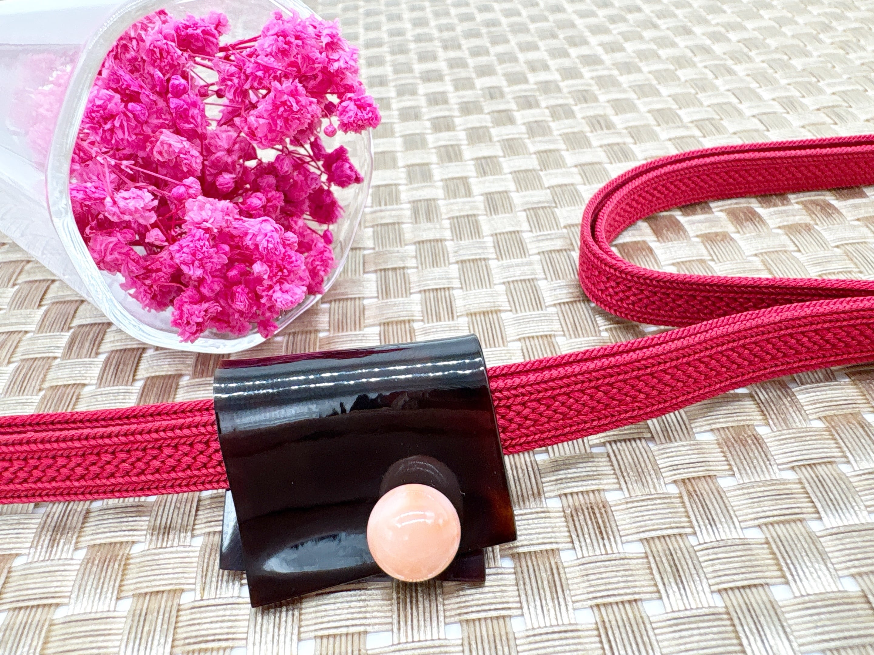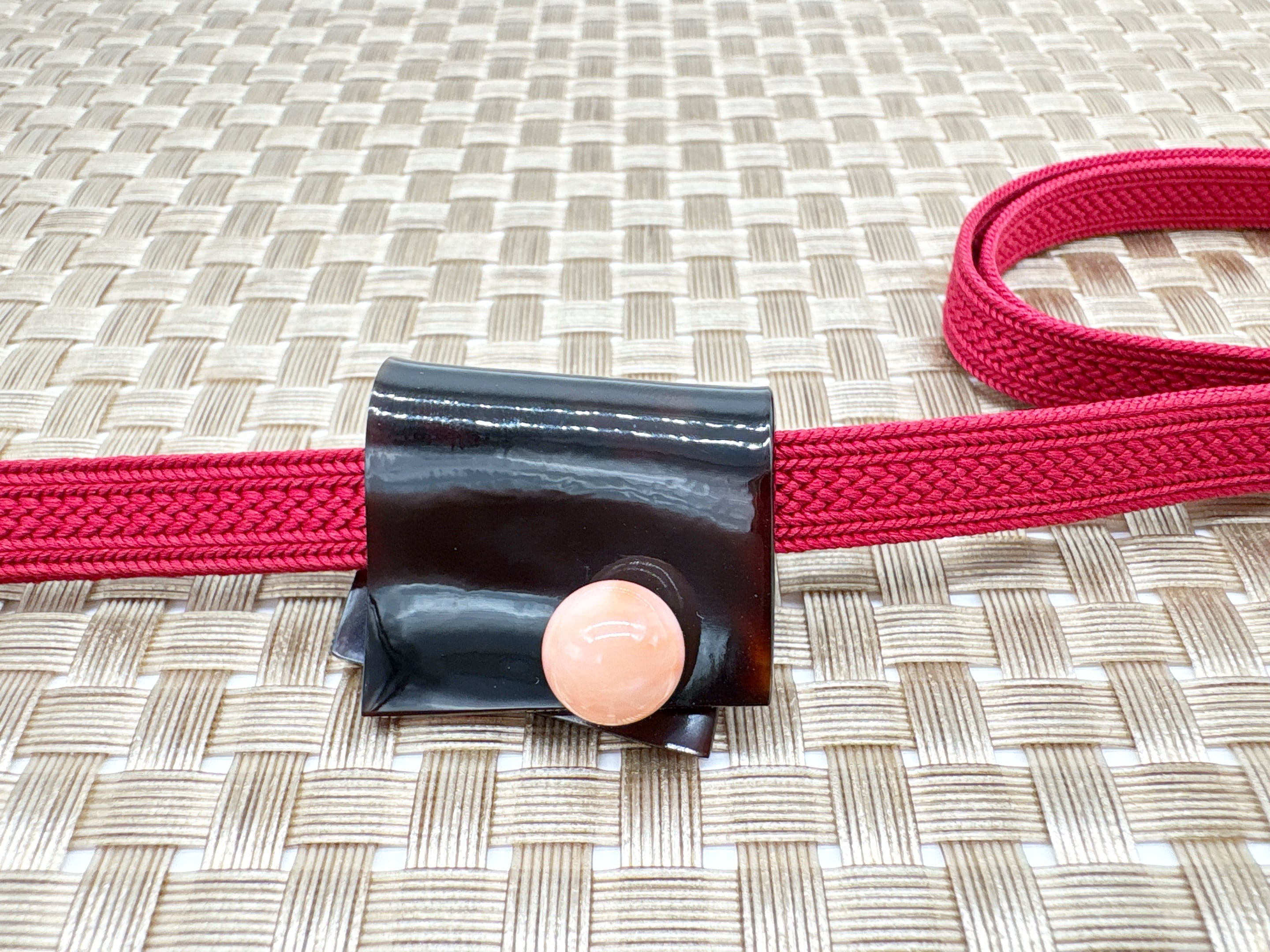 ●サイズ タテ約2.6cm×ヨコ約3.3cm ●説明 本べっ甲 バラフ(背甲)使用 もも珊瑚使用 なめらかに磨かれたべっ甲の板材を用い、角度や重なりに変化を持たせた、立体感のある帯留めです。直線的な面と緩やかな反りが組み合わさることで、平面的になりすぎず、光の当たり方や見る向きによって異なる表情を生み出します。帯まわりに添えた際にも、静かな奥行きと美しさが感じられる仕上がりとなっています。中央には、丸みの整ったもも珊瑚を組み合わせ、重なり合うべっ甲の形をまとめるキュートなポイントに。全体のバランスを崩すことなく、もも珊瑚によって柔らかなリズムを加えることで、控えめながらも印象に残る帯留めを作り上げました。素材と形そのものの美しさを引き立てたデザインは、さまざまな着物の装いに自然に調和します。また、こちらの商品は帯留めとしてだけでなく、紐やチェーンを通すことでペンダントとしてもお使いいただける仕様です。胸元で用いた際には、帯とは異なる見え方となり、いつものファッション選びがより楽しくなること間違いなし!和装として帯留めに・洋装としてペンダントに使用できるため、装いの幅を広げてくれる点も魅力のひとつです。天然素材ならではの質感や個体差を楽しみながら、場面に応じて使い分けのできる一品です。商品はこちらの梱包にて大切に発送致します。使うほどに愛着の深まる、静かな存在感を備えた一点。天然素材の為、色目やサイズ感は多少異なる場合がございます。※べっ甲及び琥珀等の天然素材はすべて本物です。通常希望小売価格¥15,000
