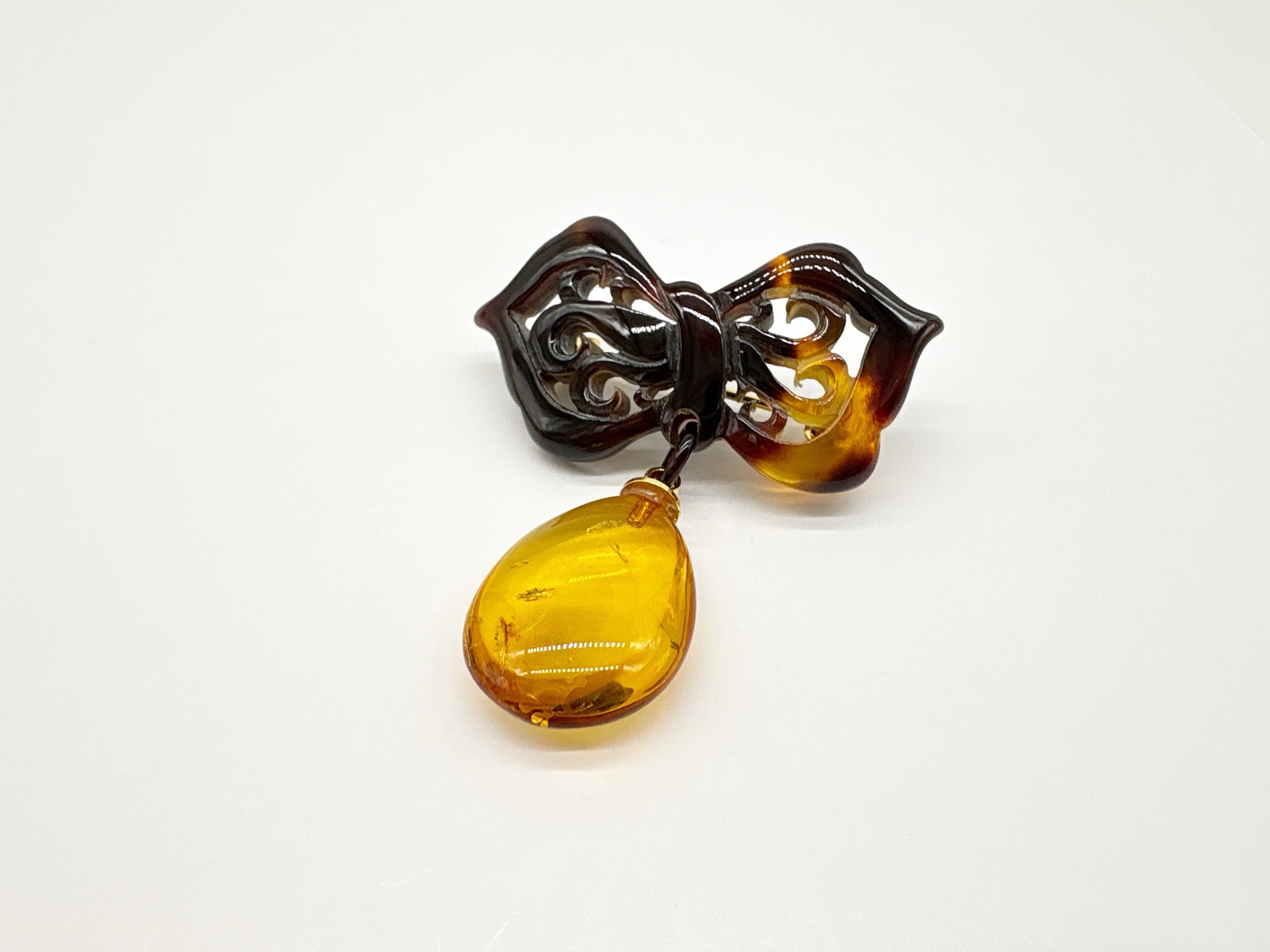 ●サイズ タテ約4.5cm×ヨコ約4.0cm ●説明 本べっ甲 バラフ(背甲)使用 本琥珀(バルティックアンバー)使用 本べっ甲と本琥珀(バルティックアンバー)を組み合わせ、上品な存在感があるブローチです。緩やかな曲線と透かし彫りを取り入れたべっ甲の造形が、軽やかさと奥行きを生み出し、その下に組み合わせた琥珀が静かに揺れるデザイン。べっ甲部分は、リボンのような左右に広がるデザイン。職人の技術である透かし彫りによって彫り込まれた曲線と空間が重なり、光を受けることで陰影が生まれ、見る角度によって異なる表情を楽しめます。先端に添えたバルティックアンバーは、雫形に磨き上げられ、透明感のあるやわらかな輝きを放ちます。べっ甲の落ち着いた佇まいに寄り添うように揺れ、全体に穏やかな華やぎを添えています。衣服やストール、帽子などにも合わせやすく、装いのアクセントとしてさりげなく取り入れられる一品ですので親子でのシェアも〇。本べっ甲と本琥珀、それぞれの素材が持つ美しさを引き立て合った、端正で印象的なブローチです。べっ甲はとても軽いためお洋服への負担も少なくお気軽にお使い頂けます。静かな造形美と、琥珀のやさしい輝きを胸元に。商品はこちらの梱包にて大切に発送致します。天然素材の為、色目やサイズ感は多少異なる場合がございます。※べっ甲及び琥珀等の天然素材はすべて本物です。通常希望小売価格¥33,000