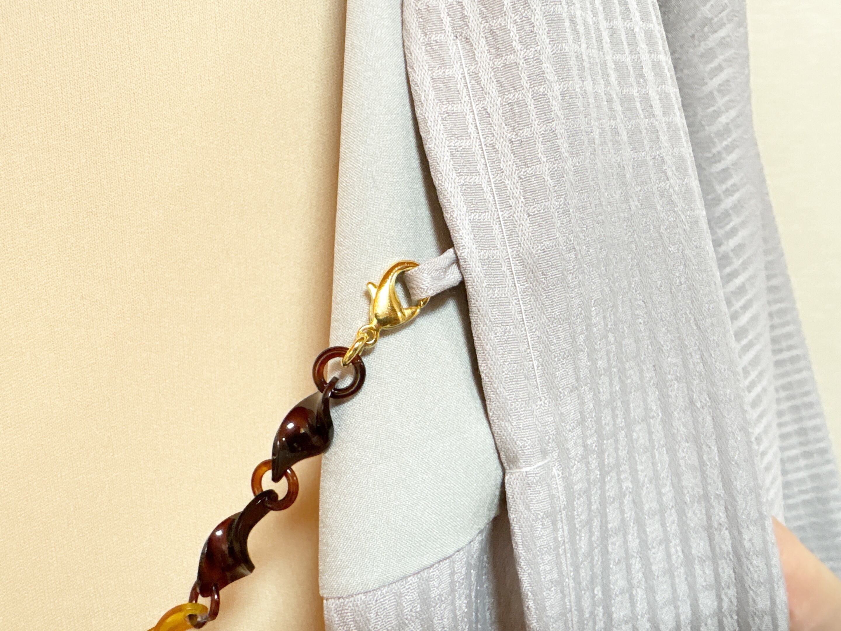 ●サイズ 全長約23.4cm(金具含む)●説明 本べっ甲 バラフ(背甲)使用 白甲(肚甲)使用 留具メッキカギフック使用 ユニセックス対応 本べっ甲バラフと白甲を組み合わせ、それぞれの魅力が引き立つよう丁寧に仕立てた羽織紐です。深みのあるバラフと、やわらかく澄んだ印象の白甲が連なり、胸元に印象に残る表情を生み出します。曲線を描くパーツは、一つひとつ熟練の職人の手によってねじれ加工を施しており、手仕事ならではの温もりを感じていただけます。光を受けるたび、バラフは奥行きのある艶を見せ、白甲は軽やかで清らかな光をまとい、素材の対比が上品な趣を添えます。全体は連なりのあるつくりで、羽織の合わせに沿って自然になじみ、動きに合わせてしなやかに揺れます。程よい存在感がありながら主張しすぎることはなく、日常の装いから改まった装いまで幅広くお使いいただけます。形とつながりの美しさを大切にし、素材が本来持つ表情を活かしました。バラフと白甲、それぞれの魅力が静かに響き合う、上品で落ち着いた佇まいの羽織紐です。商品はこちらの梱包にて大切に発送致します。異なる素材が奏でる、穏やかな調和を胸元に。天然素材の為、色目やサイズ感は多少異なる場合がございます。※べっ甲及び琥珀等の天然素材はすべて本物です。通常希望小売価格¥27,000
