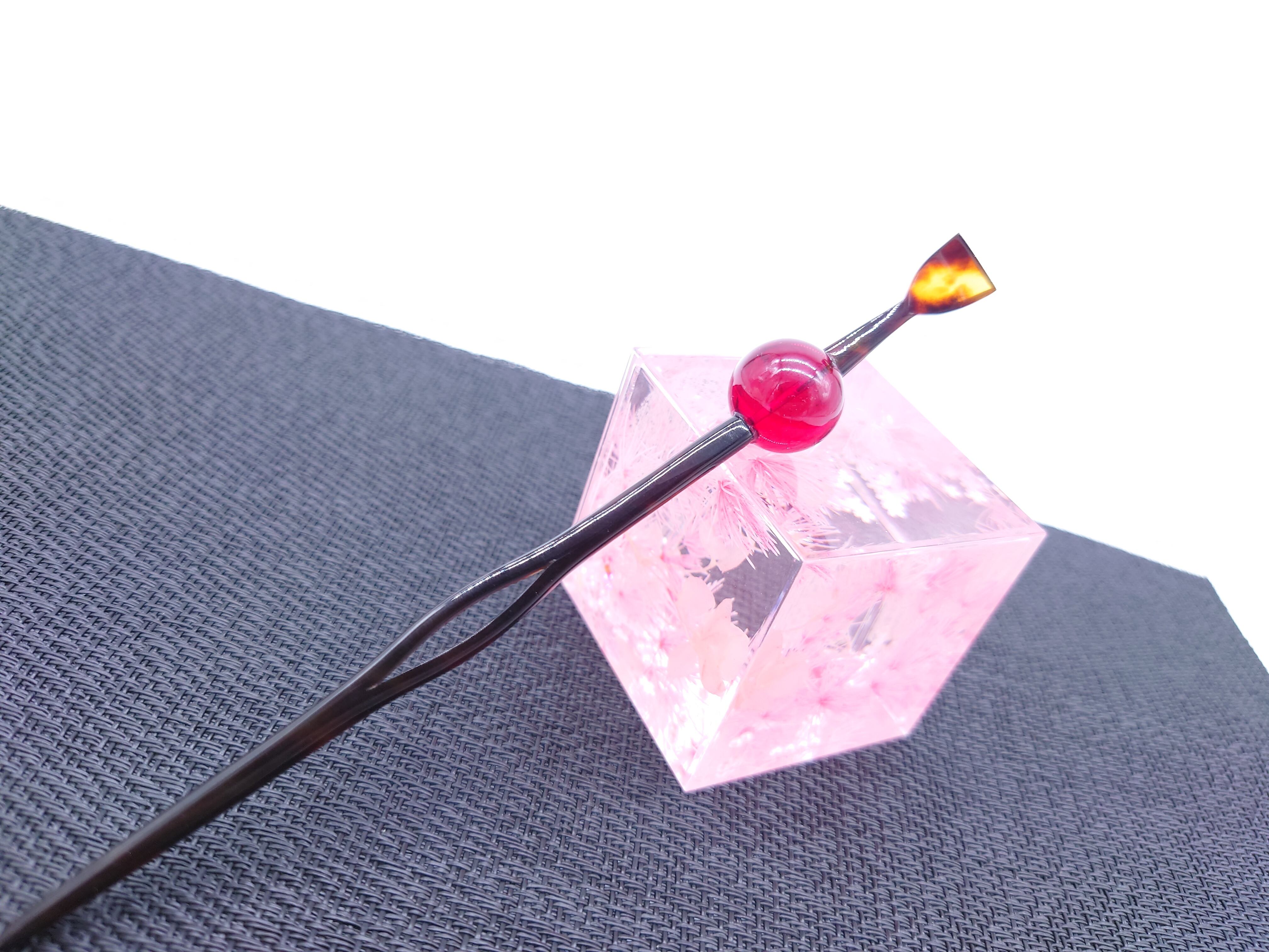 琥珀(レッドアンバー)を装飾した鼈甲の玉かんざしです。赤くキラキラした琥珀の輝きがとても美しく、飴玉のようなぷっくり、ツヤツヤとしたレトロな色合いは、ヘアアレンジを華やかに演出してくれます。可愛く、程よい大きさのシンプルなデザイン、軽くてとっても使いやすいオススメの一品です。若い方から年配の方まで幅広くお使い頂けます。