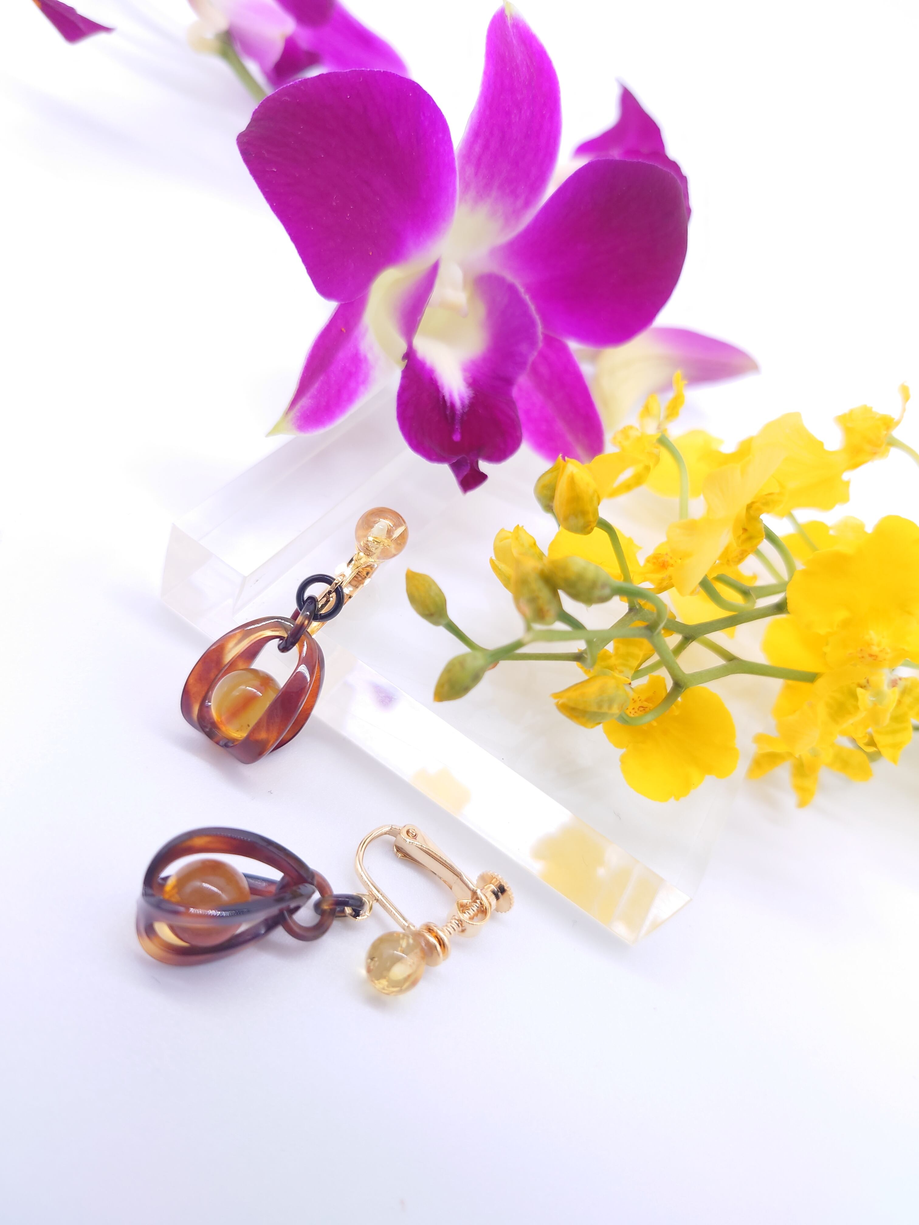 本べっ甲 イヤリングカゴタイプ。カゴの中には琥珀玉(バルティックアンバー)を入れています。カゴから覗く琥珀玉のキラキラがとても綺麗!お出かけはTシャツなどのカジュアルに合わせてもとてもカワイイアイテムです。当ショップのスタッフもよく着けてますよ!是非是非オススメのイヤリングです。 ※べっ甲及び琥珀等の天然素材はすべて本物です。