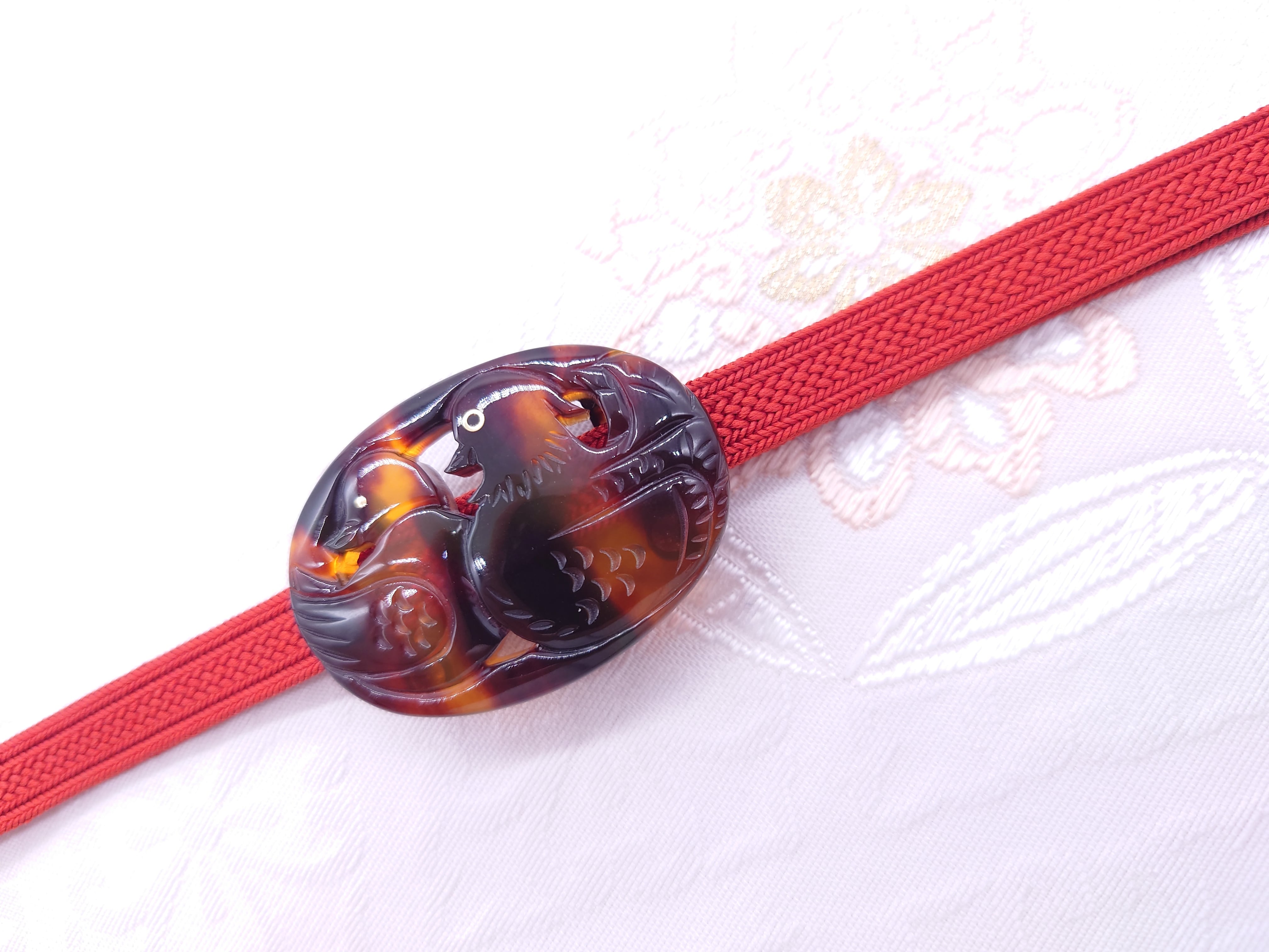 高級感あふれる本鼈甲(ほんべっこう)を使用した帯留めです。オシドリのモチーフを美しいバラフ甲で表現した、高級感あふれる一品です。またオシドリは夫婦円満を象徴するといわれる縁起のいい柄です。是非ワンランク上の、大人のお洒落をお楽しみ下さい。母の日や、敬老の日のプレゼントとしても大変喜ばれオススメの商品です。
