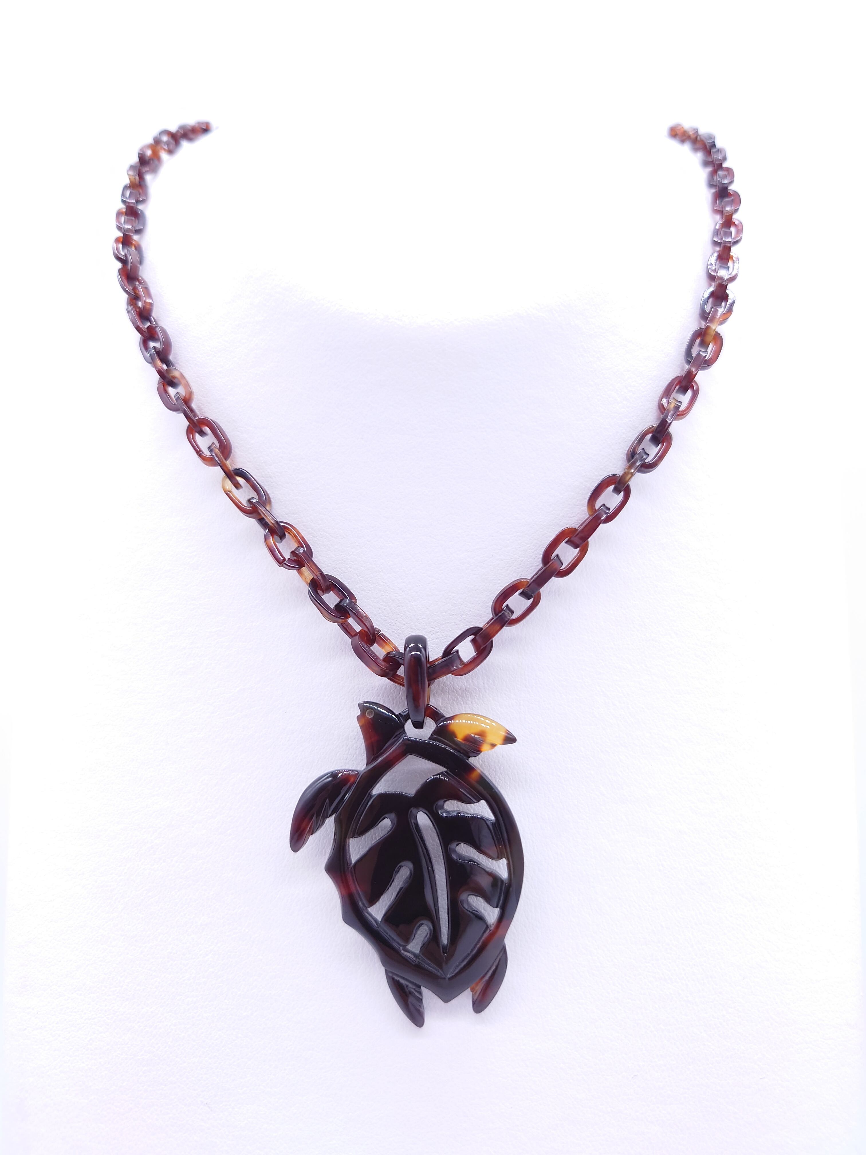 ハワイアンな感じのカメモチーフペンダントはとても存在感がありお洒落でキュート!割と大きめなのでカジュアルスタイルに合わせて頂くと嬉しいです。もちろんフォーマルな着こなしにも合わせていただけます。透かし彫りをしたペンダントは職人さんの技術が光る一品です。親子でシェアしても◎
