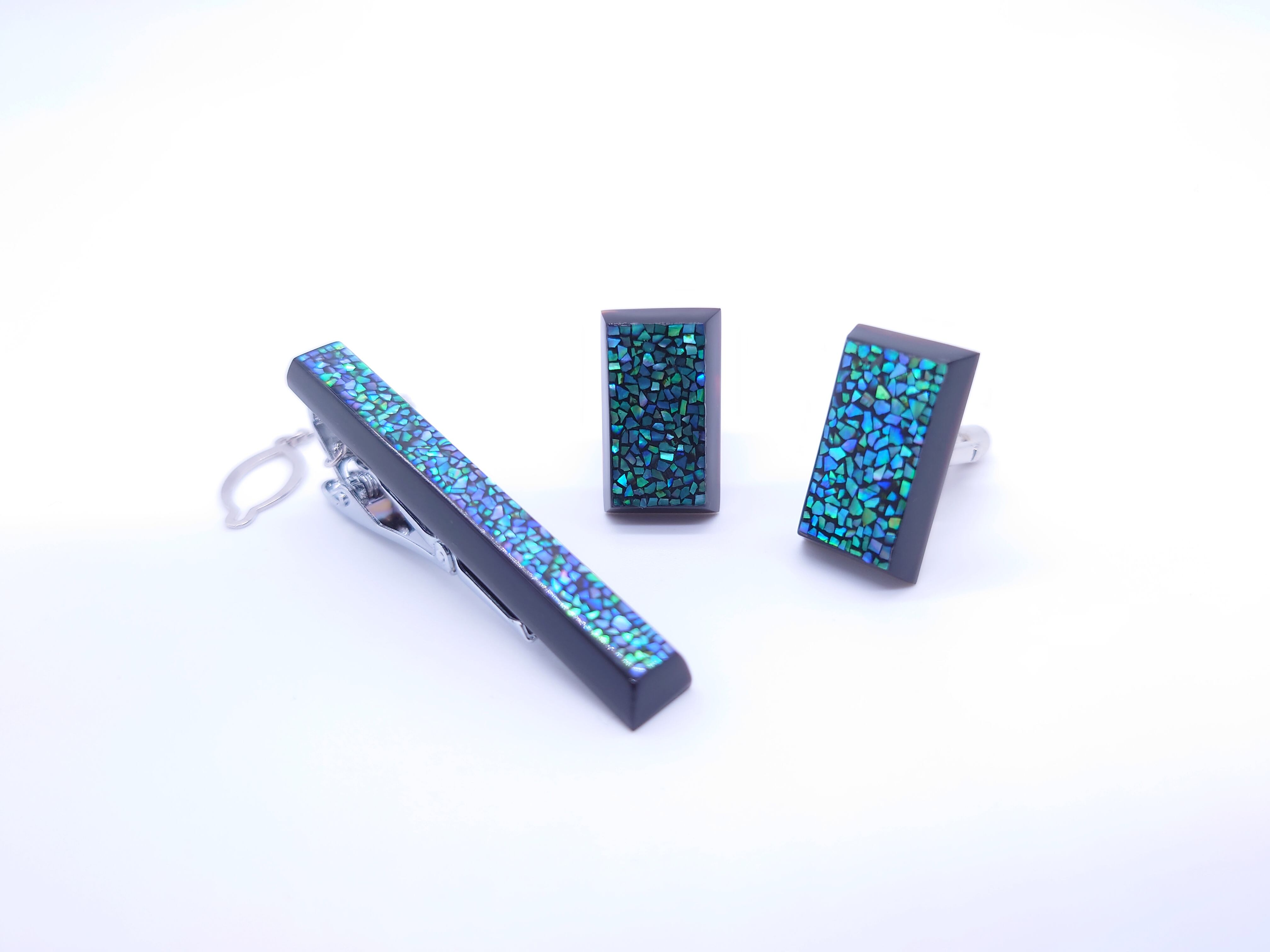 縦長のタイ止め、スクエア型のカフスにブルーの螺鈿蒔絵を施したスタイリッシュな一品。蒔絵がキラキラ光り、高級感があふれる商品となっております。是非ワンランク上の、大人のお洒落をお楽しみ下さい。