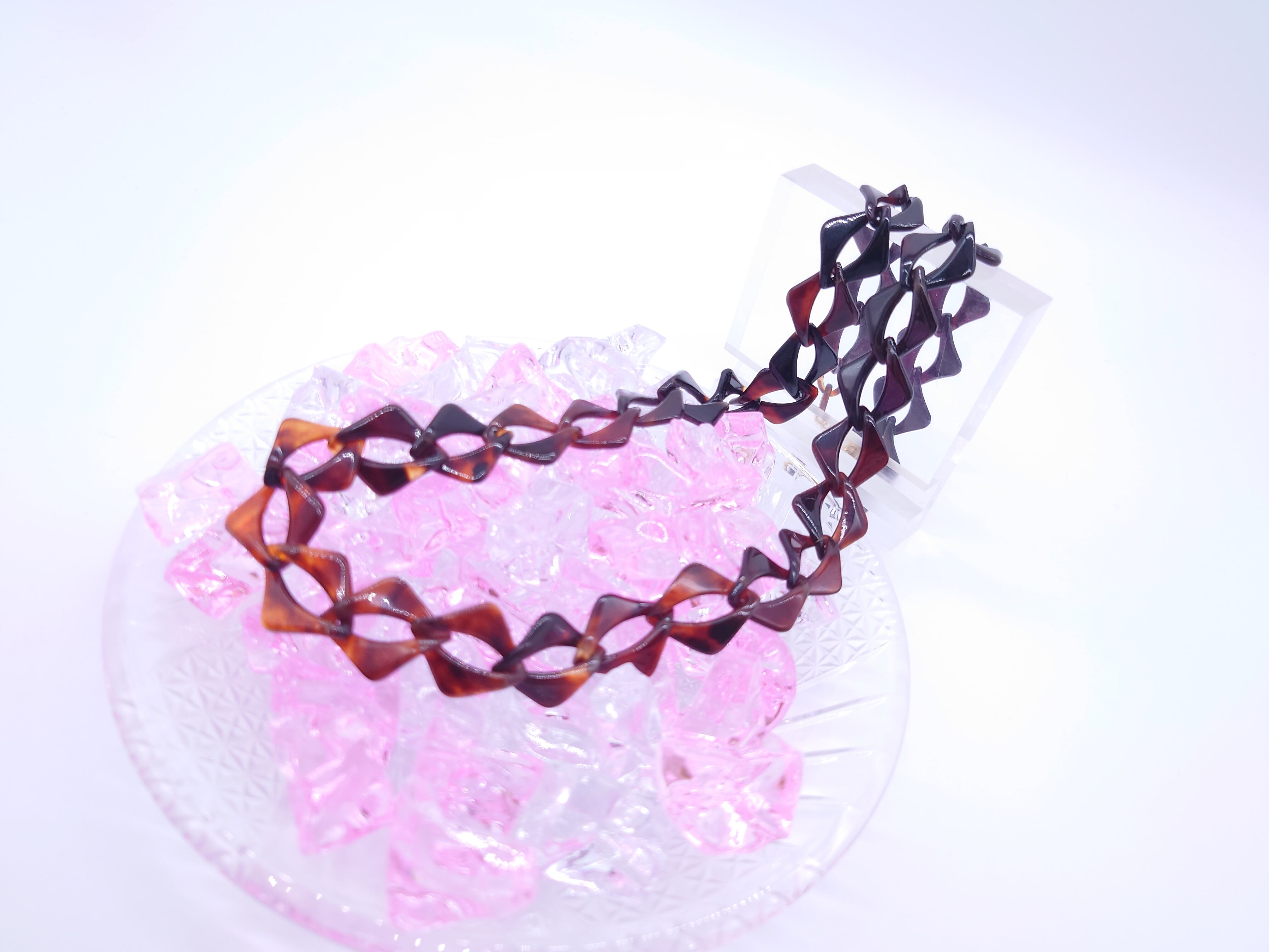 菱形を繋ぎ合せたシンプルですが存在感のあるネックレス。べっ甲らしさ、エレガントさがありフォーマルな場所にもピッタリです!個人的にはVラインの洋服に合わせて頂けると胸元がとてもキレイに引き立ちます。限定商品の為、この機会に是非! ※べっ甲及び琥珀等の天然素材はすべて本物です。