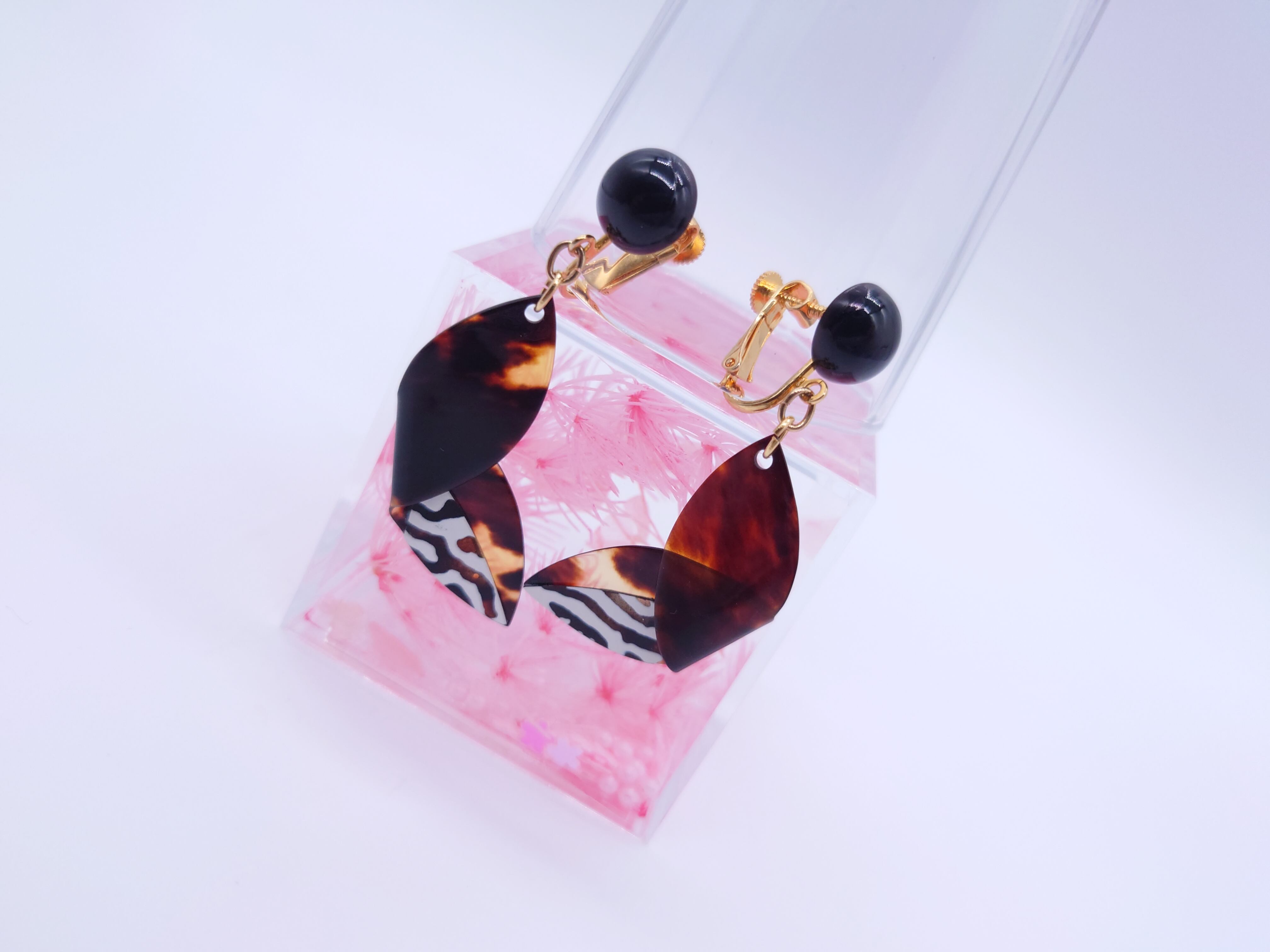 水もく柄を漆で丁寧に描いたインパクトのあるイヤリング。あえてべっ甲を折り曲げる事で動きがありカジュアルコーデにもピッタリ!気軽に着けて頂きたい一品です。 ※べっ甲及び琥珀等の天然素材はすべて本物です。
