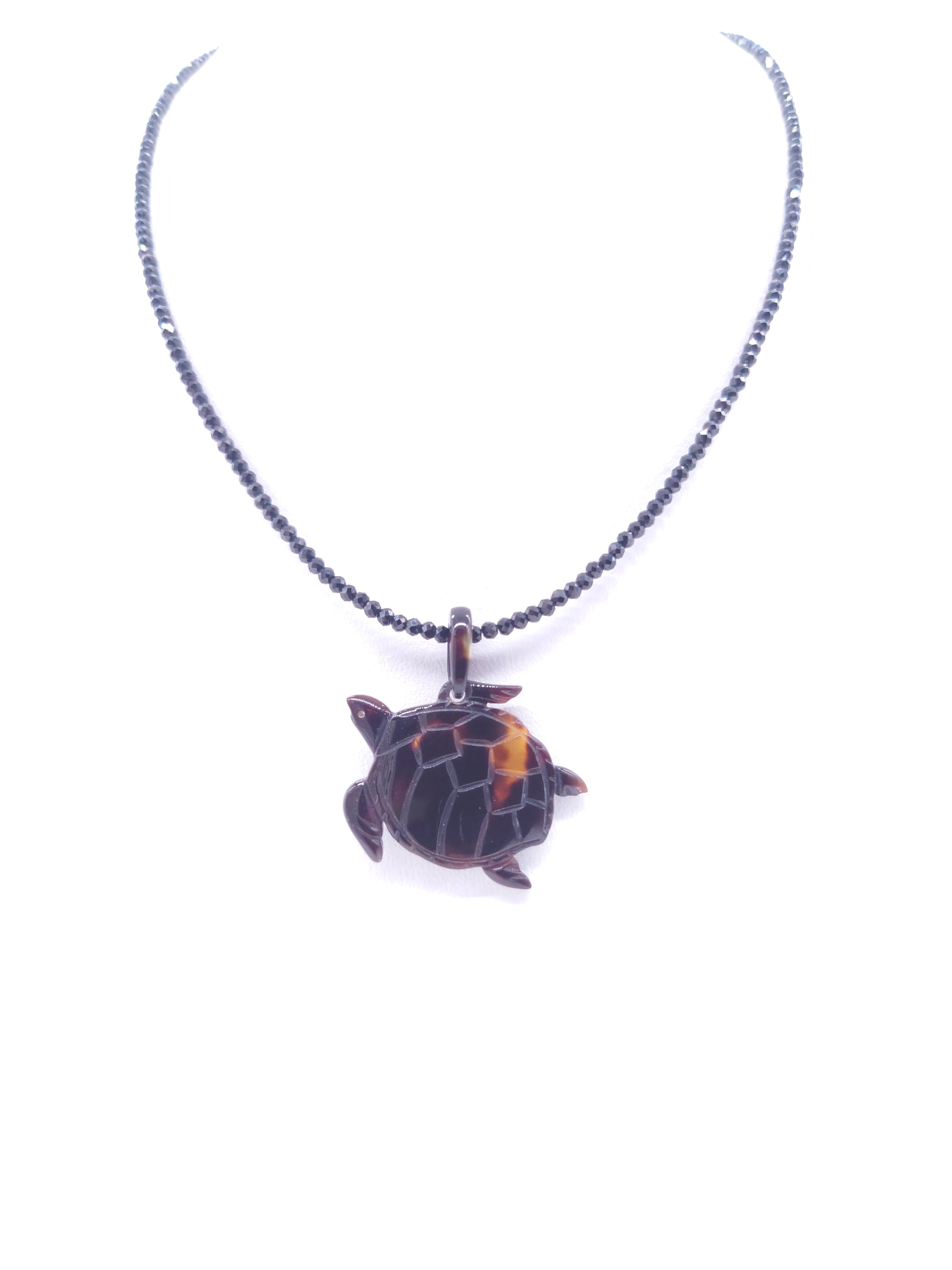 ウミガメをモチーフに涼しげなペンダントトップ。ゆらゆらと泳いでいるような可愛らしい姿をカジュアルにTシャツやワンピースに気軽に着けて頂きたいです!またバッグなどにストラップとして着けてもお洒落! ※べっ甲及び琥珀等の天然素材はすべて本物です。