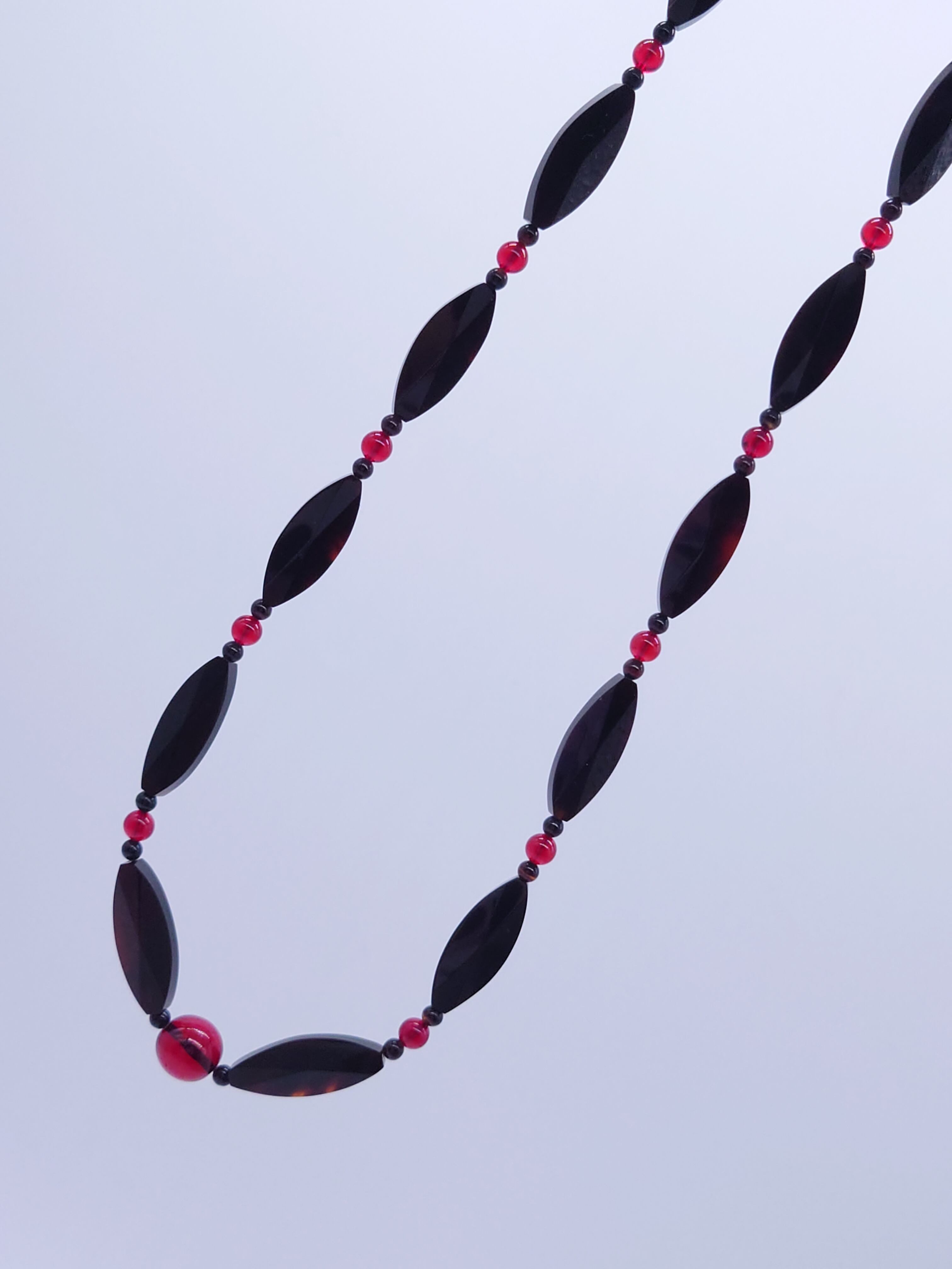 90センチの超ロングはモダンでお洒落!べっ甲パーツは18パーツ使用しておりすべてに裏表合わせて8面カットを施しております。琥珀は12ミリ玉センターが1個と両サイドに16玉使用しています。ジョイントパーツにべっ甲丸玉4ミリを使用し本格的なネックレスに仕上げました!べっ甲すべてにカットしているのでキラキラと輝き、黒と赤のコントラストに更にアクセントがつきます。当社イチオシのネックレスを通常価格よりもかなりお安く設定させて頂いておりますので是非ともお買い求めください。限定1本のみとなります。 ※べっ甲及び琥珀等の天然素材はすべて本物です。