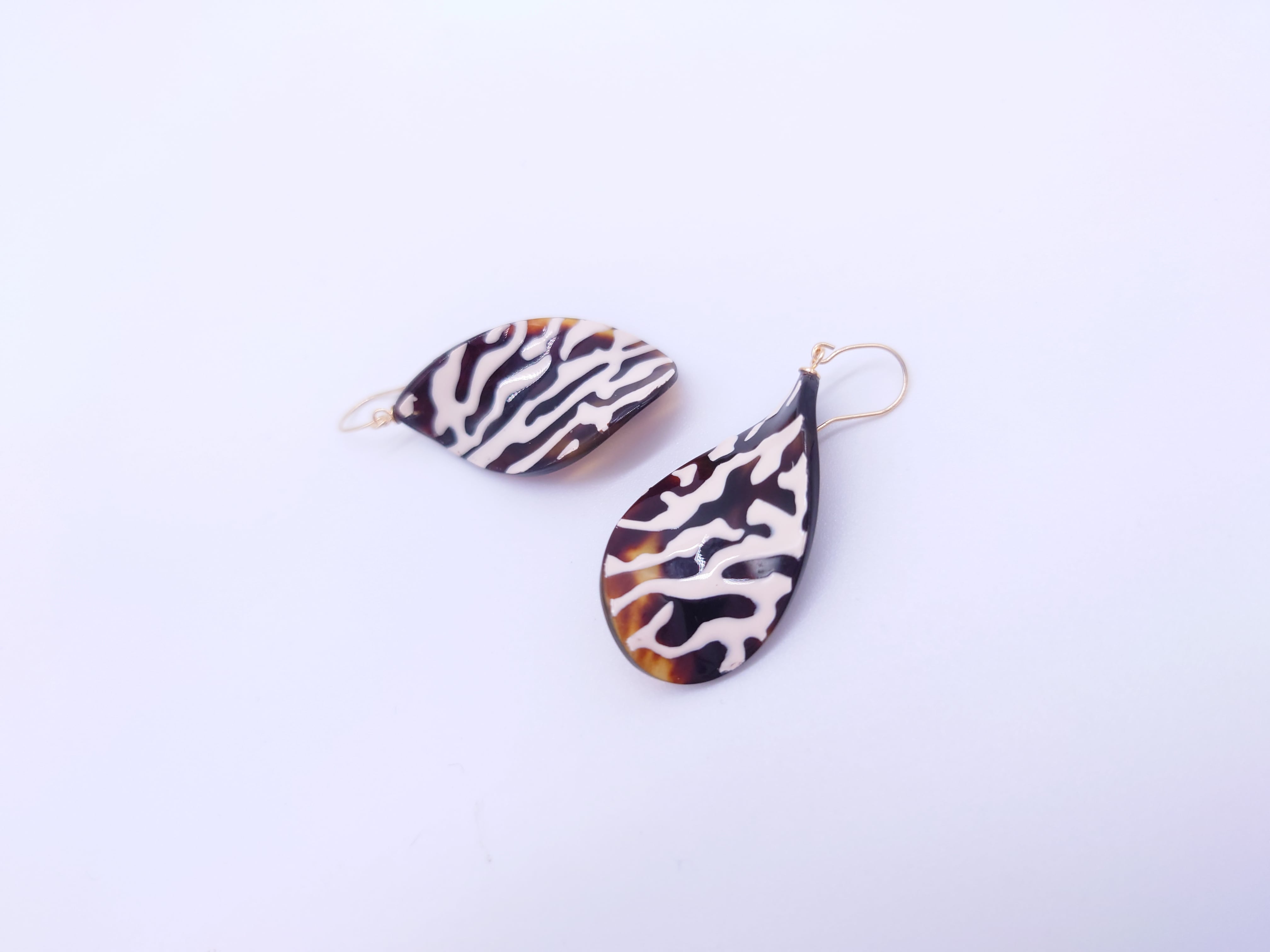 白黒のコントラストになる水もく柄がインパクトになりお洒落。軽くヒネっているためピアスに動きがありプラプラとカワイイです!薄っすらとべっ甲柄も見えて上品さも兼ね備えているのでカジュアルでもフォーマルでも自由に着けて頂きたい一品です。個人的にはTシャツに合わせて軽くのお出かけにも連れて行ってほしいピアスです!また大切な方へのプレゼントにも最適かと思います。 ※べっ甲及び琥珀等の天然素材はすべて本物です。