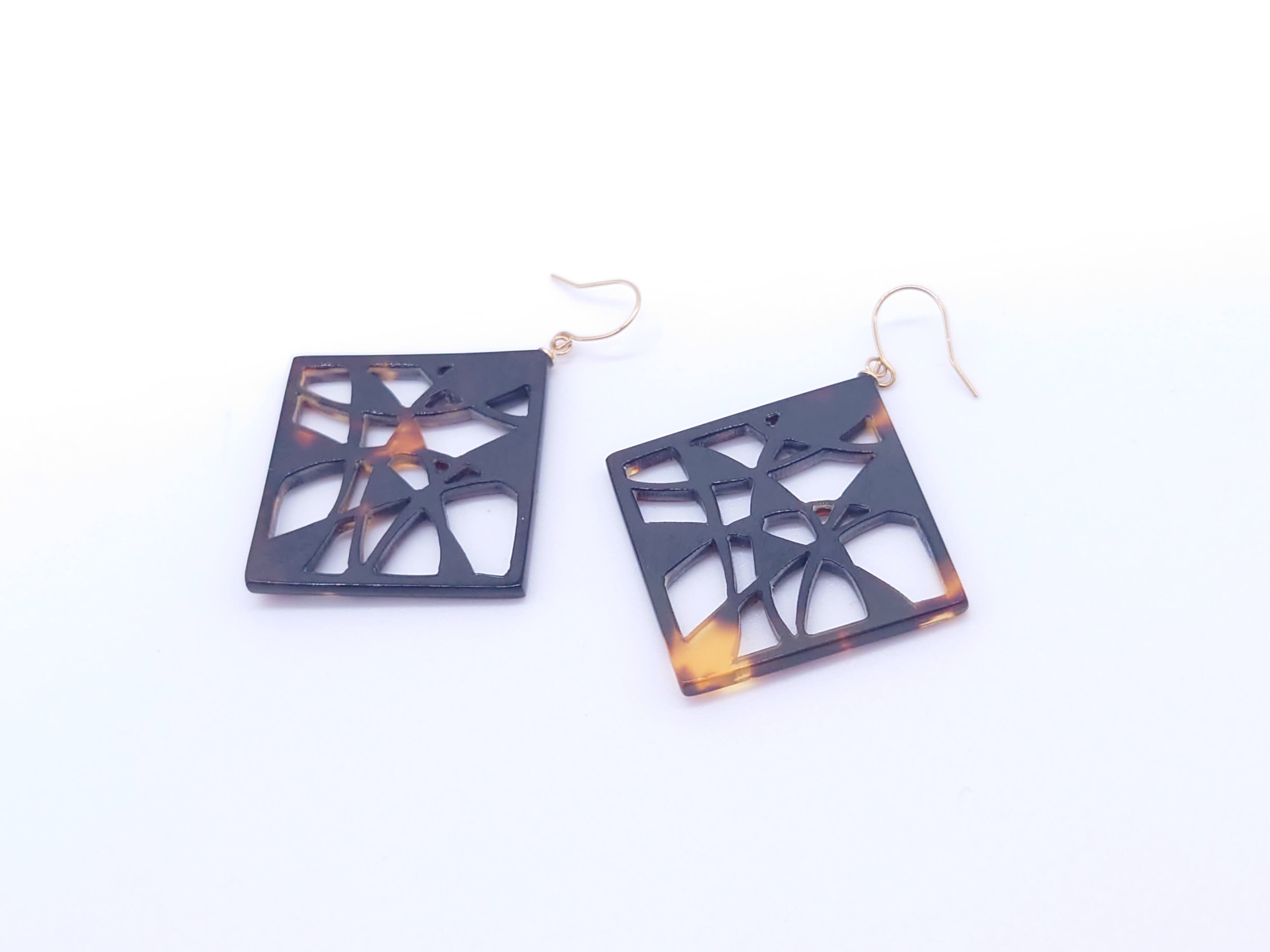 正方形のスクエアパーツにモダンな柄の透かし彫りを施したピアス。1つ1つに穴を空けてそこから糸ノコと言う透かしをする道具を使いすべて手作業で透かしていきます。片方で17ヶ所の透かしを入れて行く為、大変手の混んだ商品となります。デザインもモダンでカジュアル、フォーマル、どちらにも合わせやすいです。沢山の透かしですがラインがスッキリしている為、お顔もスッキリと見せてくれるお洒落なピアスですのでオススメの一品です。この機会に手作りの良さを是非! ※べっ甲及び琥珀等の天然素材はすべて本物です。