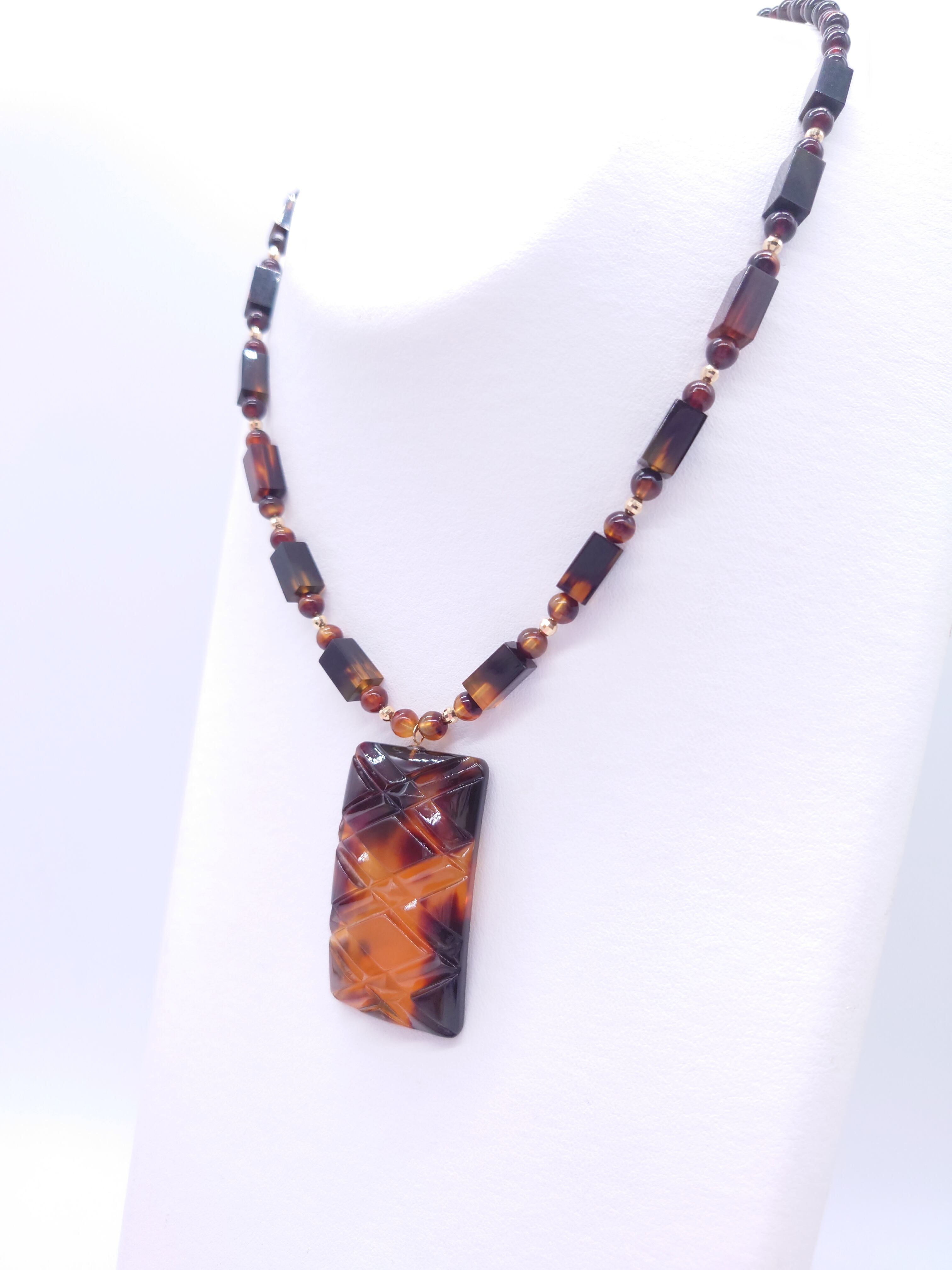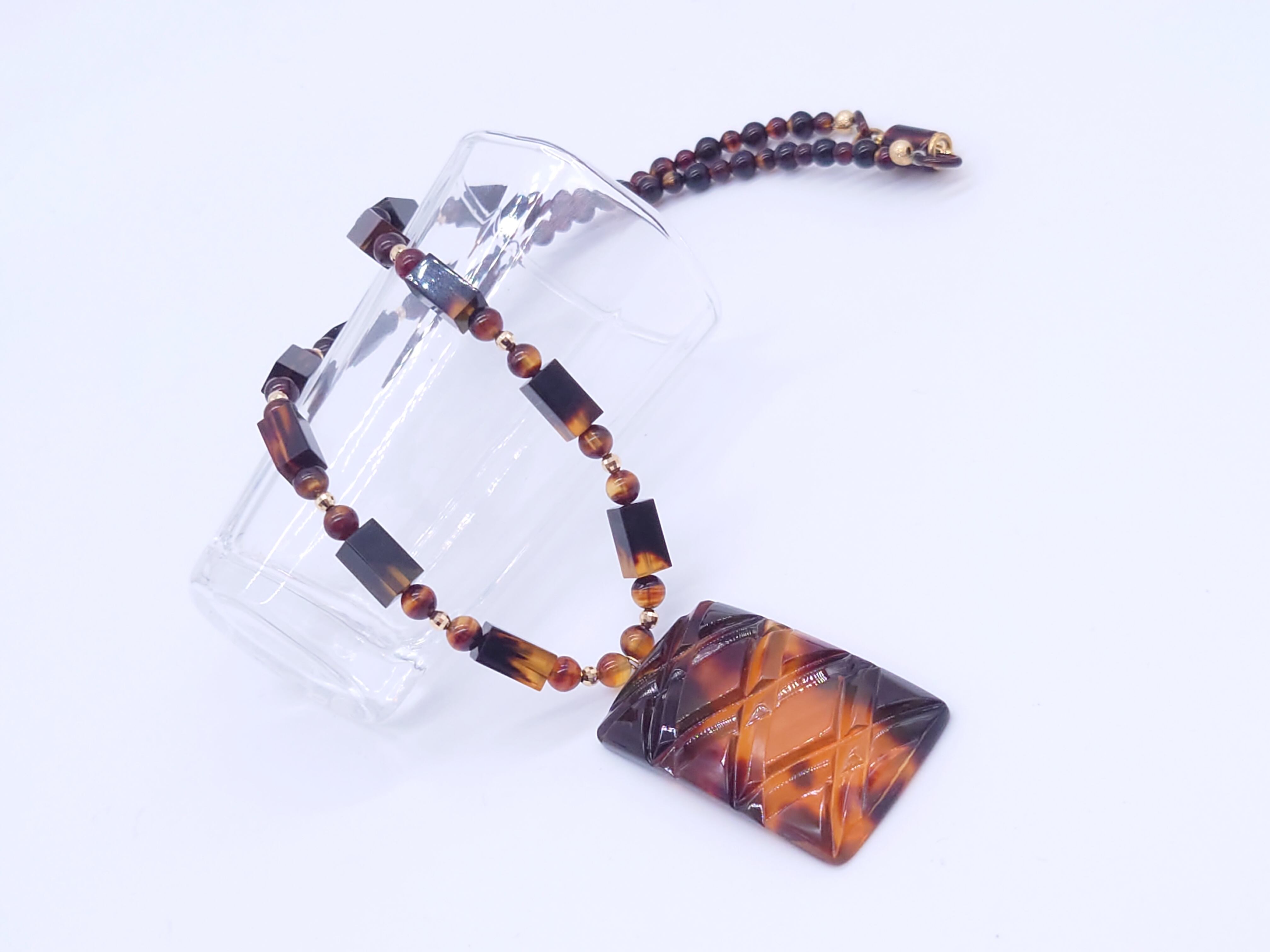 トップには厚手のバラフを使用し、シャープな深彫りを施されています。ネックレス部分は丸玉で繋げ、ポイントには贅沢に12ケの四角べっ甲パーツでアクセントを付けています。またキラキラとk18のミラーボールを使いエレガントな雰囲気を作っています。留具にはべっ甲マグネットを使用している為、取り外しが楽ちん!べっ甲らしく上品な一品ですのでフォーマルな場面で活躍すること間違い無しです!また大切な方へのプレゼントとしても最適なので、この機会に是非お買い求め下さい。 ※べっ甲及び琥珀等の天然素材はすべて本物です。