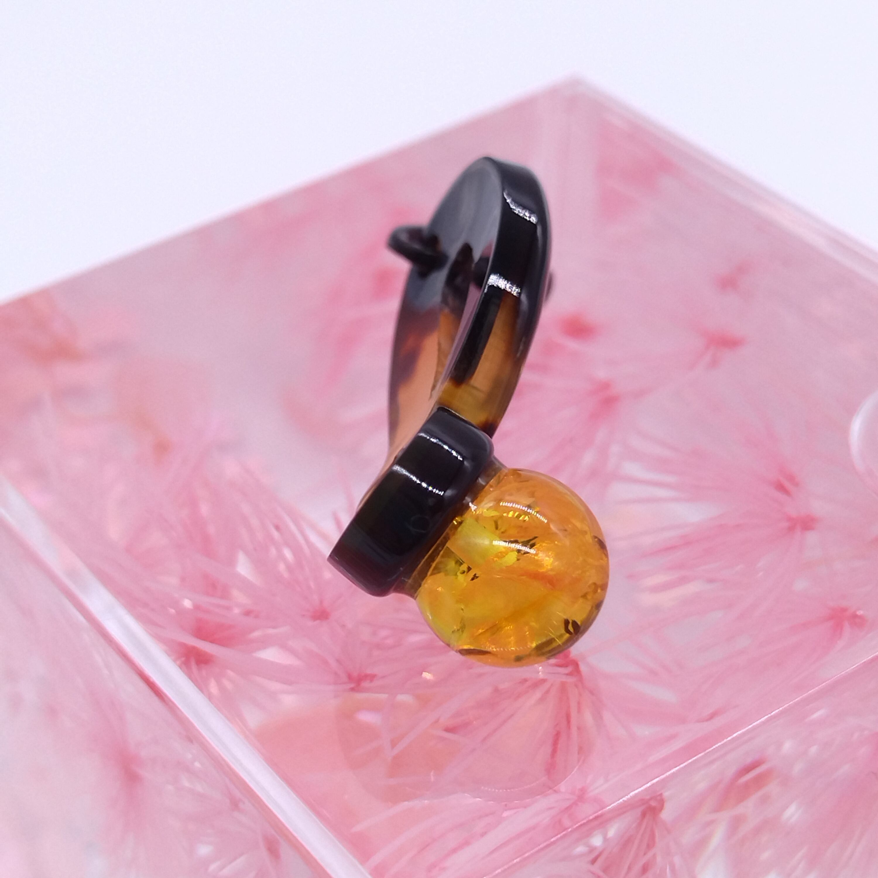 音符の丸部分はぷっくりと膨れ上がり、黄色い琥珀を装飾しました。そのためべっ甲特有のシックなツヤ感だけではなく、華やかさもプラス。
