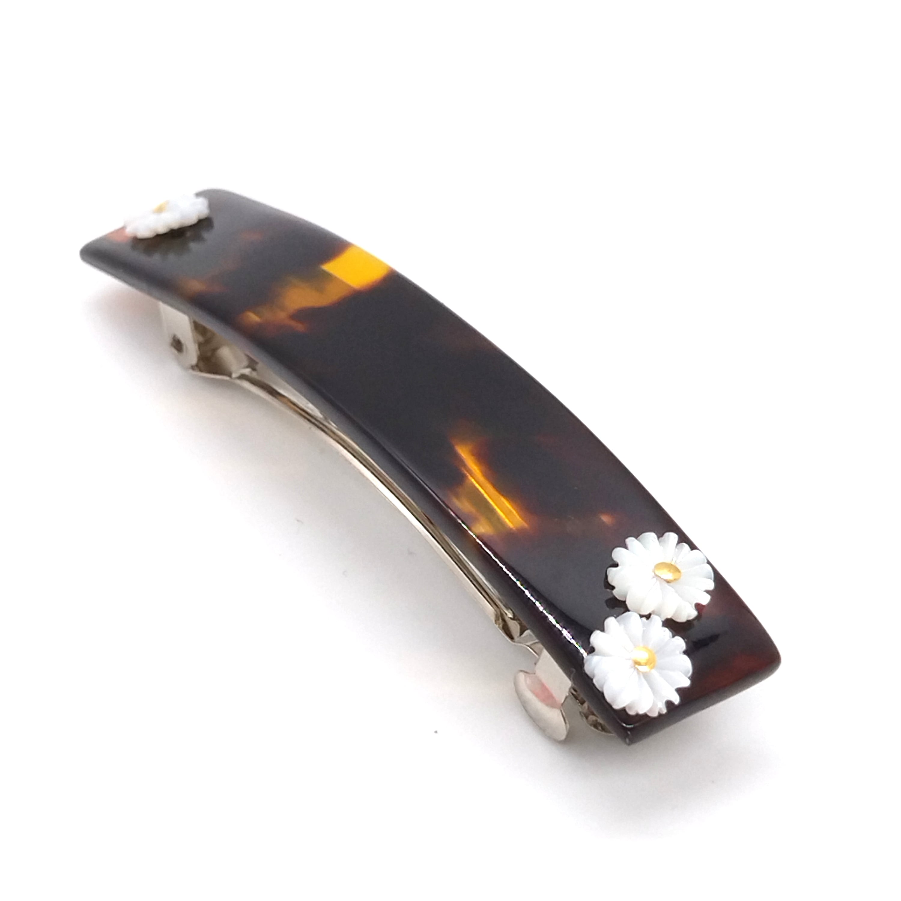 べっ甲に花びらが多めの白い小花を装飾させた、大人可愛いバレッタ。