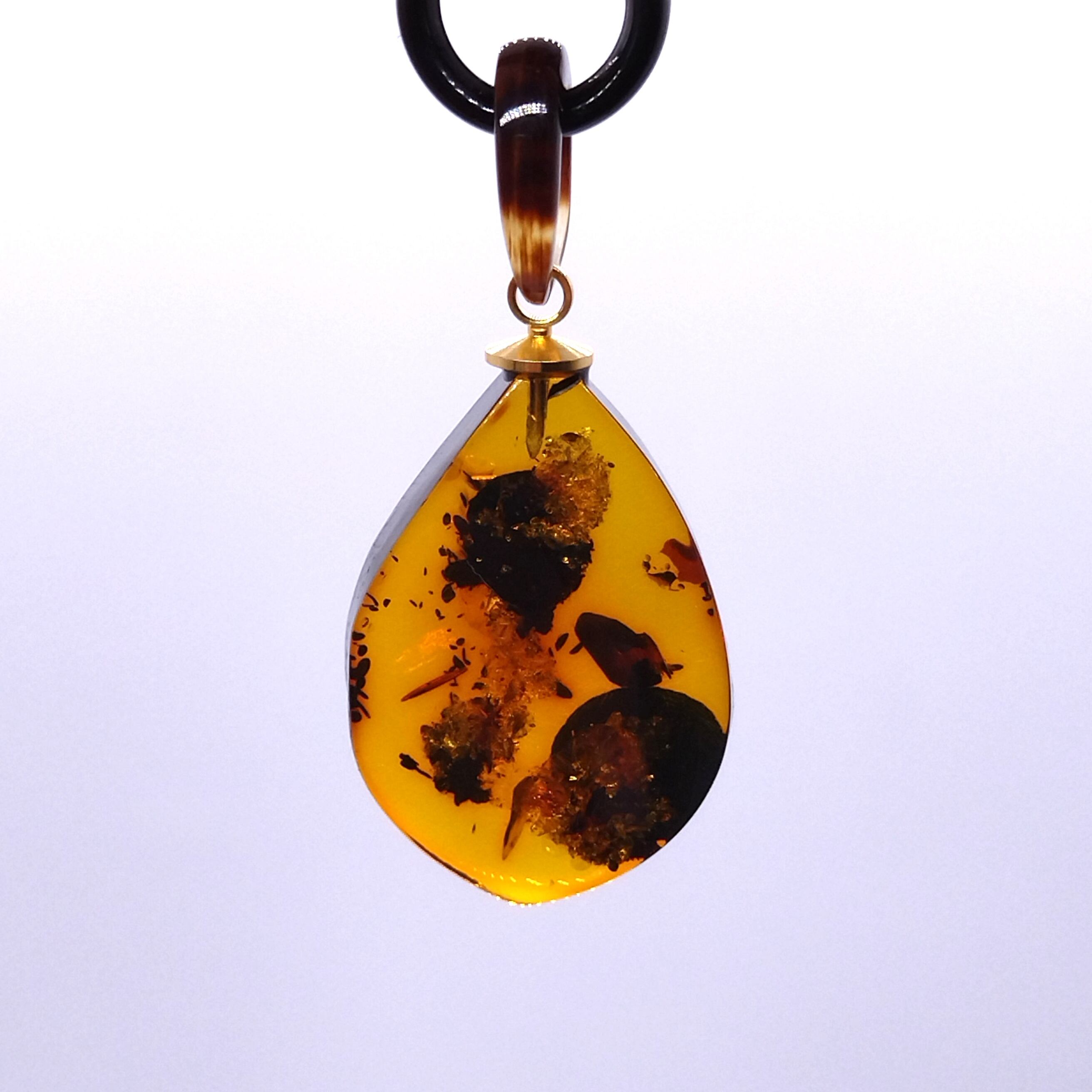 センターパーツは本琥珀のコニャックアンバーを使用しインクルージョン(内包物)があるため、より立体感を演出。
