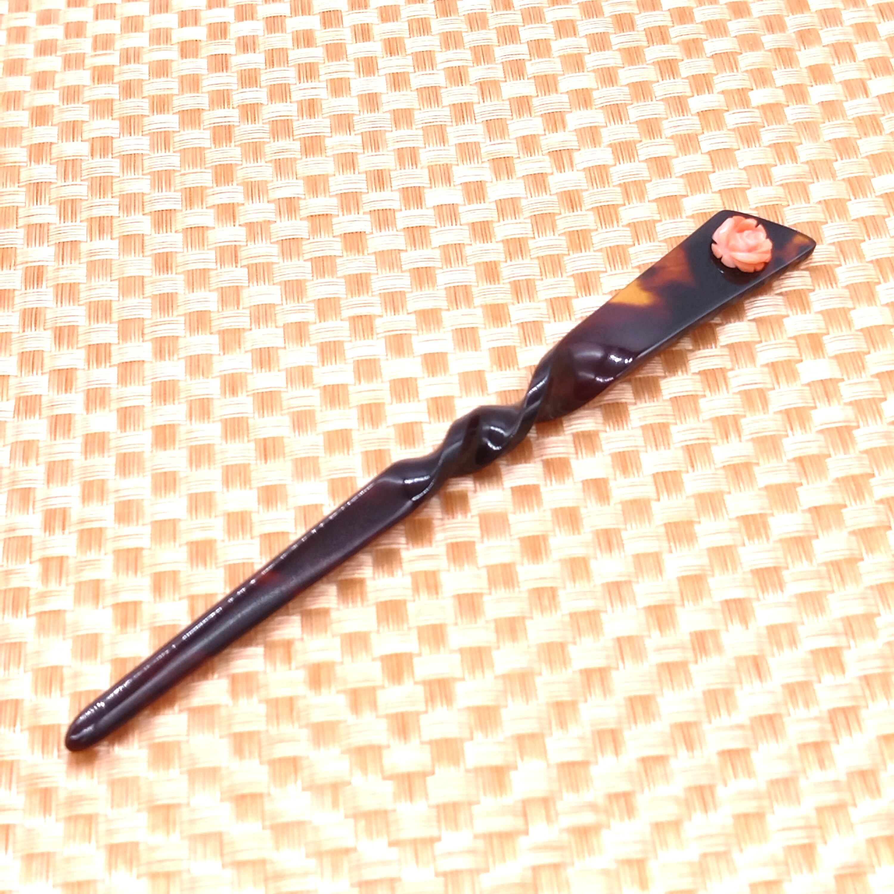 こちらはべっ甲かんざしを一部ねじり、珊瑚バラ彫を装飾。シンプルながらもお洒落なデザインに仕上げました。