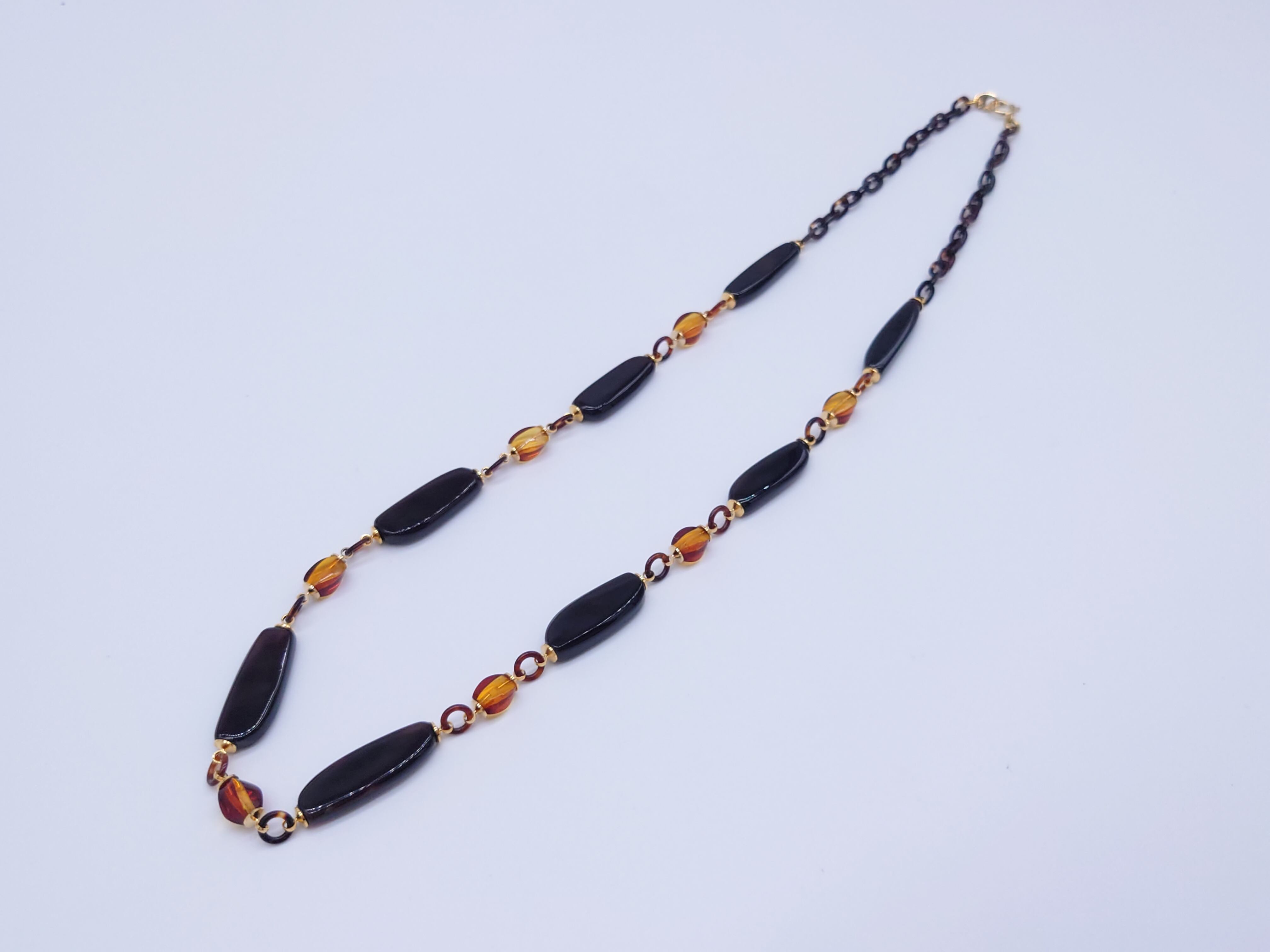 ●説明 本べっ甲 バラフ(背甲)使用 本琥珀使用 べっ甲、コハクコンビステーションネックレス。黒をベースにしたべっ甲と落ち着いた色目のツーカラー琥珀を使用したベーシックなモダンデザインのお洒落なロングネックレス。若い方からご年配の方まで幅広くご使用いただける用途の高いマルチなステーションネックレスです。ブラックとイエローの配色が上品に輝き大人の魅力を演出してくれる一品です。落ち着いたシチュエーションの薄明りなスペースでの輝きはより一層素敵にその場の雰囲気を演出してくれます。大切な方へのプレゼントにも最適ですので是非贈り物などにもご購入下さい。ロングネックレスではイチオシのお品となっております。商品はこちらの梱包にて大切に発送致します。天然素材の為、色目やサイズ感は多少異なる場合がございます